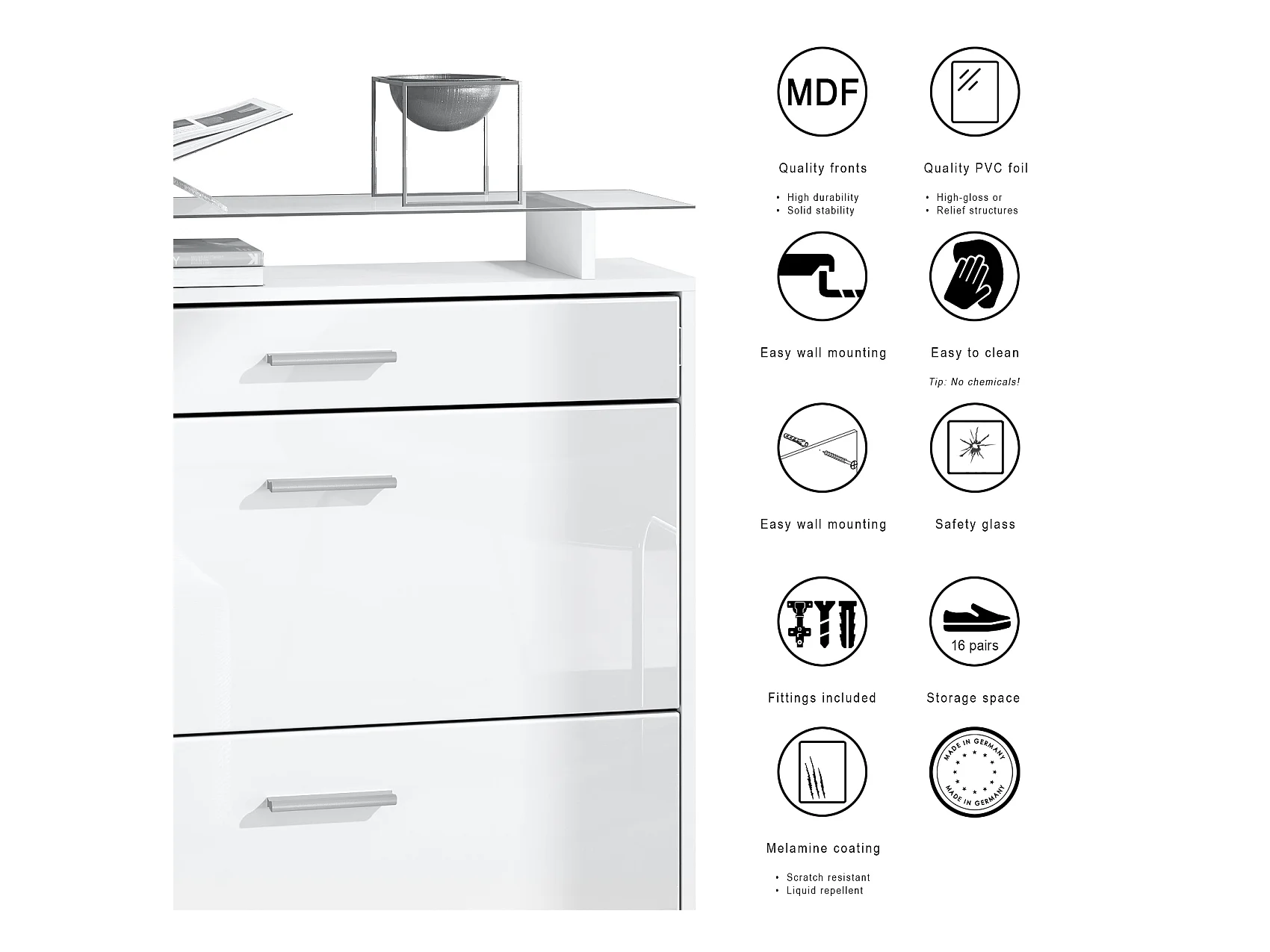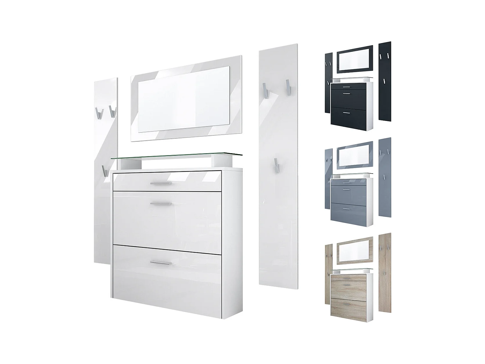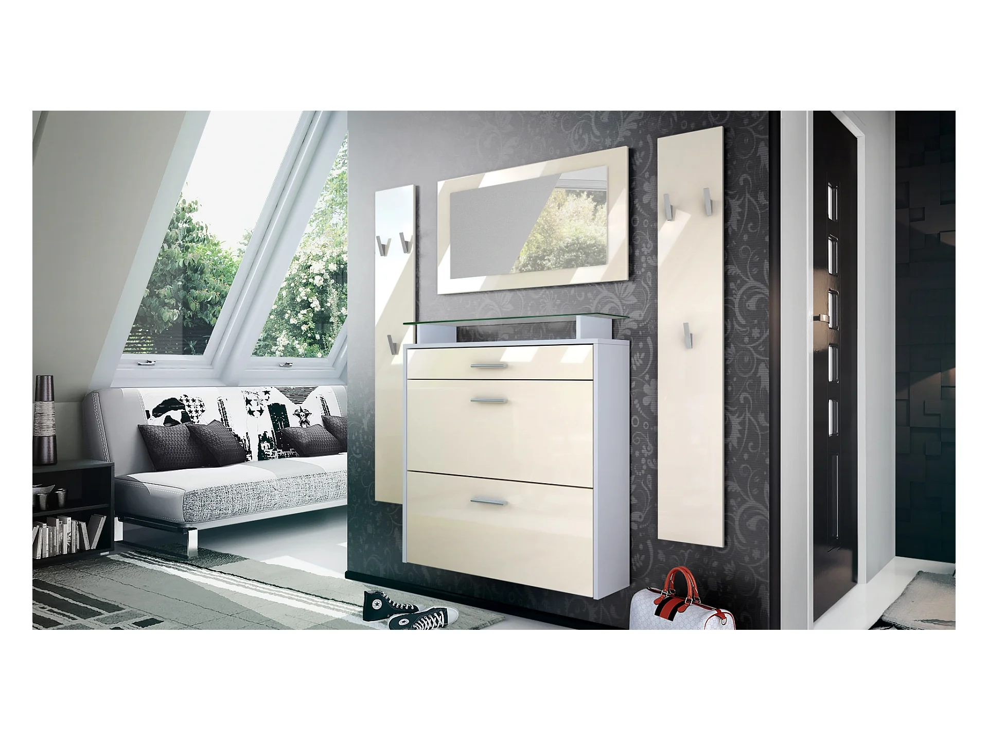 Penderie Malea, Meuble d’entrée comprenant 1 commode à chaussures murale, 1 miroir mural et 2 panneaux porte-manteaux, Blanc mat/Crème haute brillance