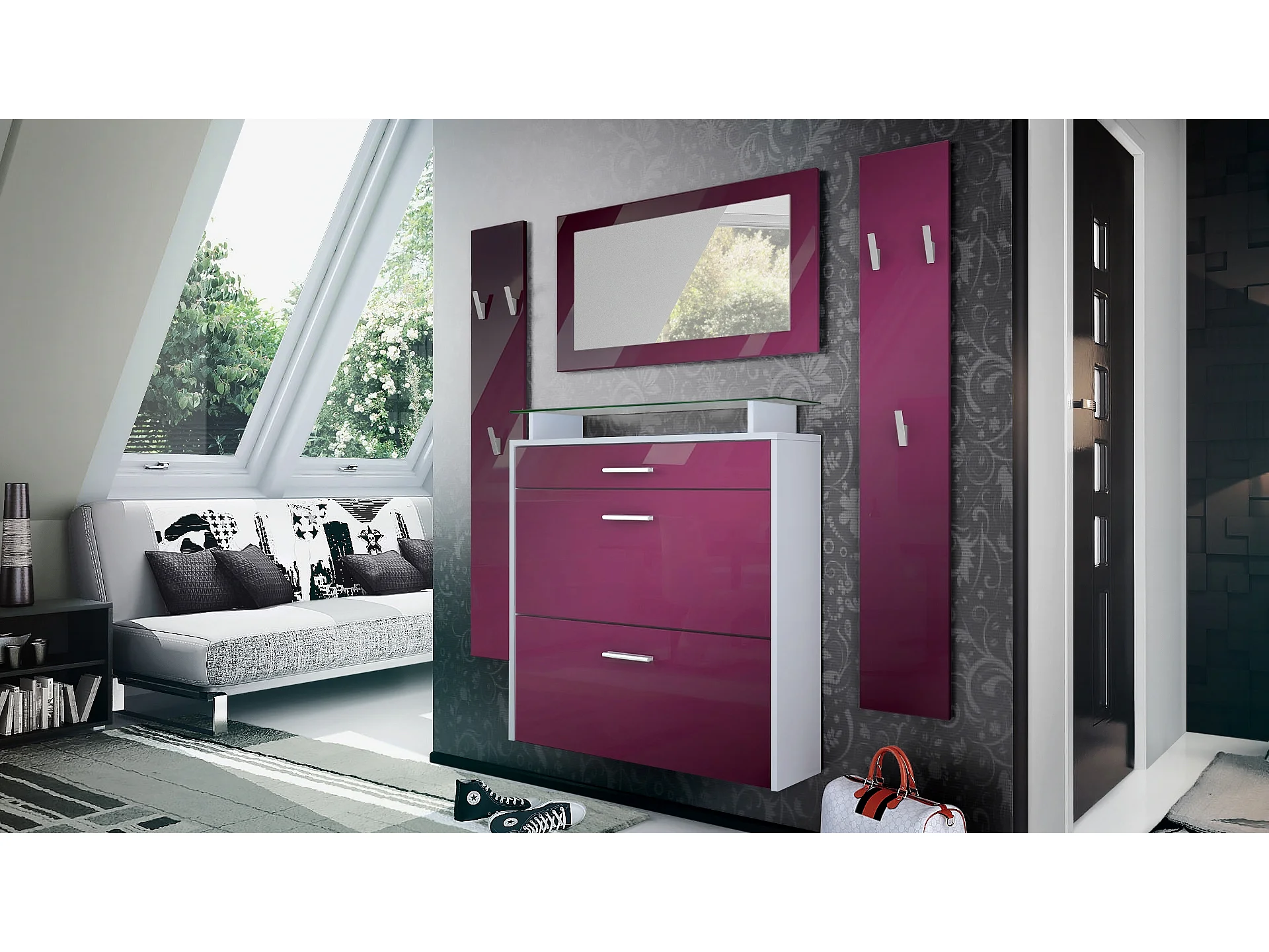 Penderie Malea, Meuble d’entrée comprenant 1 commode à chaussures murale, 1 miroir mural et 2 panneaux porte-manteaux, Blanc mat/Mûre haute brillance