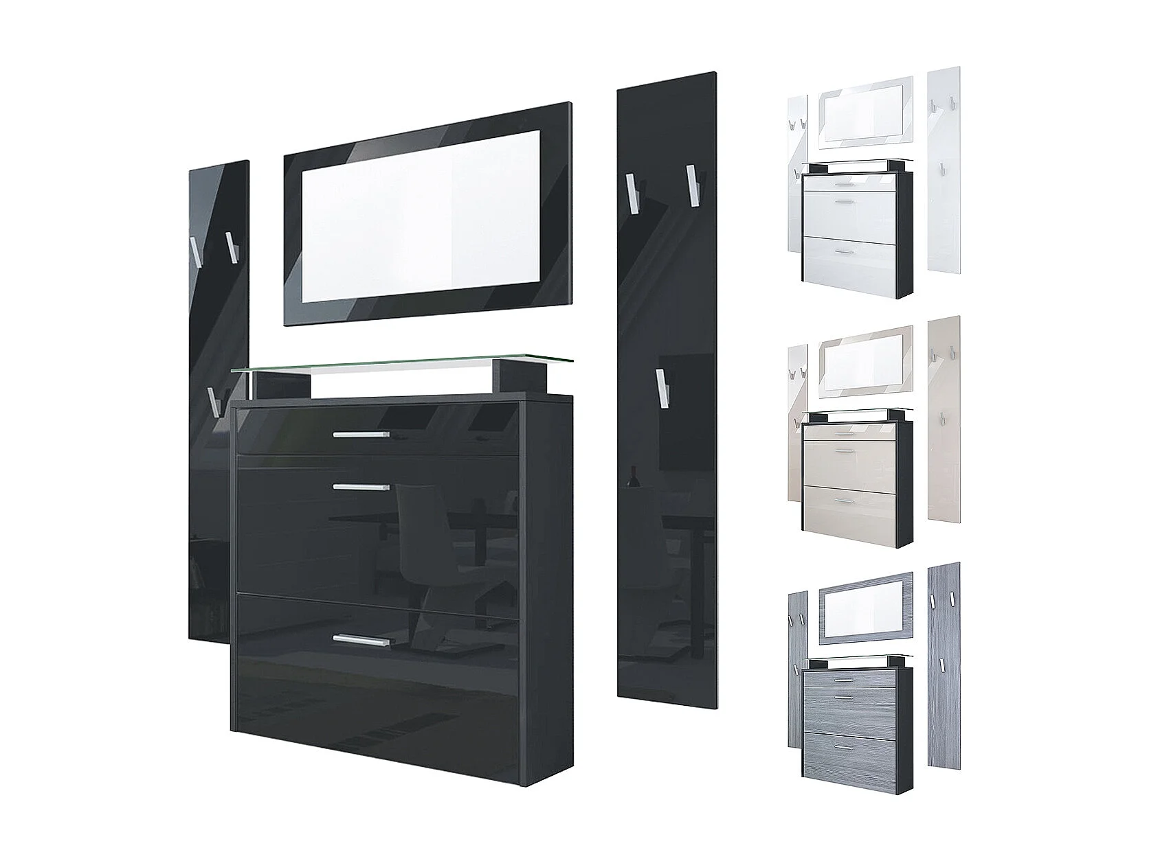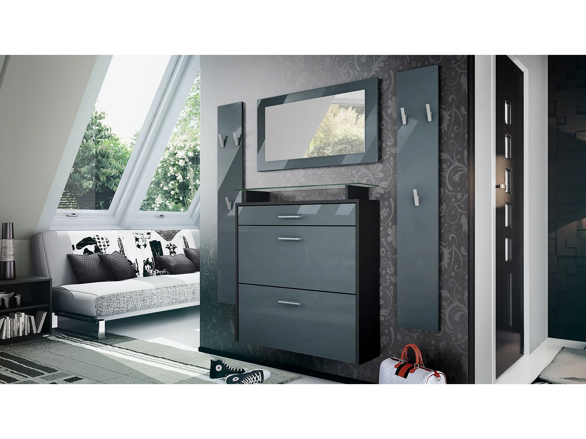 Penderie Malea, Meuble d’entrée comprenant 1 commode à chaussures murale, 1 miroir mural et 2 panneaux porte-manteaux, Noir mat/Gris haute brillance