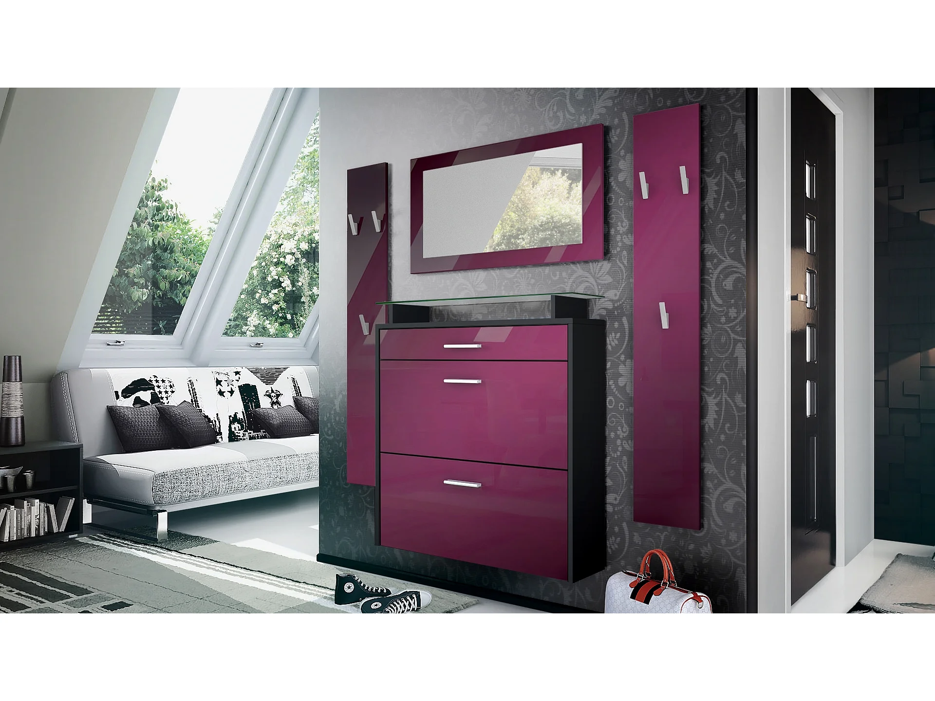 Penderie Malea, Meuble d’entrée comprenant 1 commode à chaussures murale, 1 miroir mural et 2 panneaux porte-manteaux, Noir mat/Mûre haute brillance