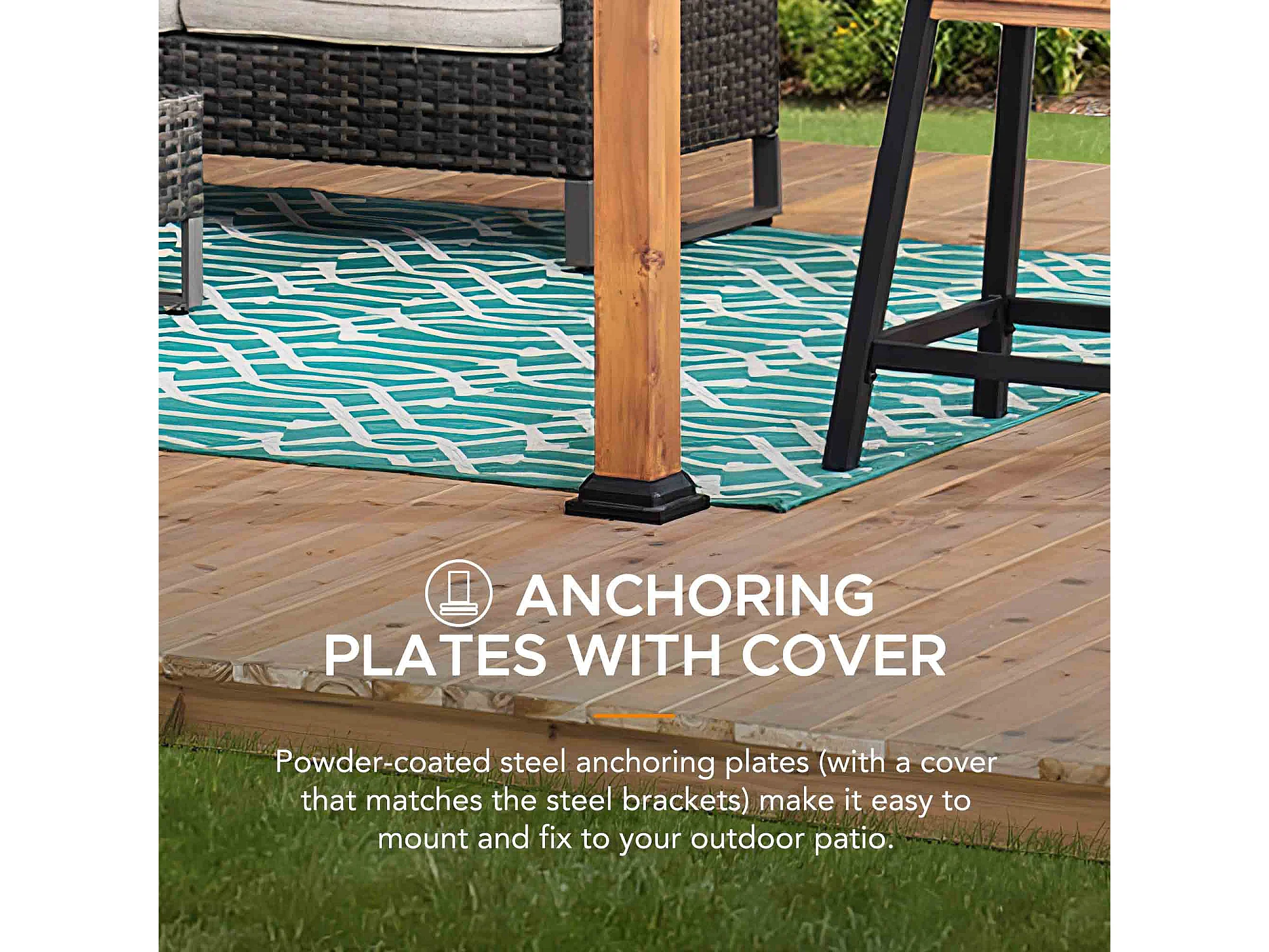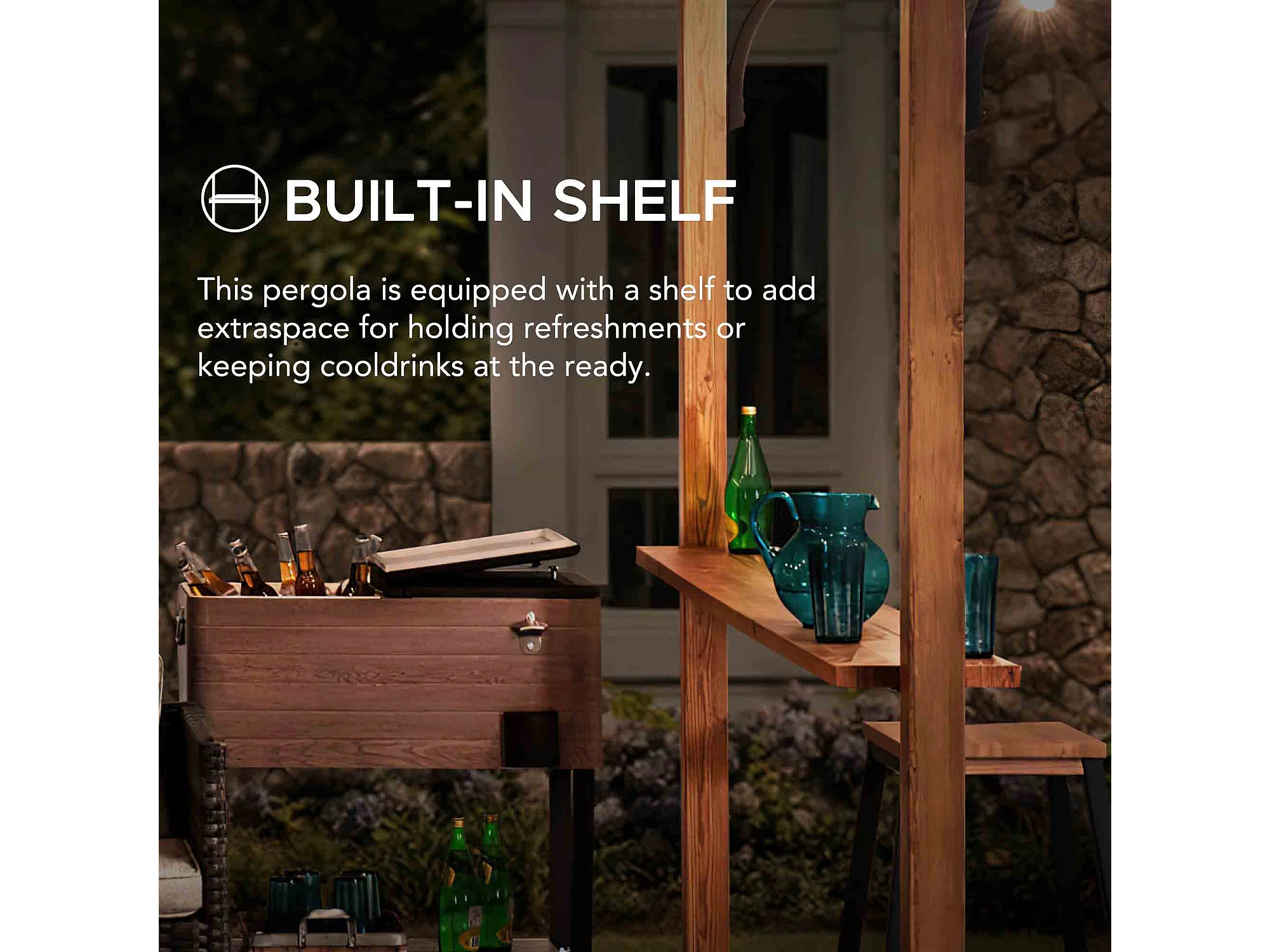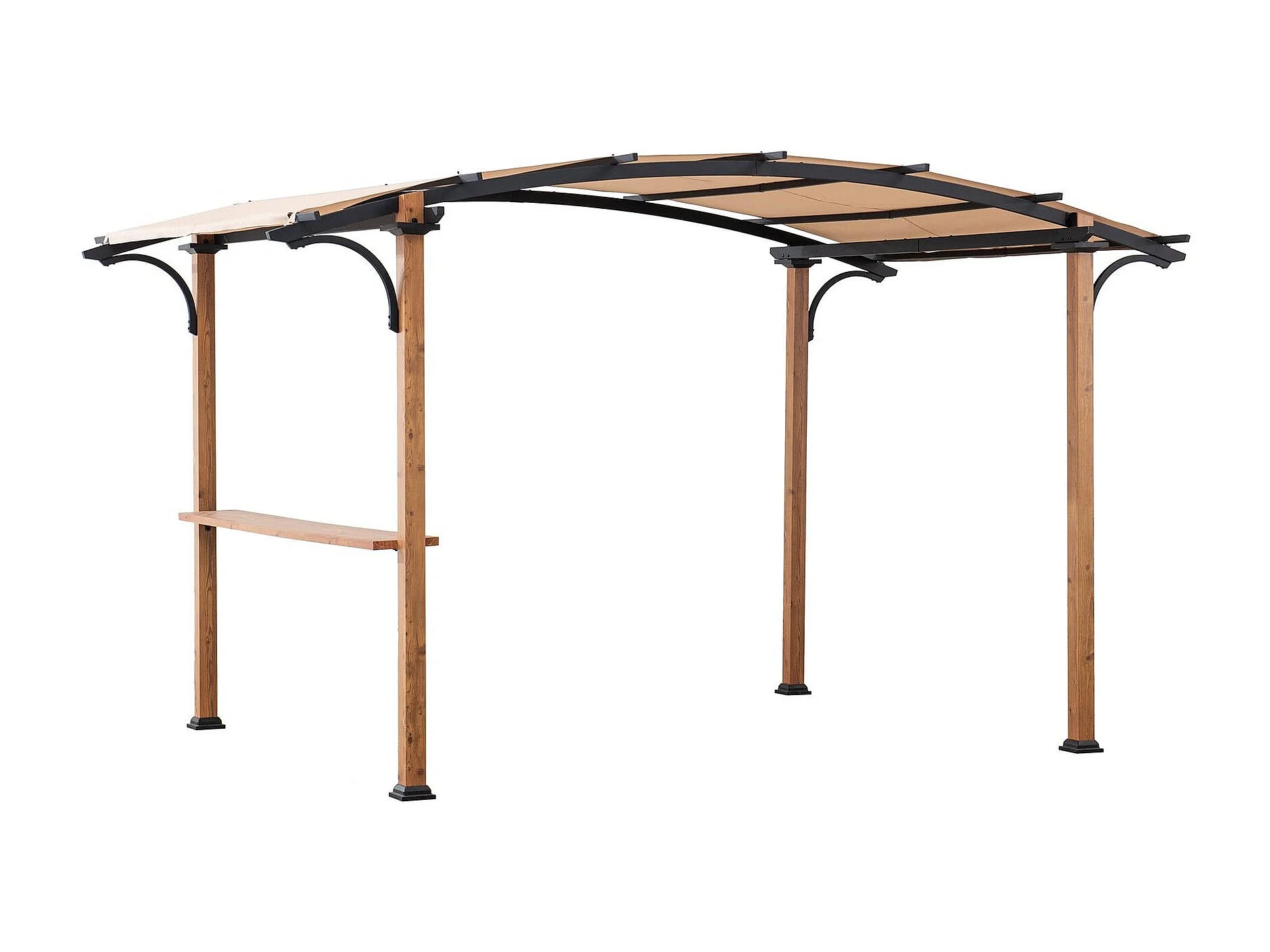 Pergola arquée en acier avec finition aspect bois naturel et abat-jour beige SKUTA 259 cm x 406 cm