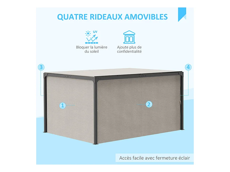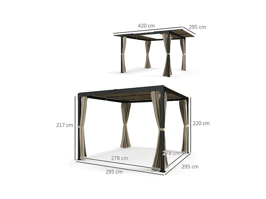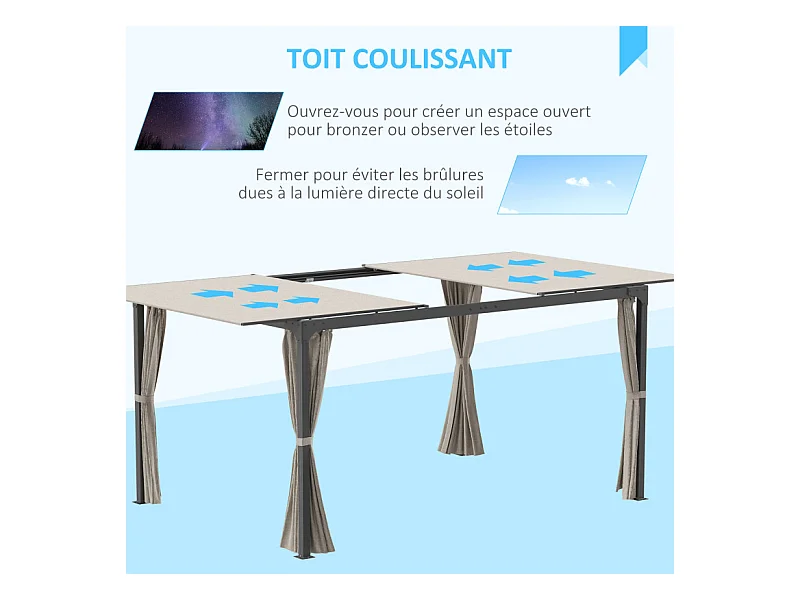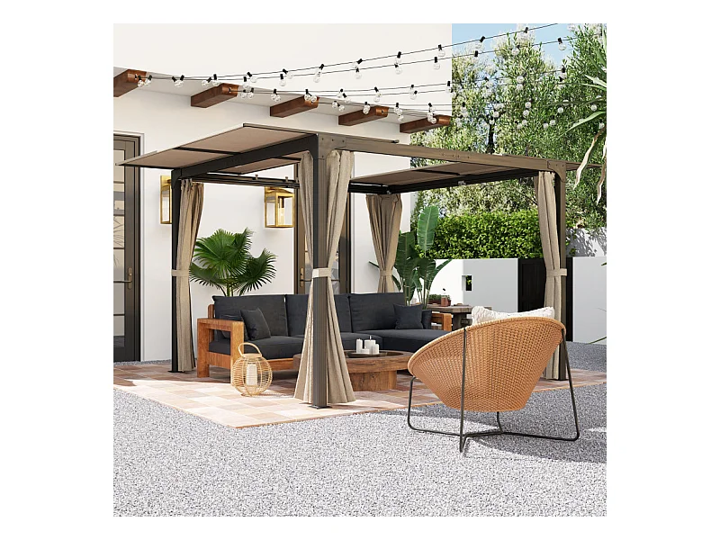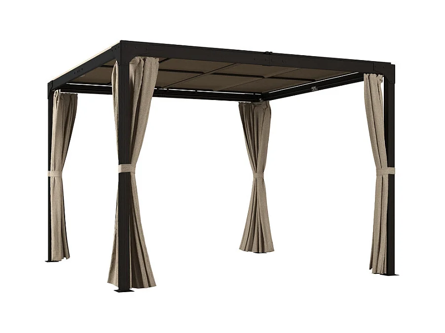 Pergola rétractable double toit et rideaux MIA beige et noire