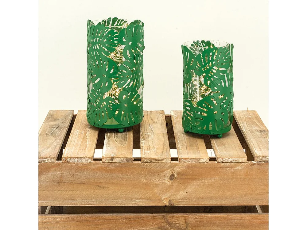 Photophores ronds verts feuilles tropicales métal (Lot de 2)