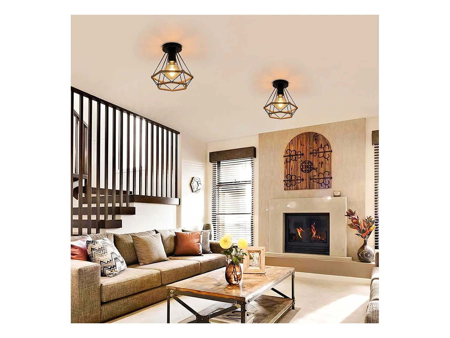 Plafonnier industriel rétro en métal avec cage, abat-jour en corde de chanvre, idéal pour une chambre, un café, un bar, un restaurant ou une cuisine