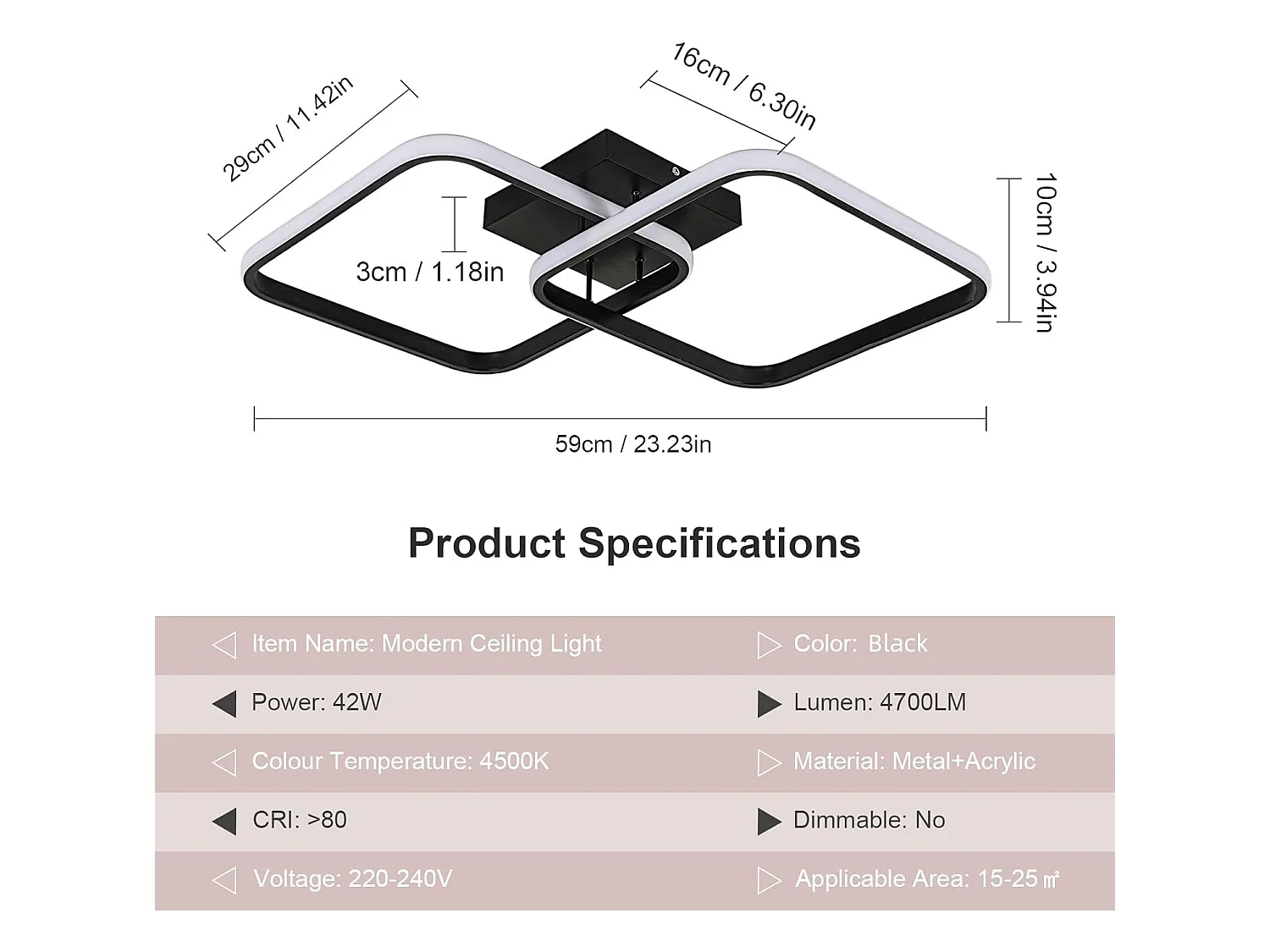 Plafonnier LED 42W 4725LM,Luminaire Plafonnier Carré Lumière Naturelle 4500K,Moderne Lampe de Plafond Acrylique pour Salon Chambre à Coucher,59cm,Noir