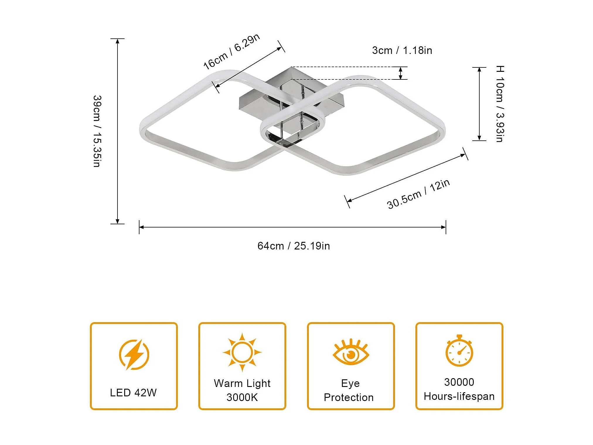 Plafonnier LED moderne 42 W 4 725 lm, couleur chaude 3 000 K, carré 64 cm en aluminium chromé pour salon, chambre et cuisine