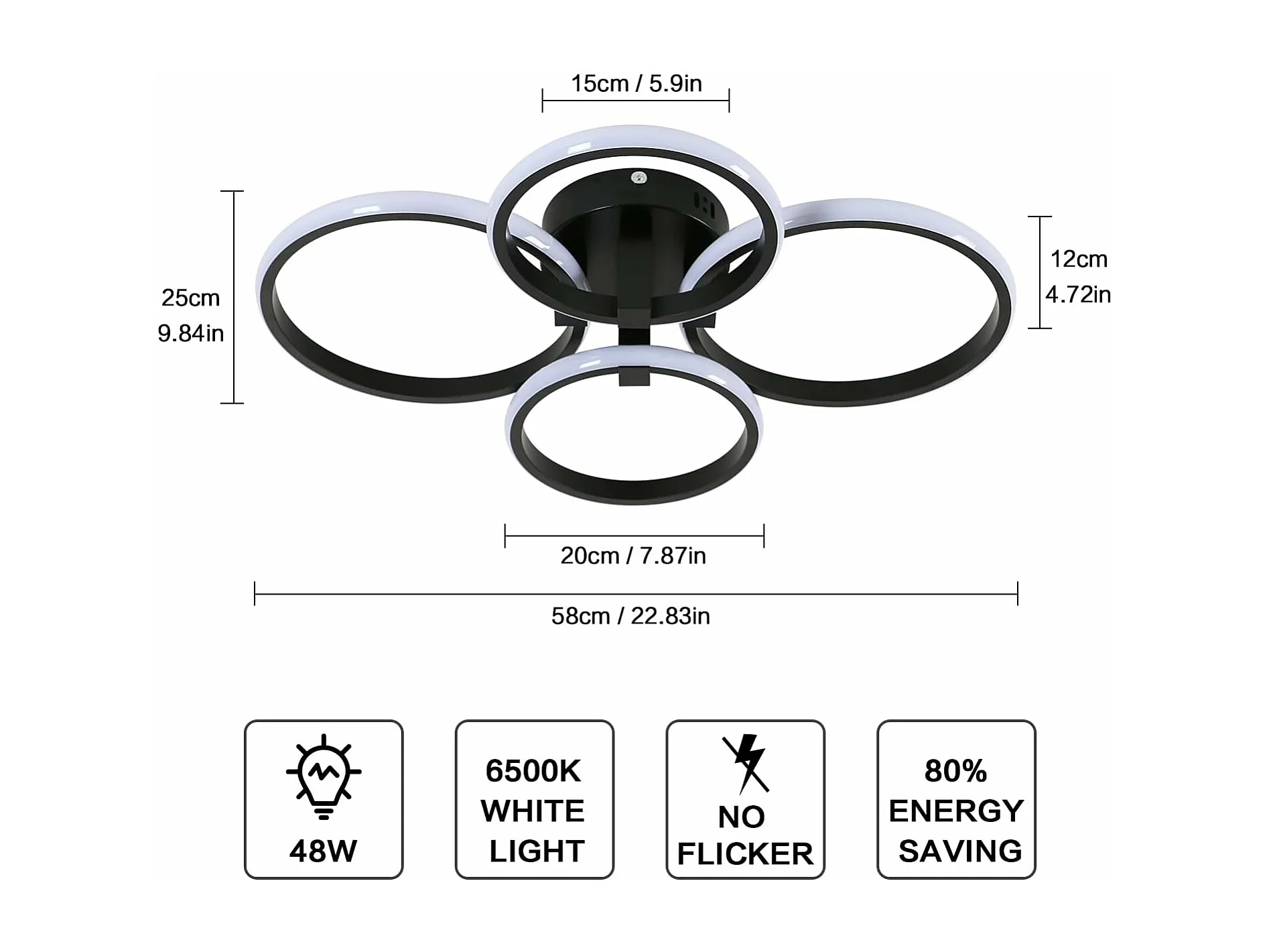 Plafonnier LED Moderne,48W 5400LM Lampe de Plafond Rond 4 Anneaux Design,Noir Acrylique Luminaire Plafonnier,Cuisine,Bureau,Lumière Froide 6500K