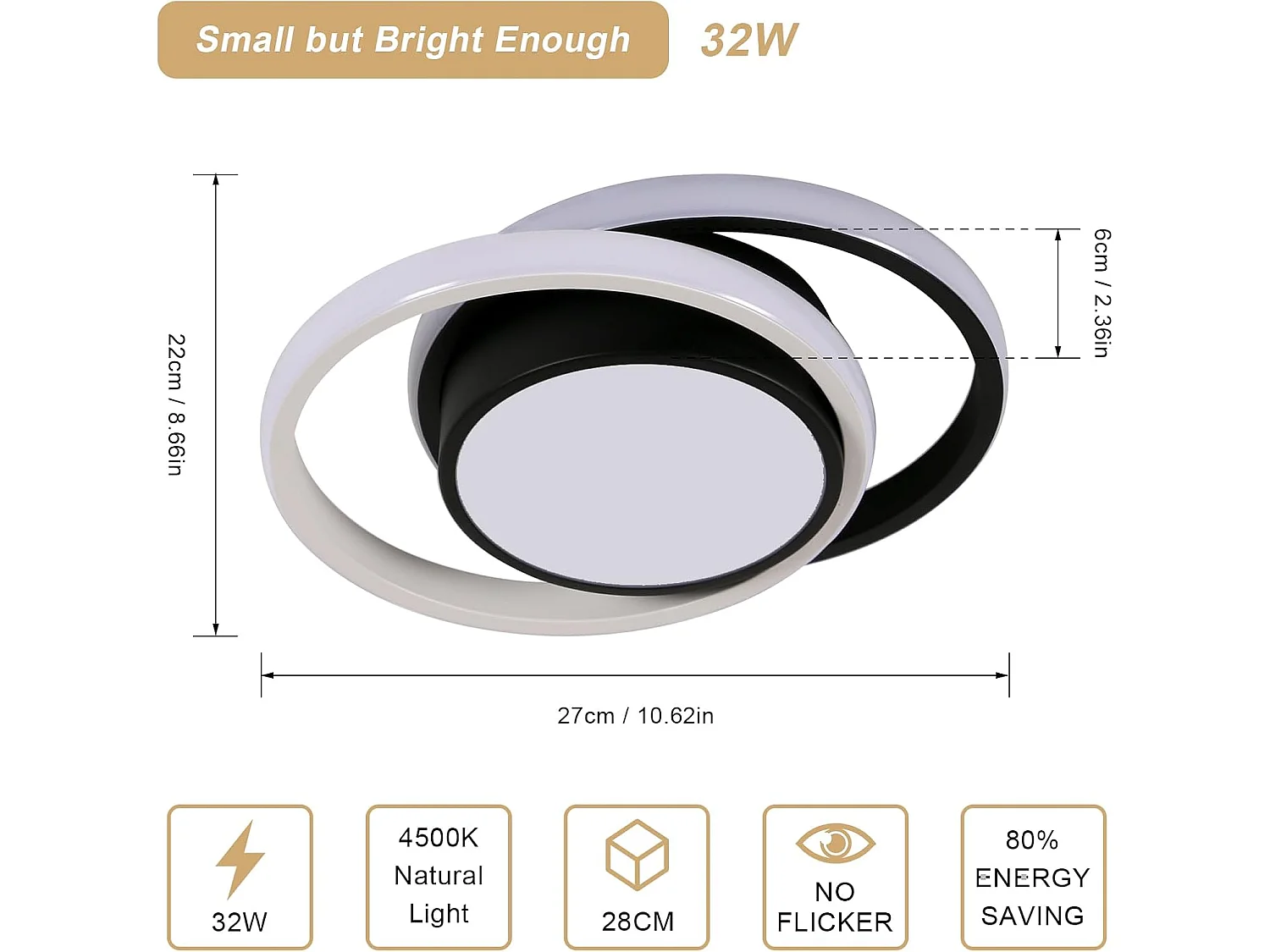 Plafonnier LED Rond Moderne 32W 3600LM - Noir 28cm pour Cuisine/Salle de Bain/Salon/Chambre - Lumière Naturelle 4500K