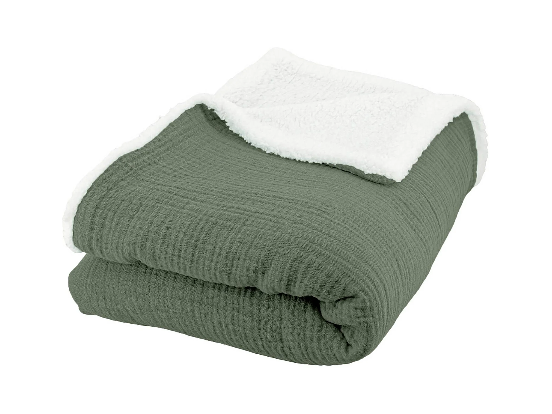 Plaid sherpa et gaze de coton 130 x 170 cm kaki. ALIX. bi-matière