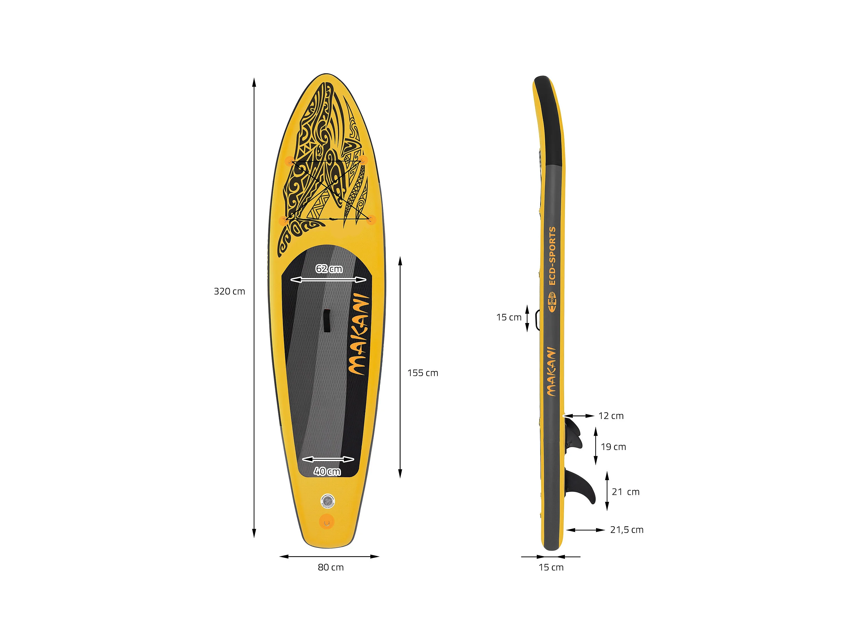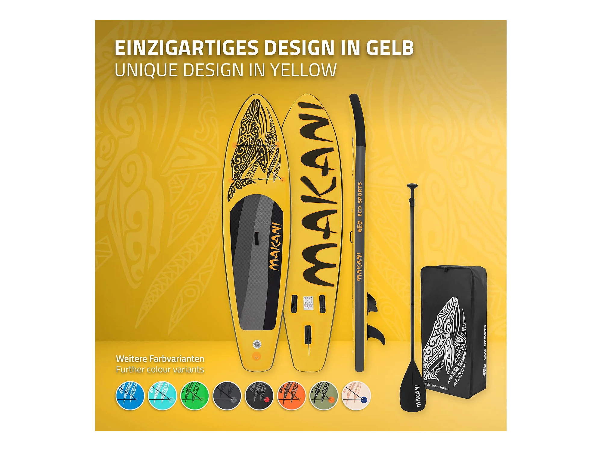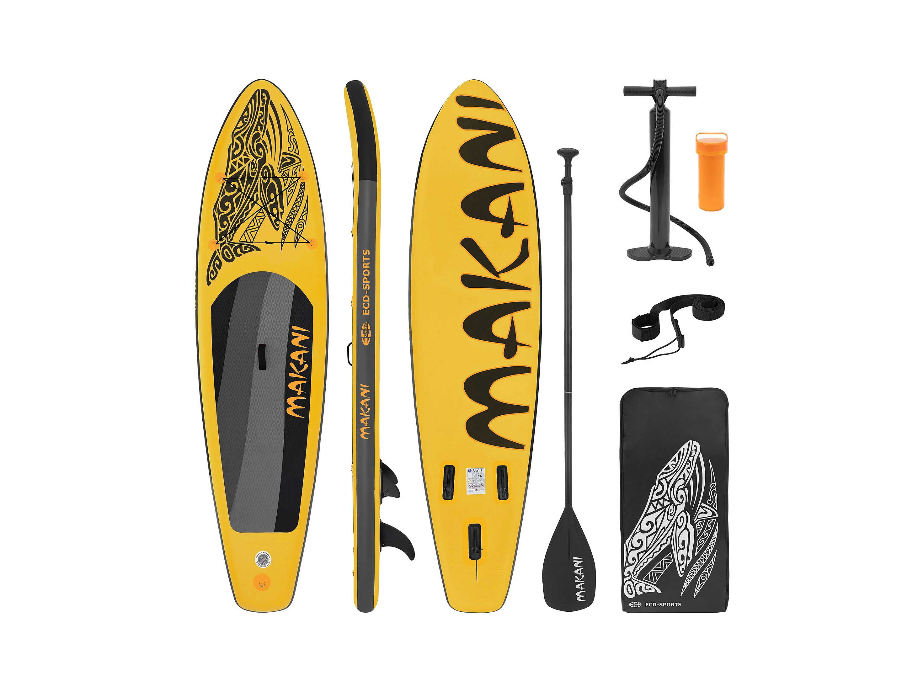 Planche stand up Makani 320x80x15 cm jaune PVC gonflable jusqu'à 120kg revêtement antidérapant avec pompe sac de transport kit de réparation pagaie