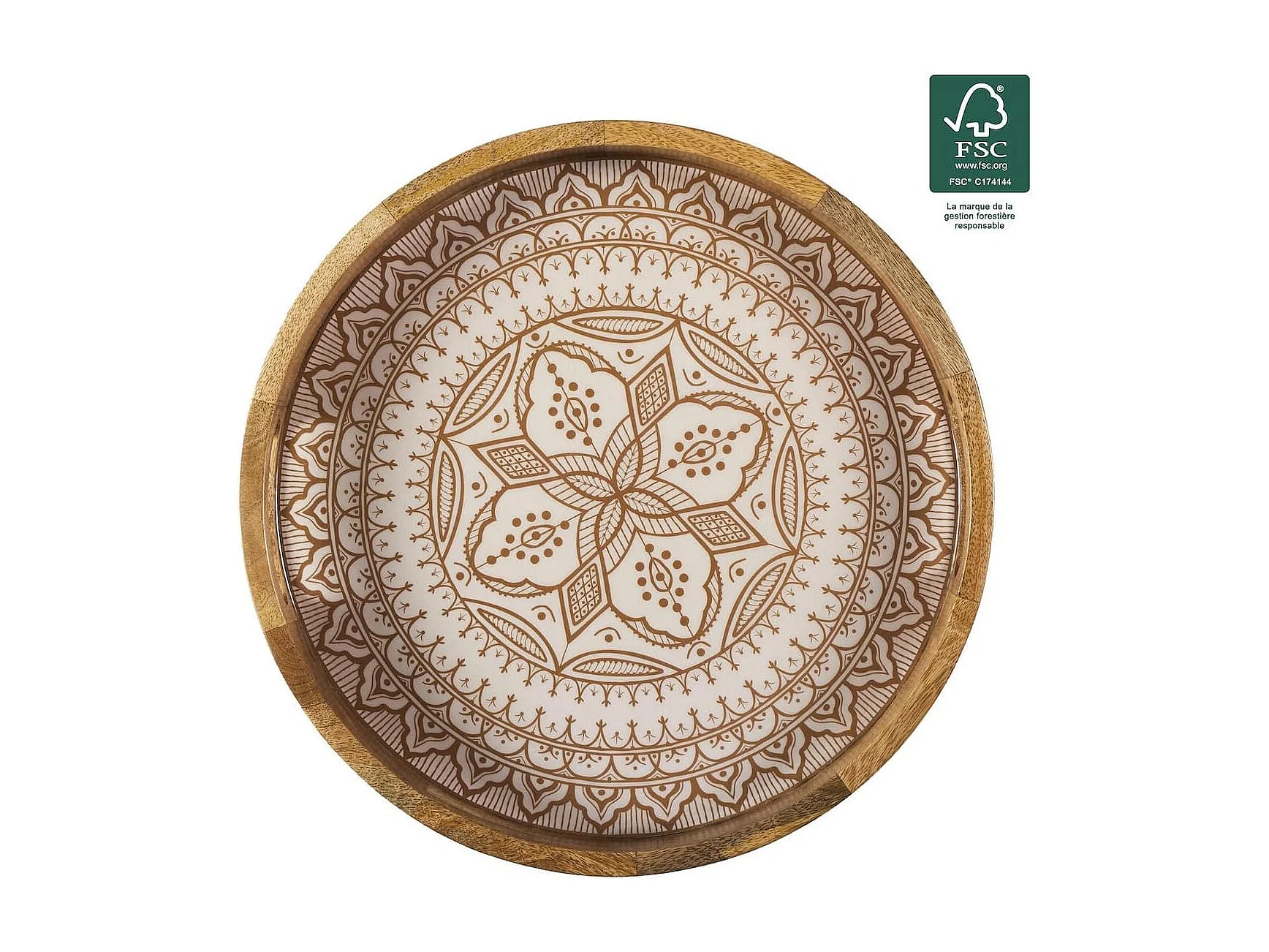 Plateau rond en bois de manguier avec motif mandala brun (Ø35cm) - MANGO