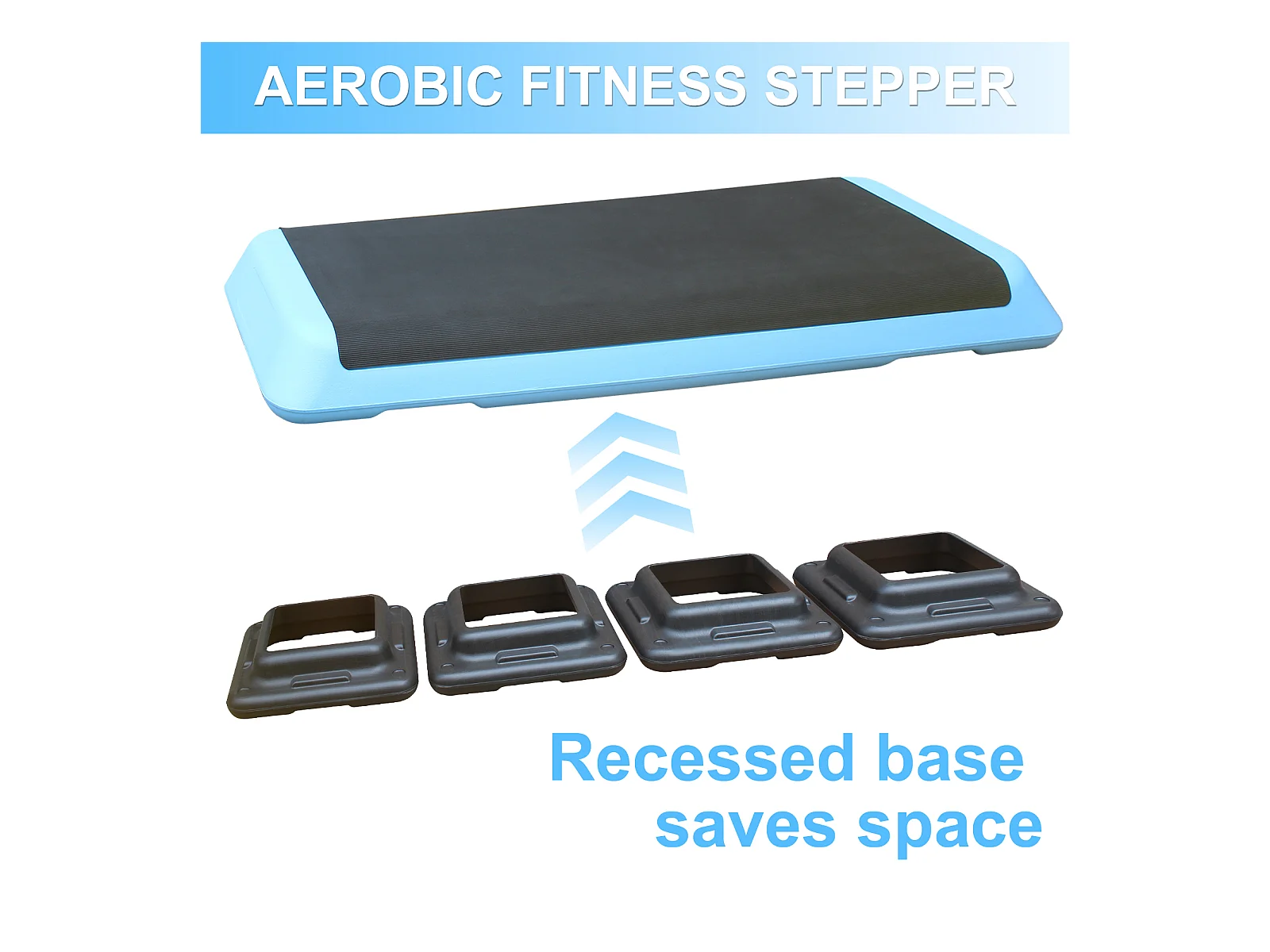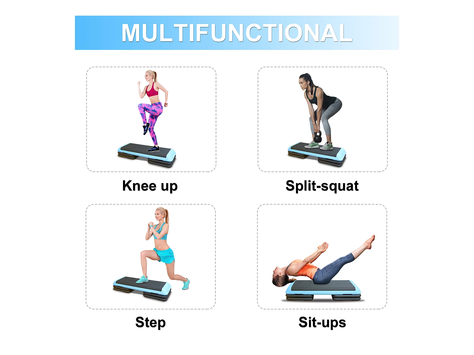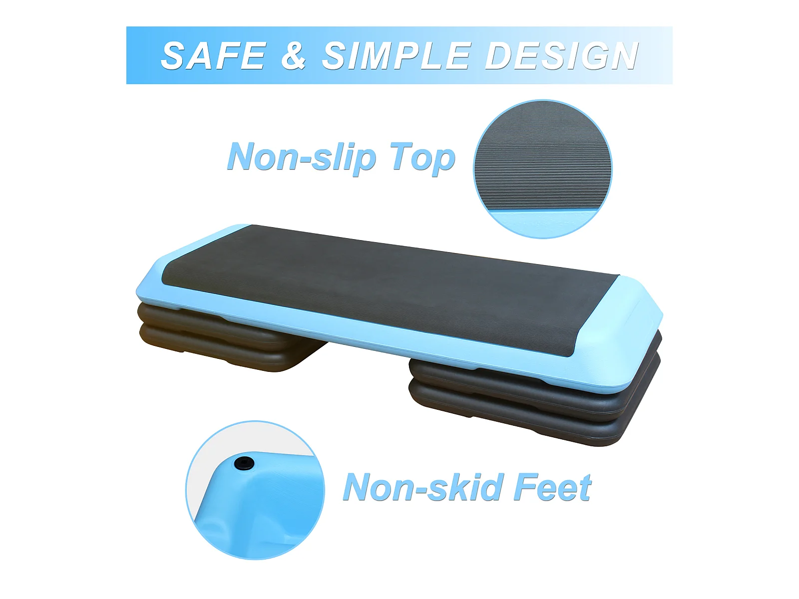 Step platforme d'exercice aérobique réglable, matériau polyéthylène antidérapant, bleu, avec repose-pieds (68.5x28x10 cm)
