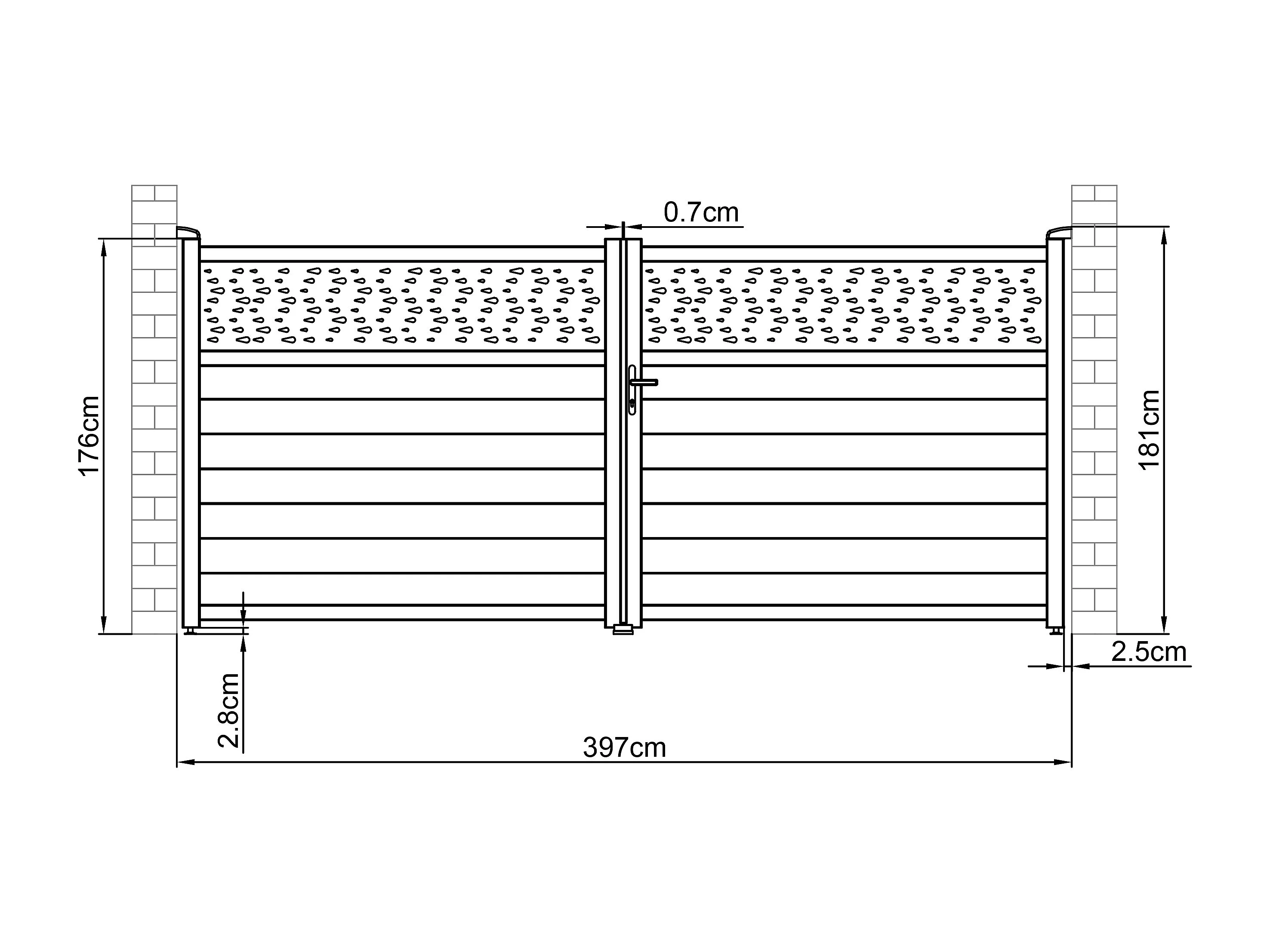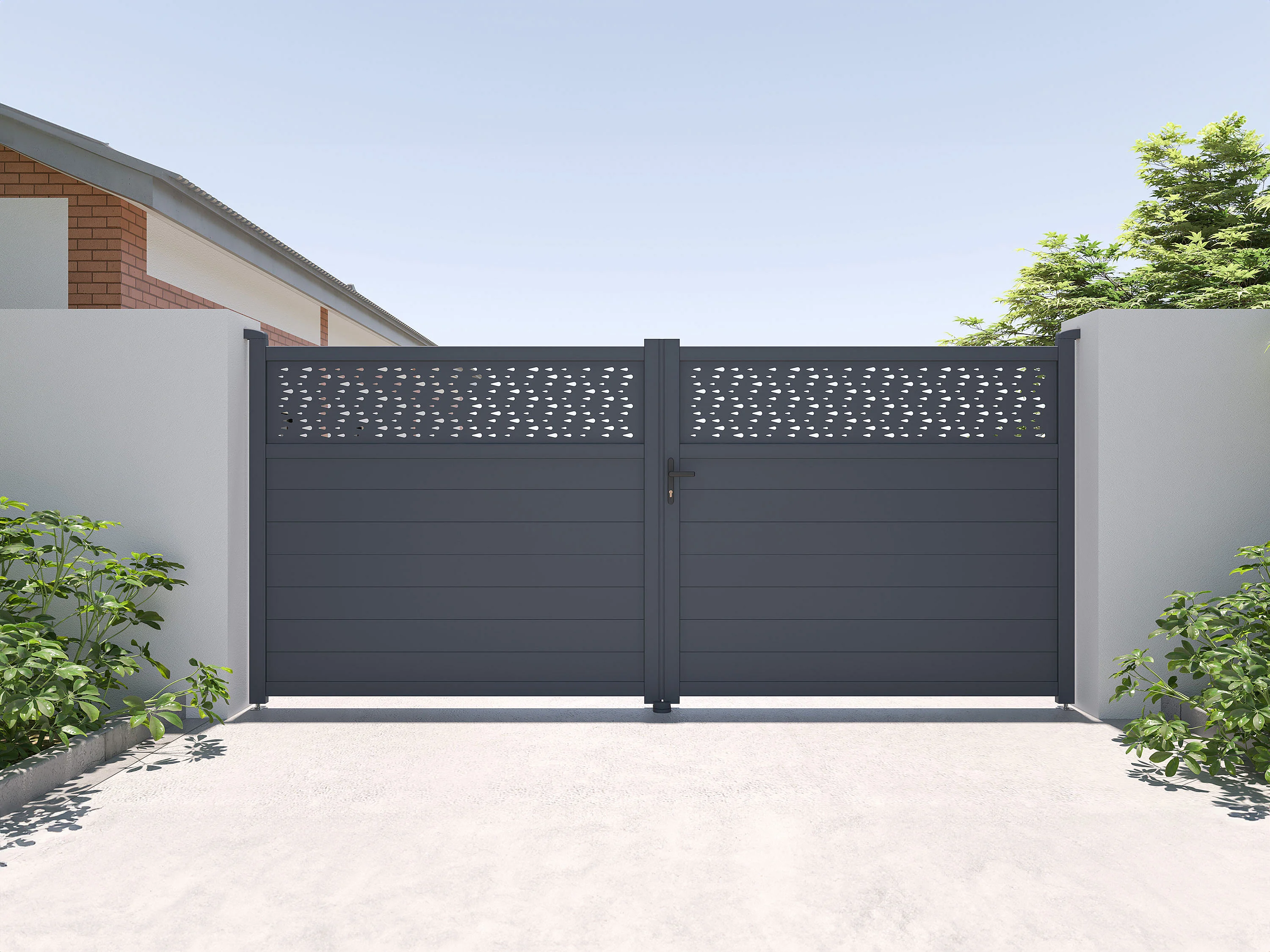 Portail battant aluminium semi plein à motifs L397 x H181 cm anthracite - BAZIO