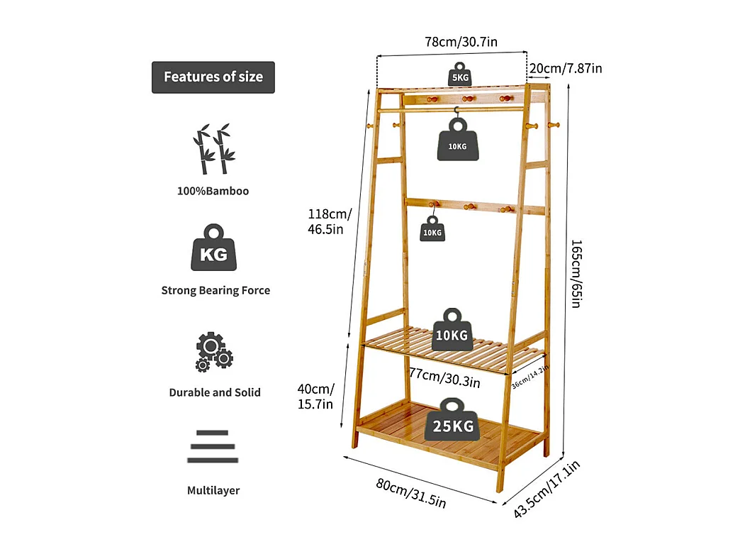 Portant à vêtement en bambou porte manteau solide sur pieds 53x31.5x168cm