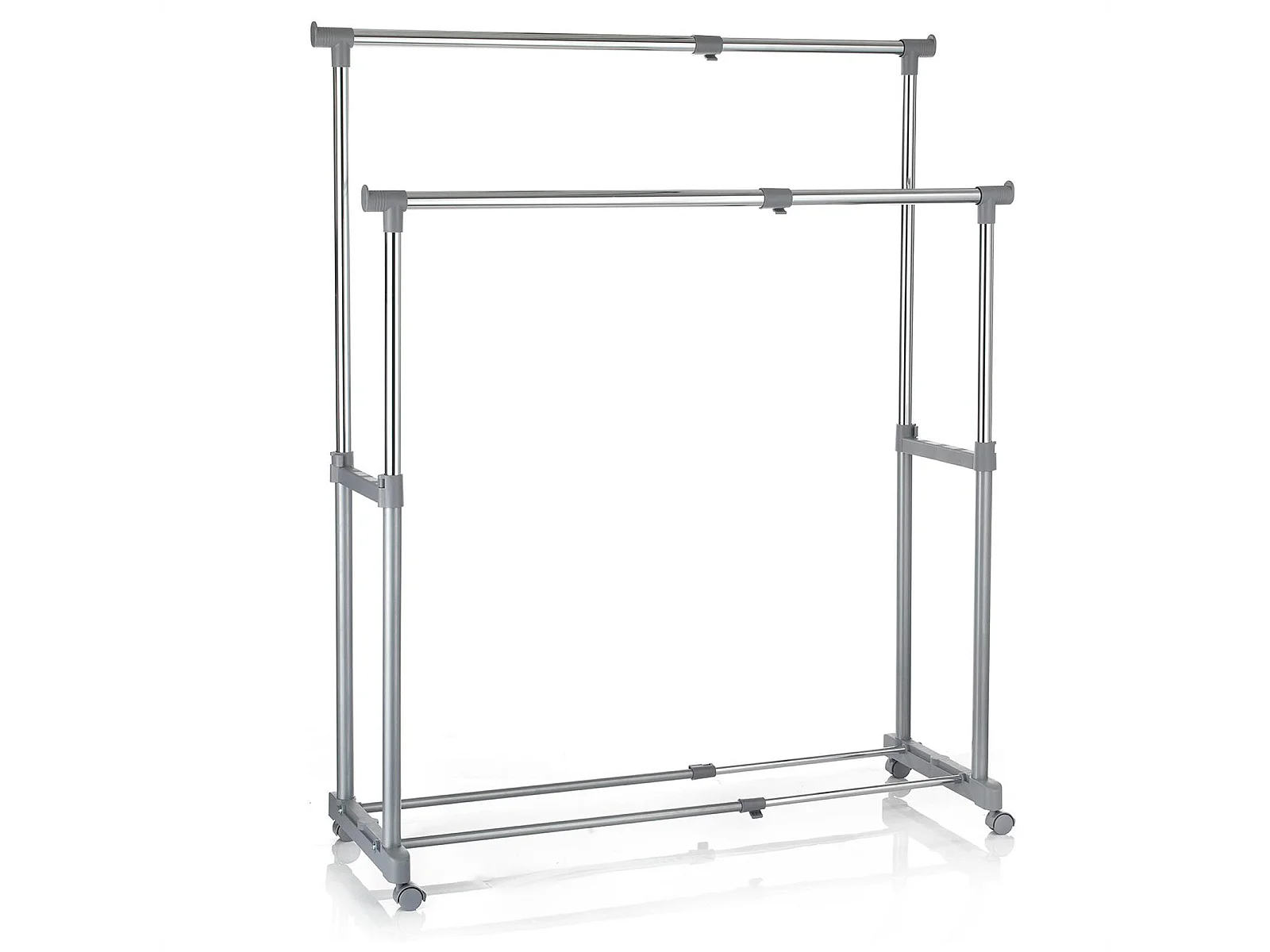 Portant à vêtements CASA en métal chromé et gris, penderie double sur roulettes avec 2 barres hauteur et longueur réglables