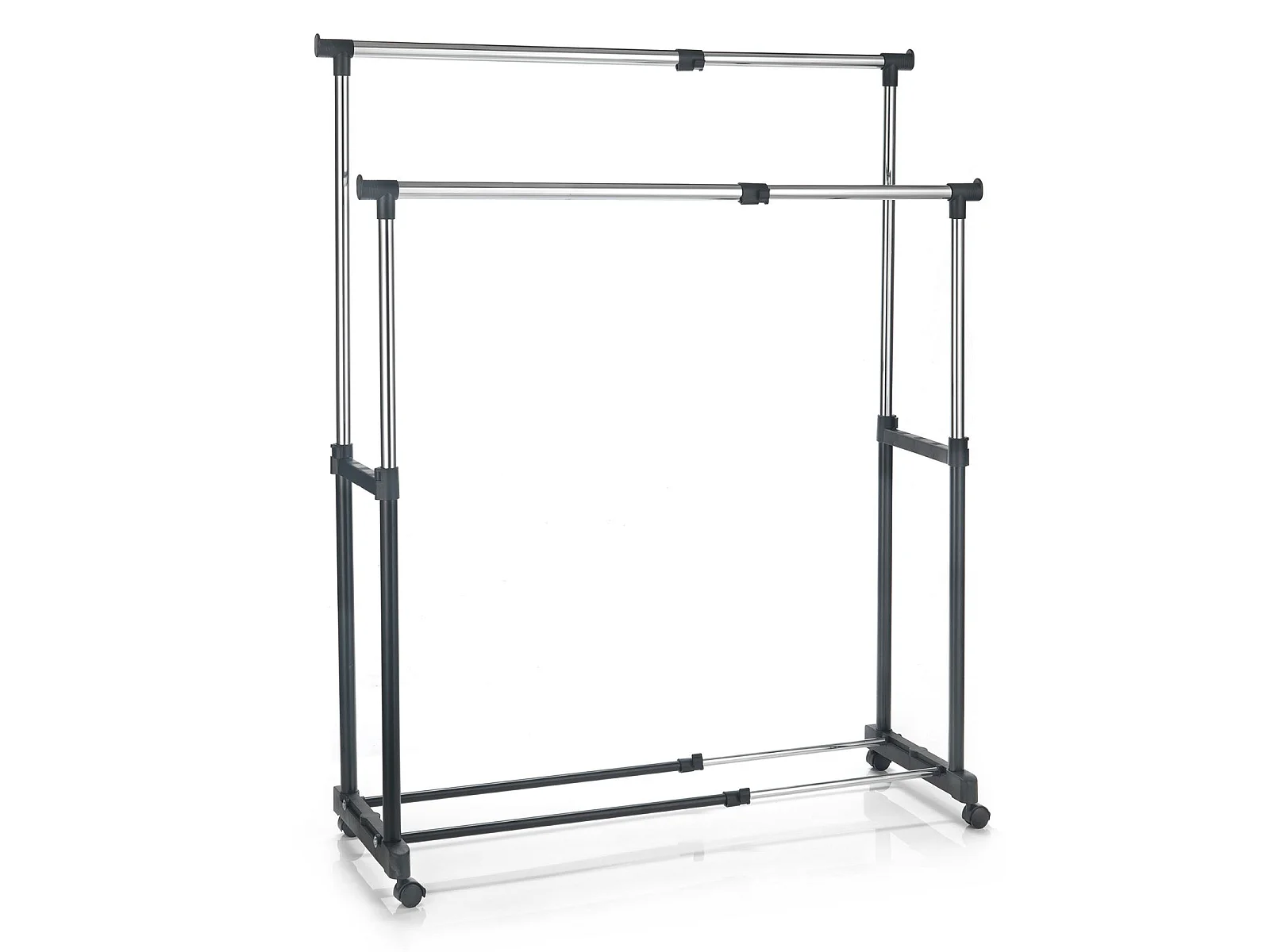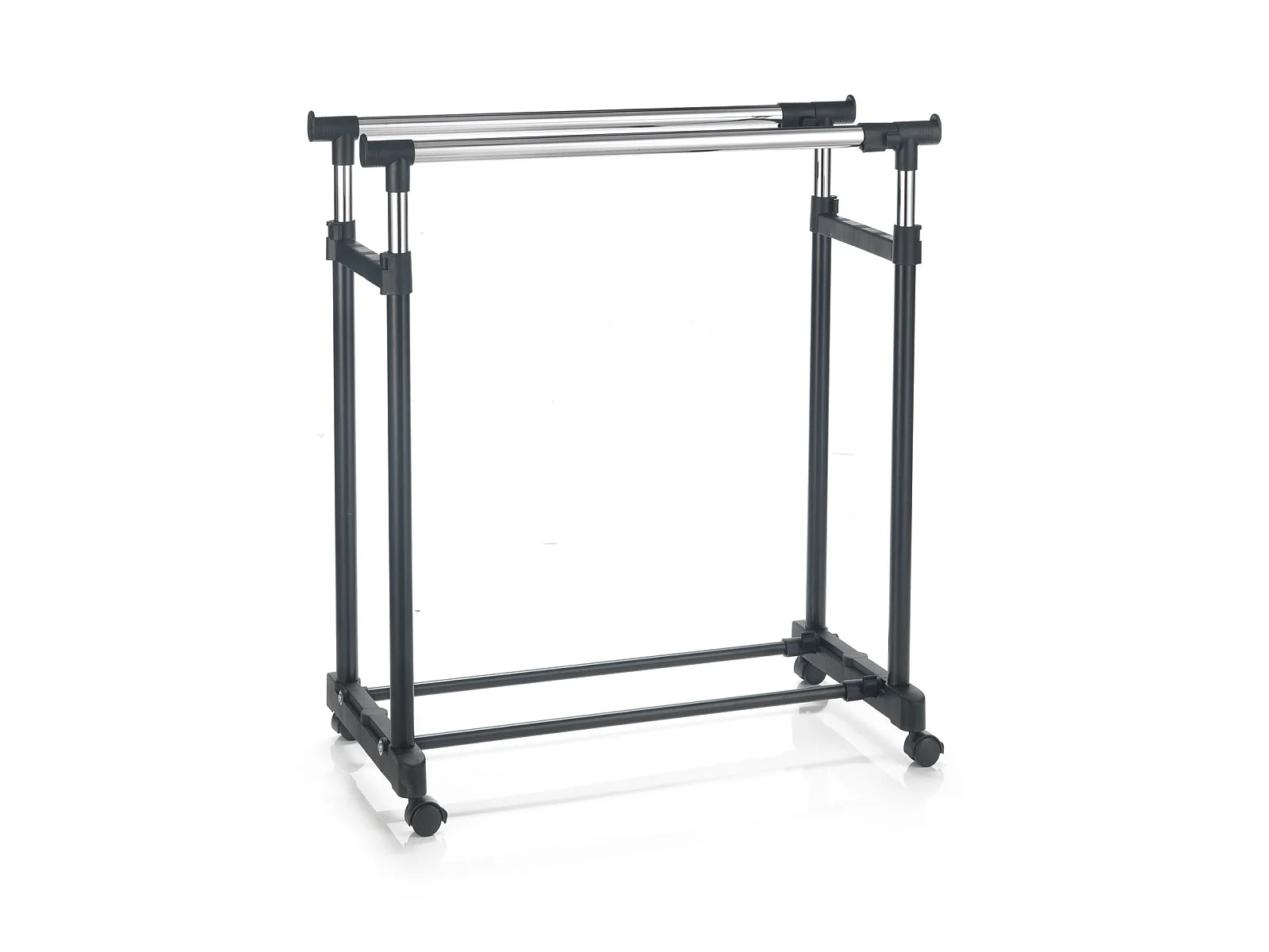 Portant à vêtements CASA en métal chromé et noir, penderie double sur roulettes avec 2 barres hauteur et longueur réglables
