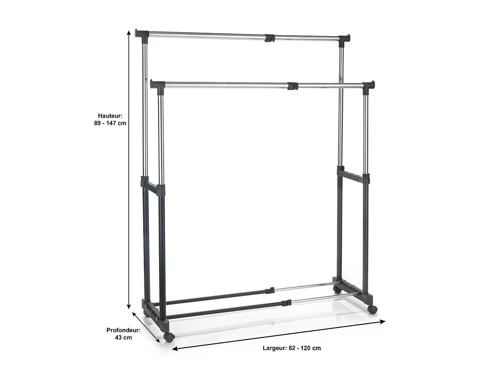 Portant à vêtements GROSSO penderie double sur roulettes vestiaire mobile 2 barres de hauteur réglable et 1 tablette, chromé et noir