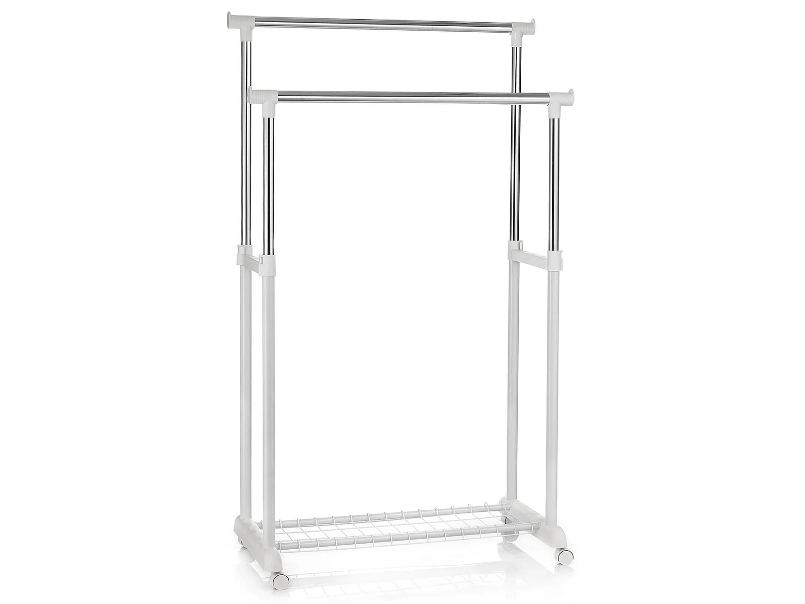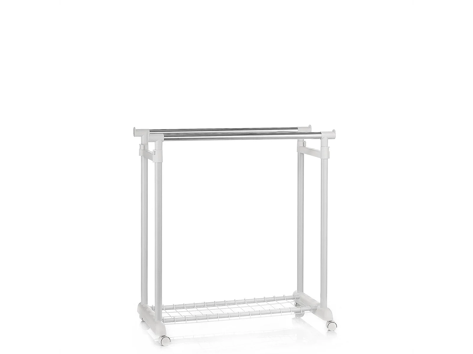 Portant à vêtements CASA en métal chromé et blanc, penderie double sur roulettes avec 2 barres hauteur et longueur réglables