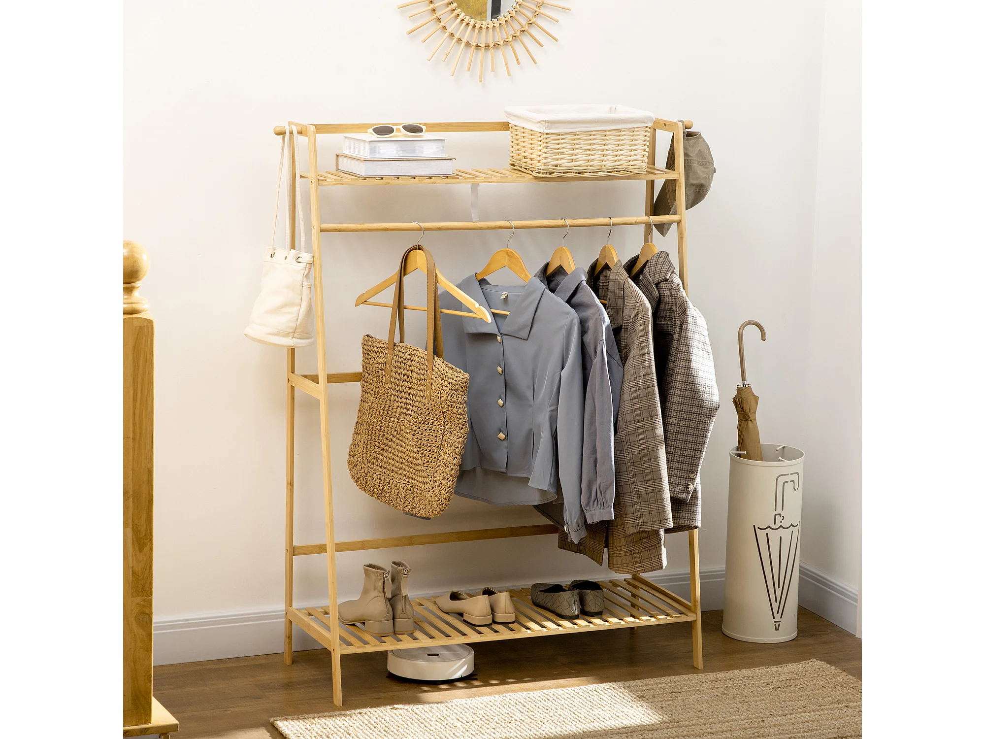 Portant à vêtements penderie - 2 étagères, 2 patères, barre de suspension - bambou verni