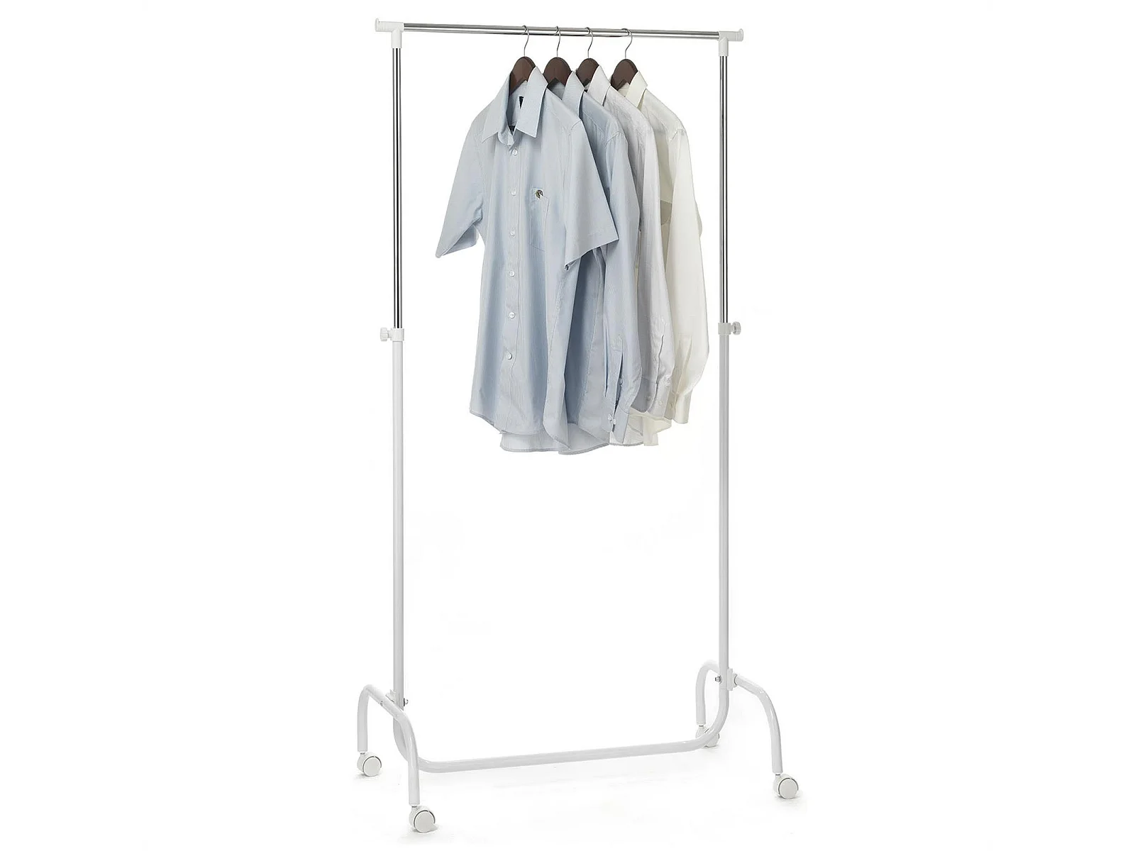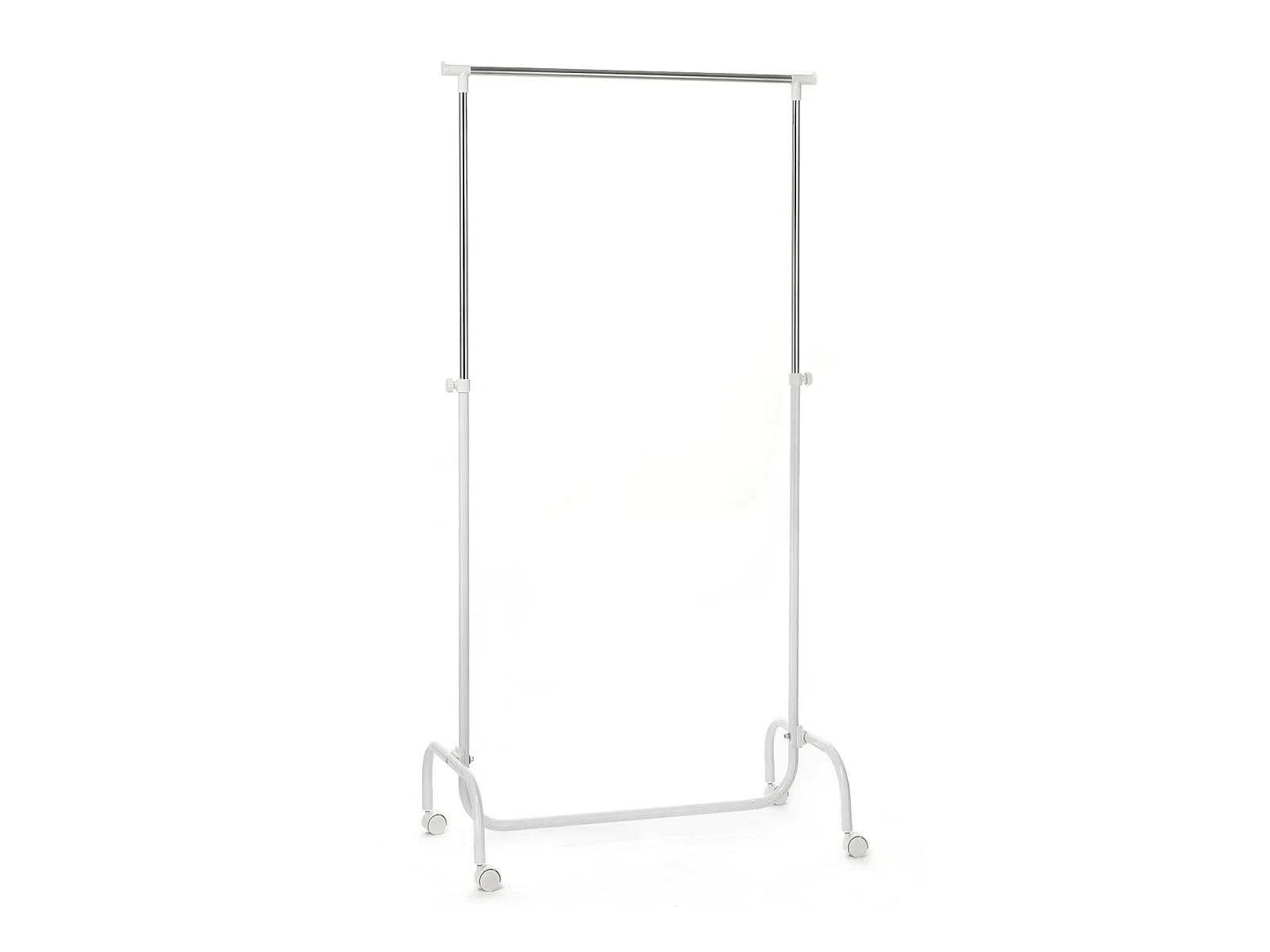 Portant à vêtements TIGER penderie simple sur roulettes vestiaire mobile avec 1 barre de hauteur réglable, en métal chromé et blanc