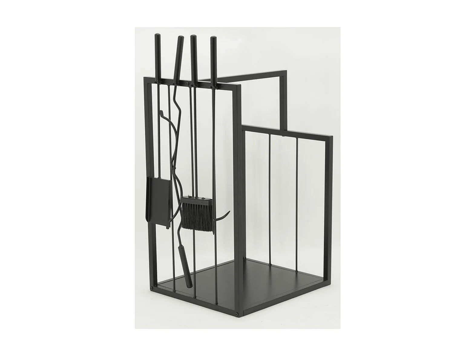 Porte-bûches + 4 accessoires de cheminée en métal noir