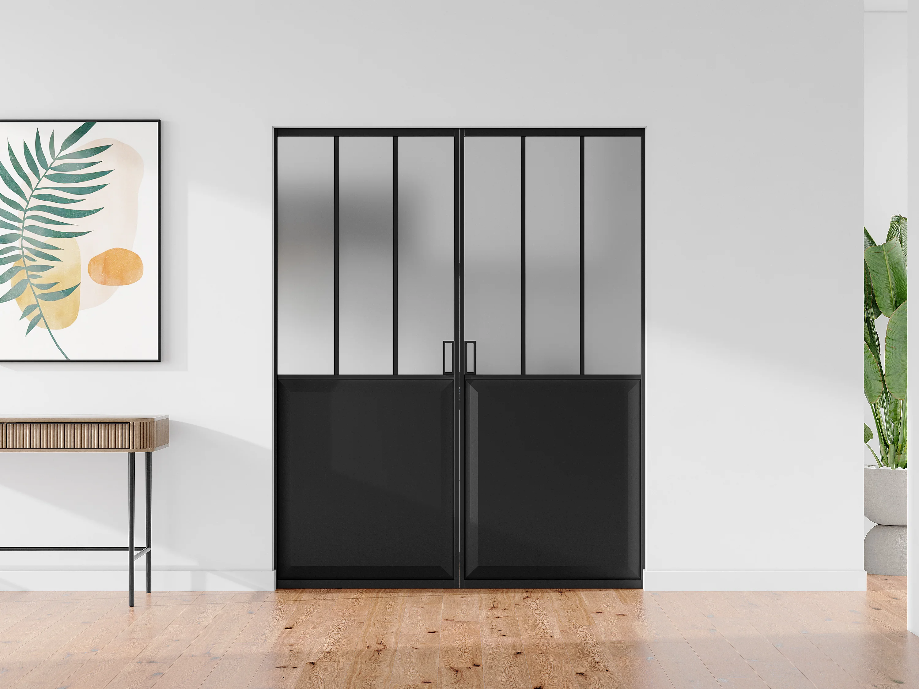 Porte coulissante double atelier avec système à galandage - Noir et verre trempé dépoli - 2 x H205 x L83 cm - ARTISTO II