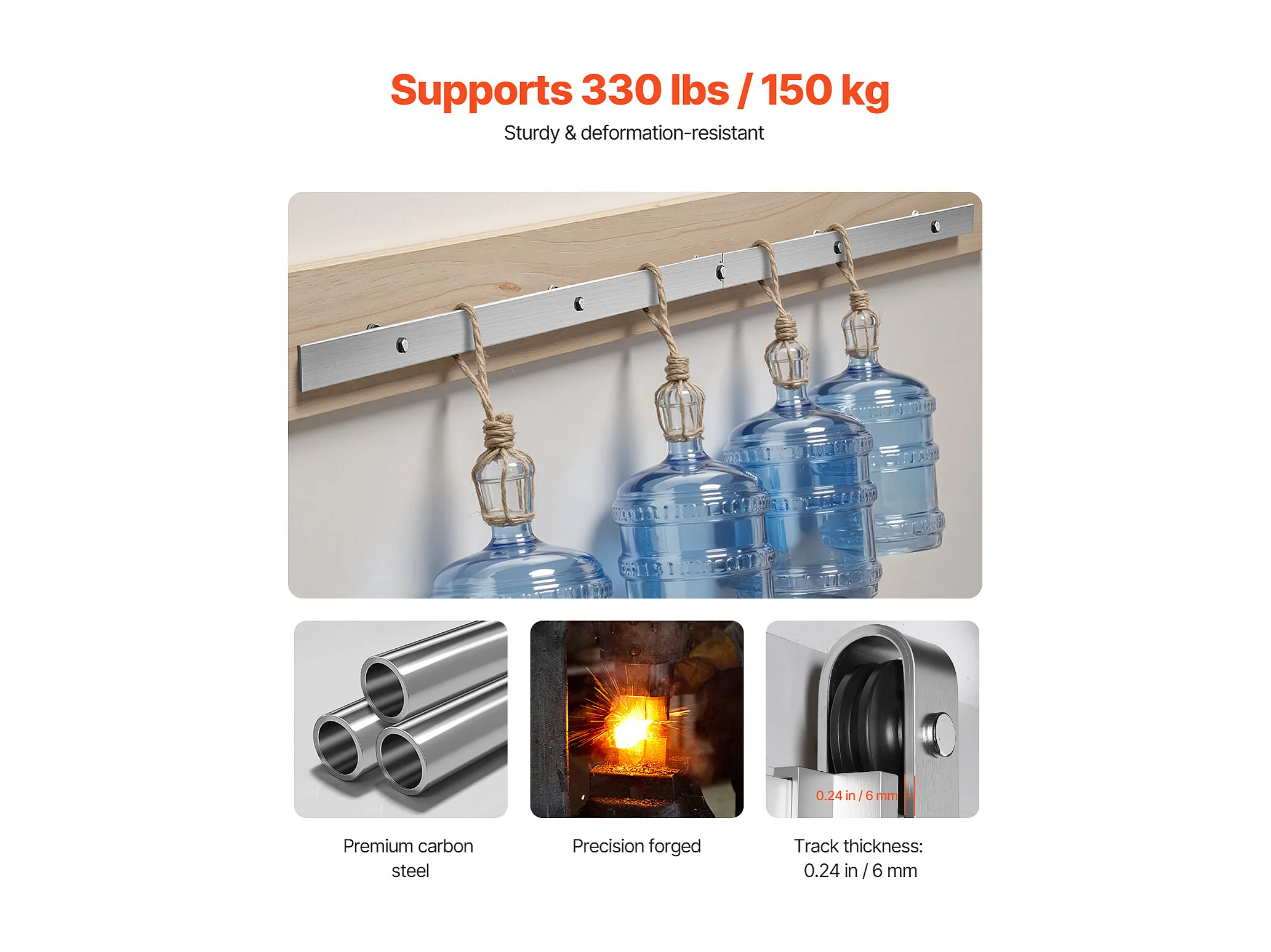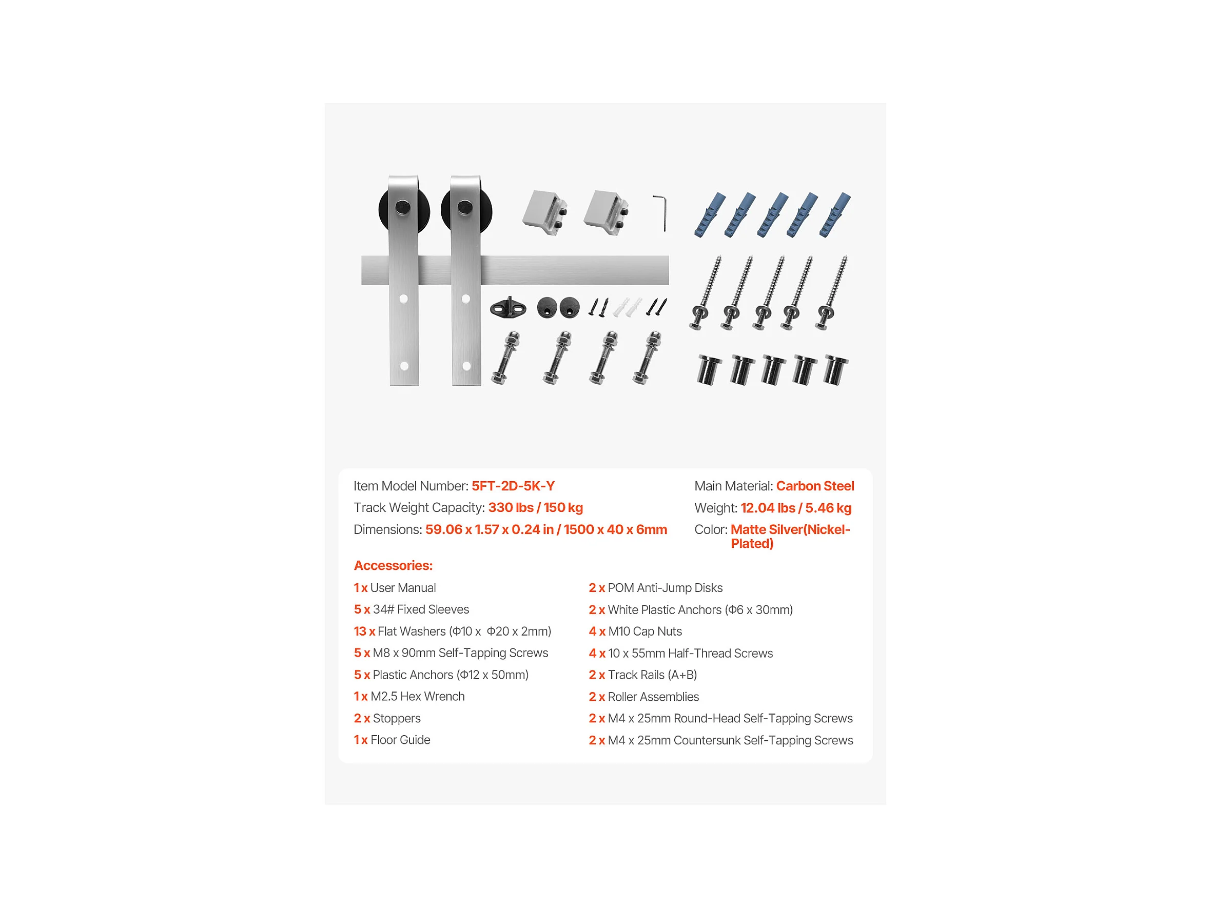 Porte Coulissante SucceBuy Kit de Quincaillerie pour Porte de Grange Coulissante Simple de 1,5 m, Finition Argentée