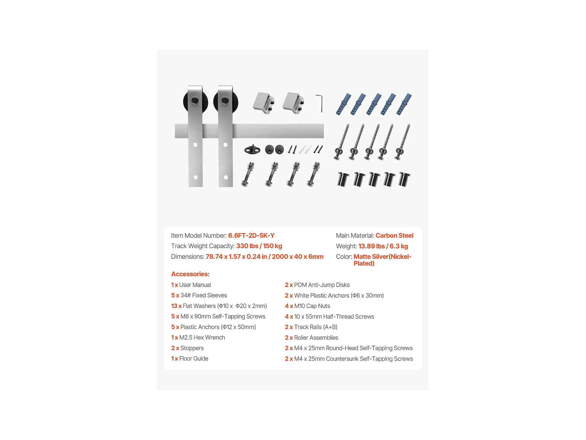 Porte Coulissante SucceBuy Kit de Quincaillerie pour Porte de Grange Coulissante Simple de 2 m, Finition Argentée