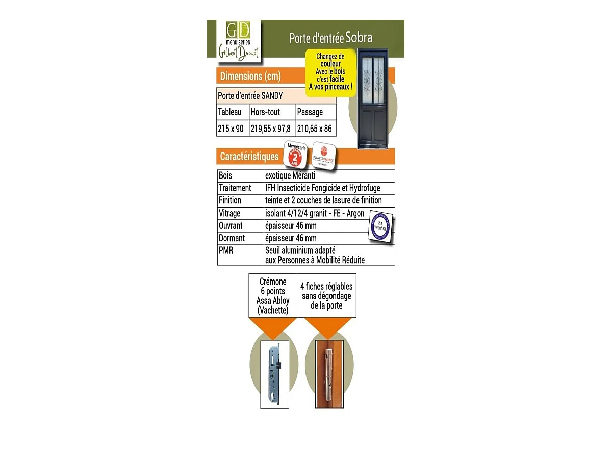 Porte d'entree Bois vitree, Sobra, H,215xl,90 p,gauche Cote Tableau