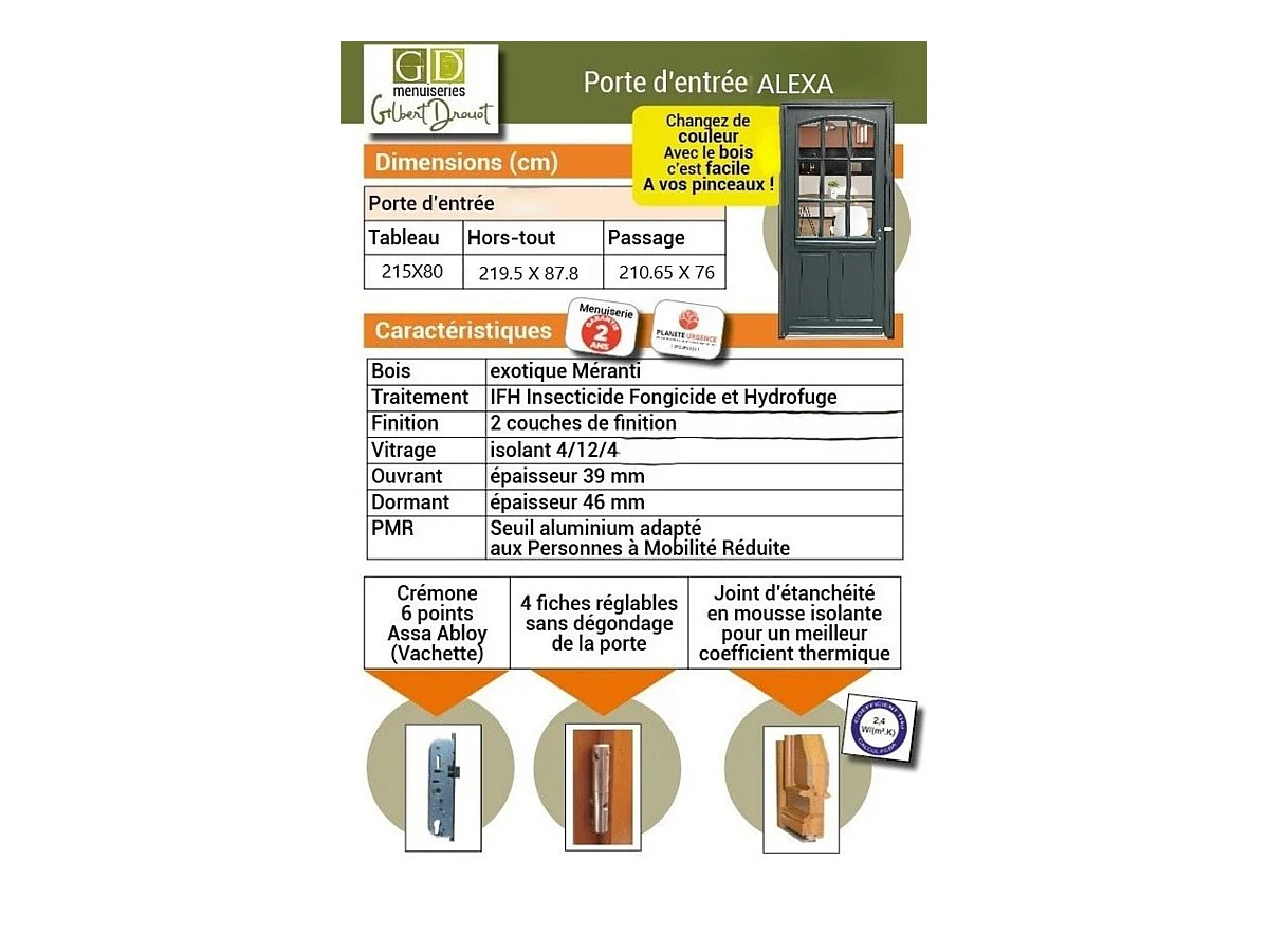 Porte d'entree Bois vitree, Alexa, gris RAL 7016, H,215xl,90 p, droit Cote Tableau