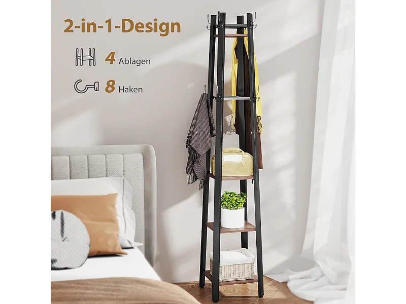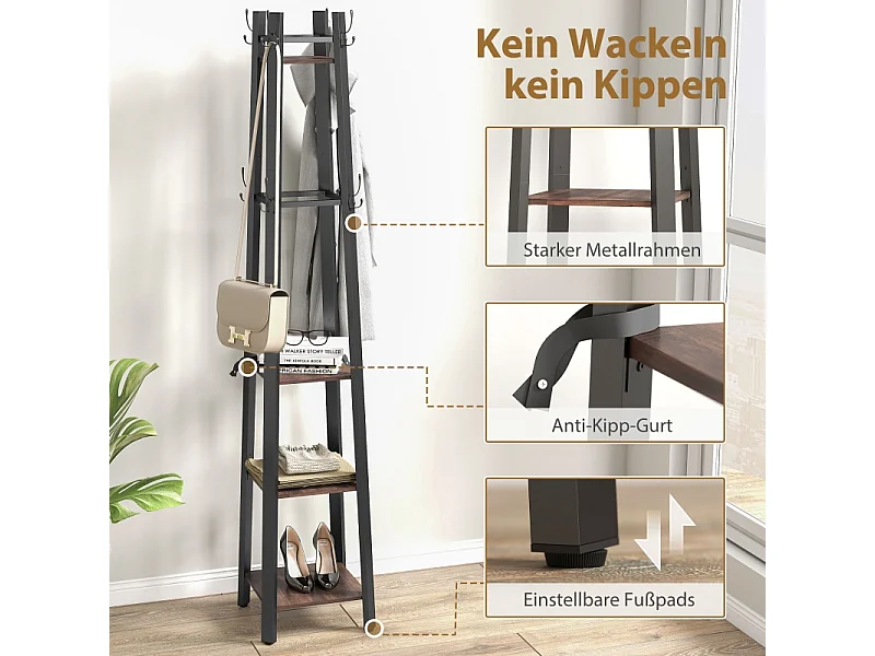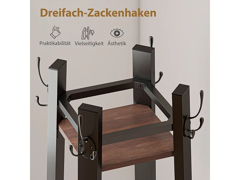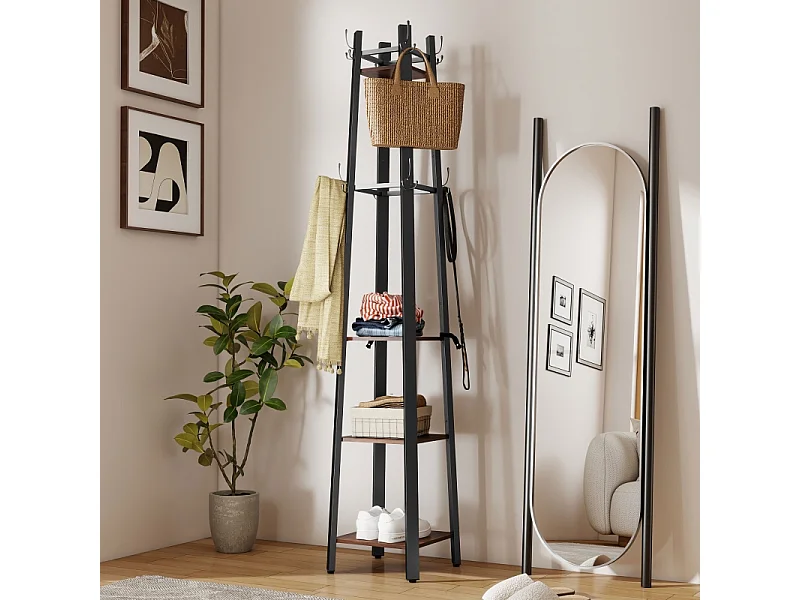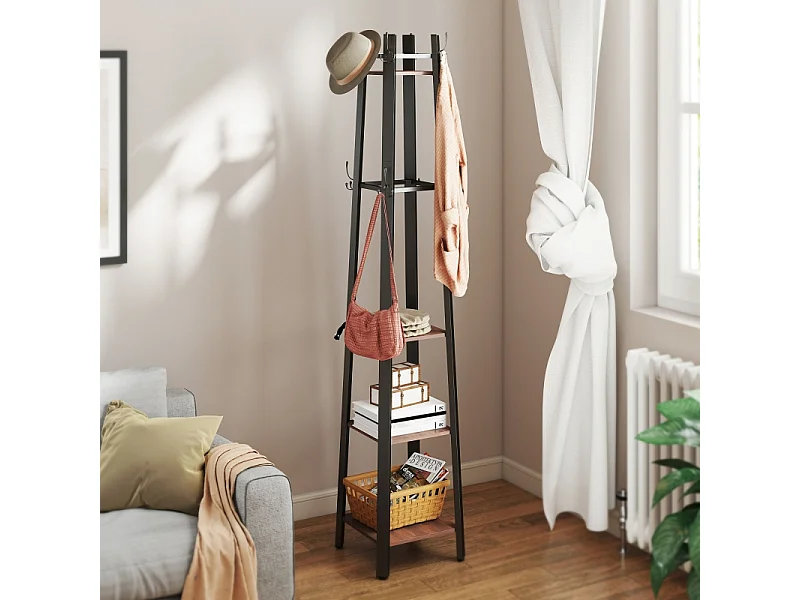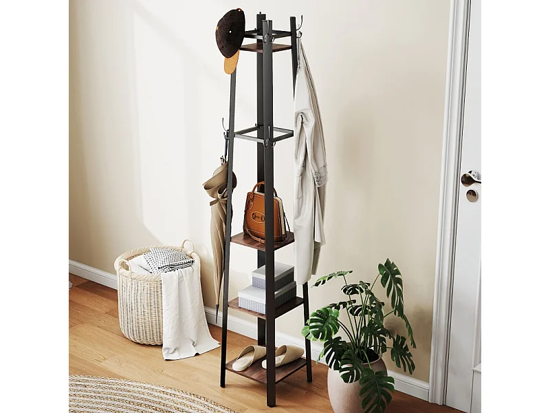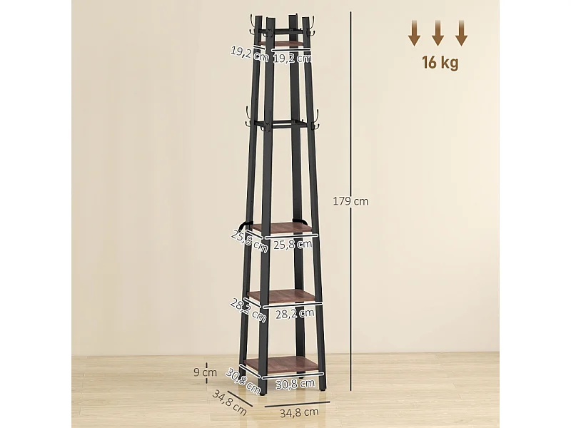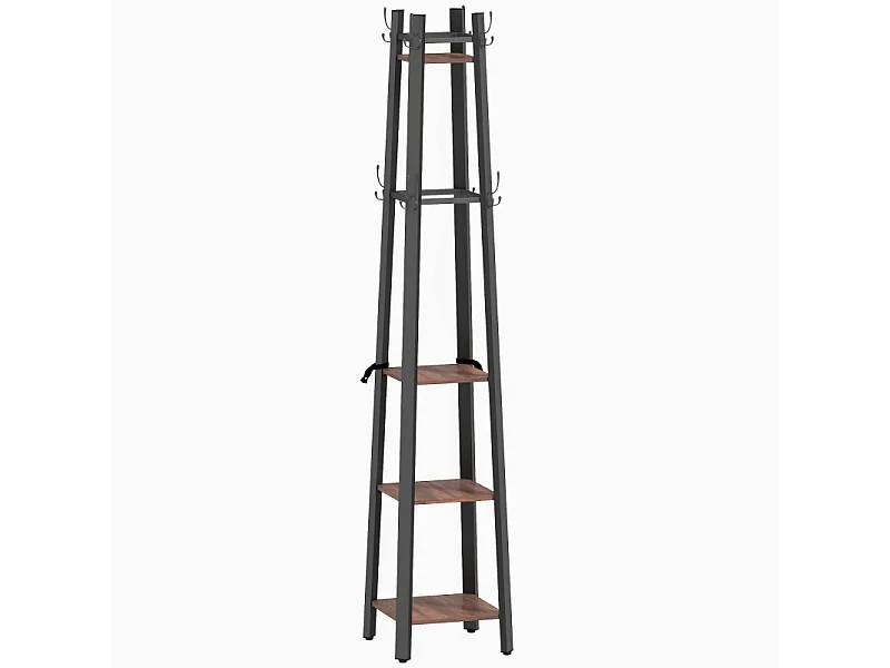 Porte-manteau avec 4 étagères, métal et bois, 8 crochets, style industriel, marron, (34.8x34.8x179 cm)