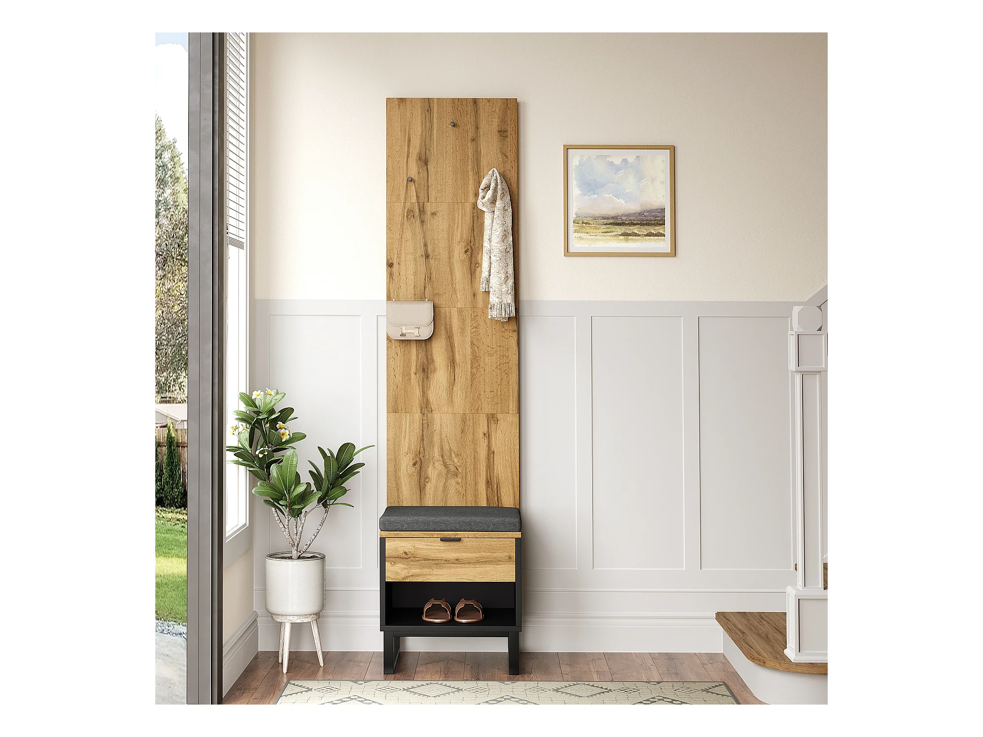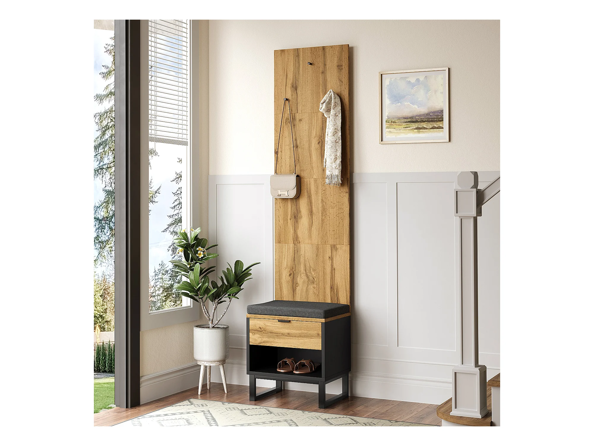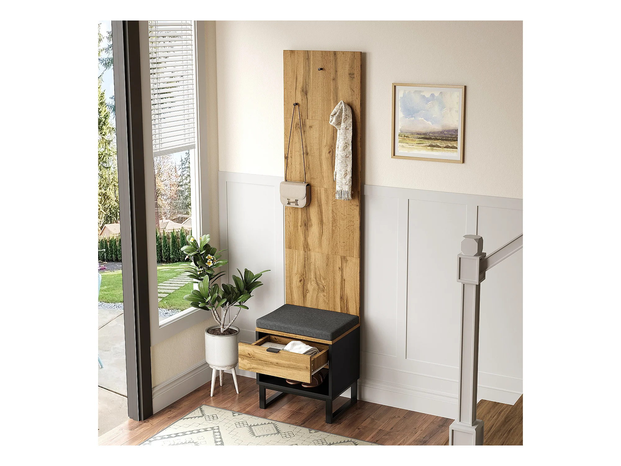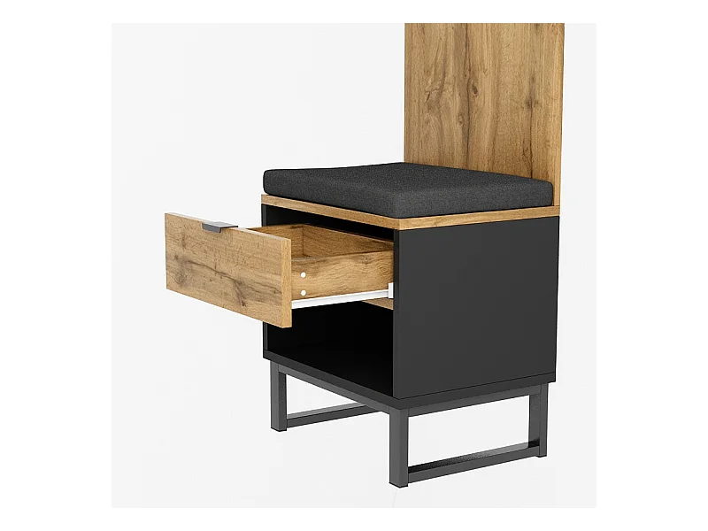 Porte-manteau avec banc à chaussures et tiroirs, panneaux en particules, naturel et noir (210x38x50cm)