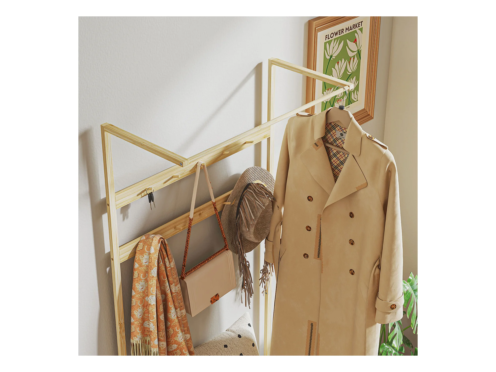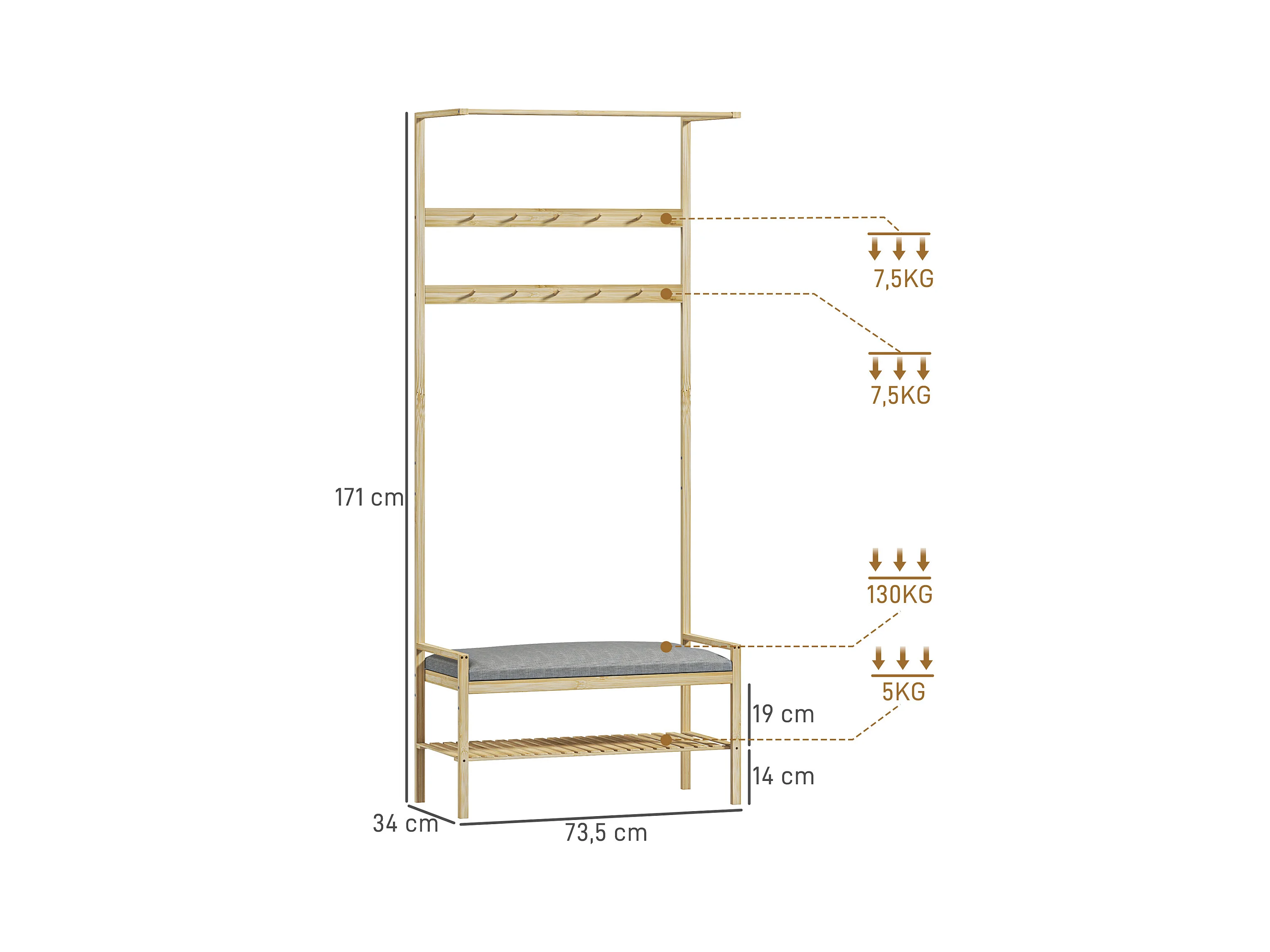 Porte-manteau avec banc pour chaussures, en bambou naturel, avec coussin et étagères (73.5x34x171 cm)