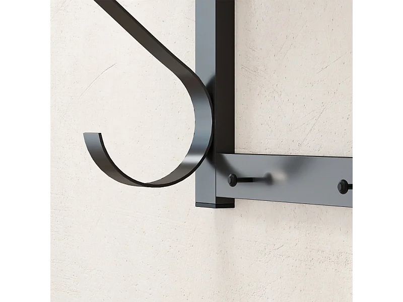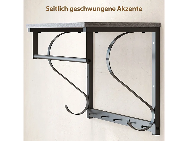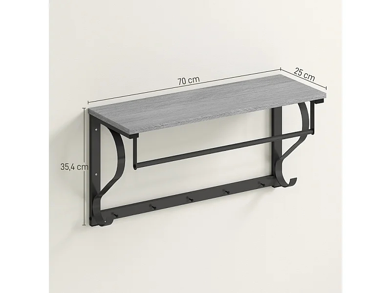 Porte-manteau mural, 5 crochets, étagère supérieure, métal et bois, gris (60x25x30 cm)