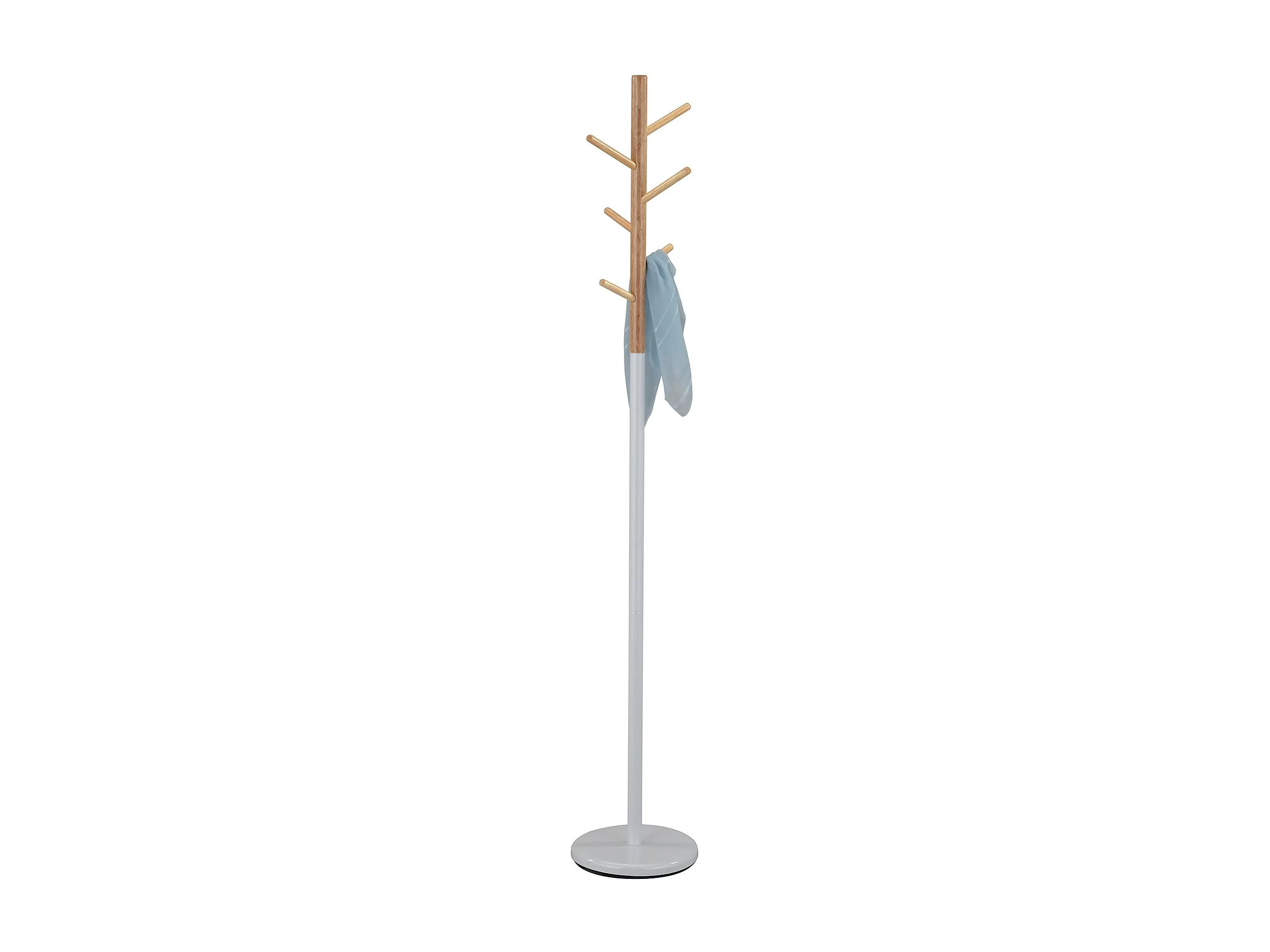 Porte-manteaux ENRICO portant à vêtements sur pied en forme d'arbre avec 6 crochets, en métal laqué blanc et bois