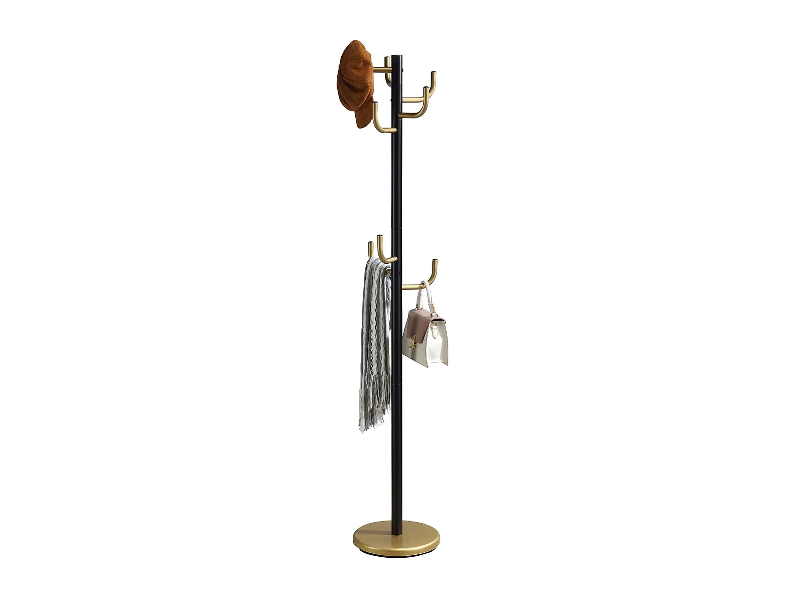 Porte-manteaux ZENO portant à vêtements sur pied en forme d'arbre, 6 crochets sur différentes hauteurs, en métal laqué noir/doré