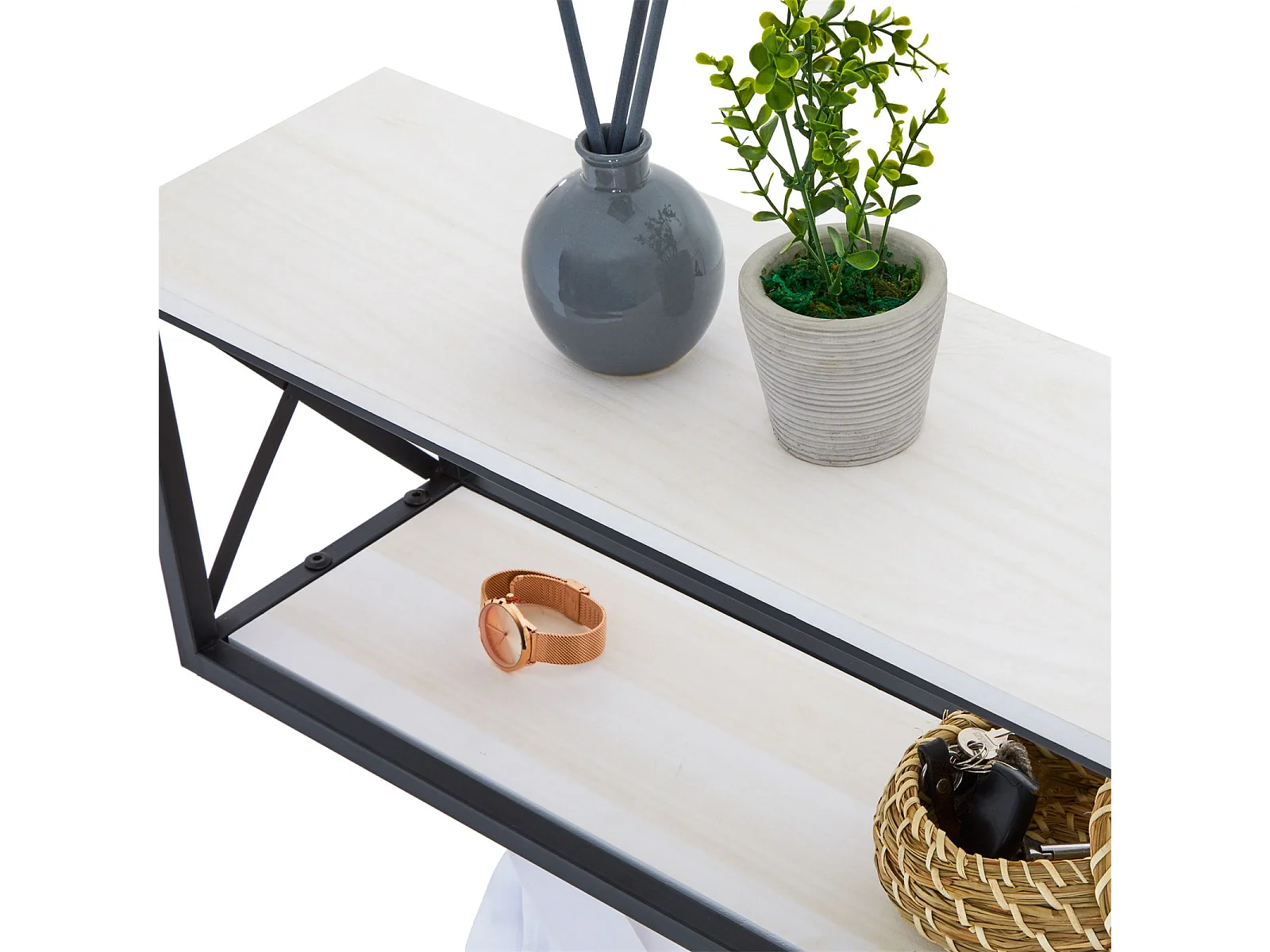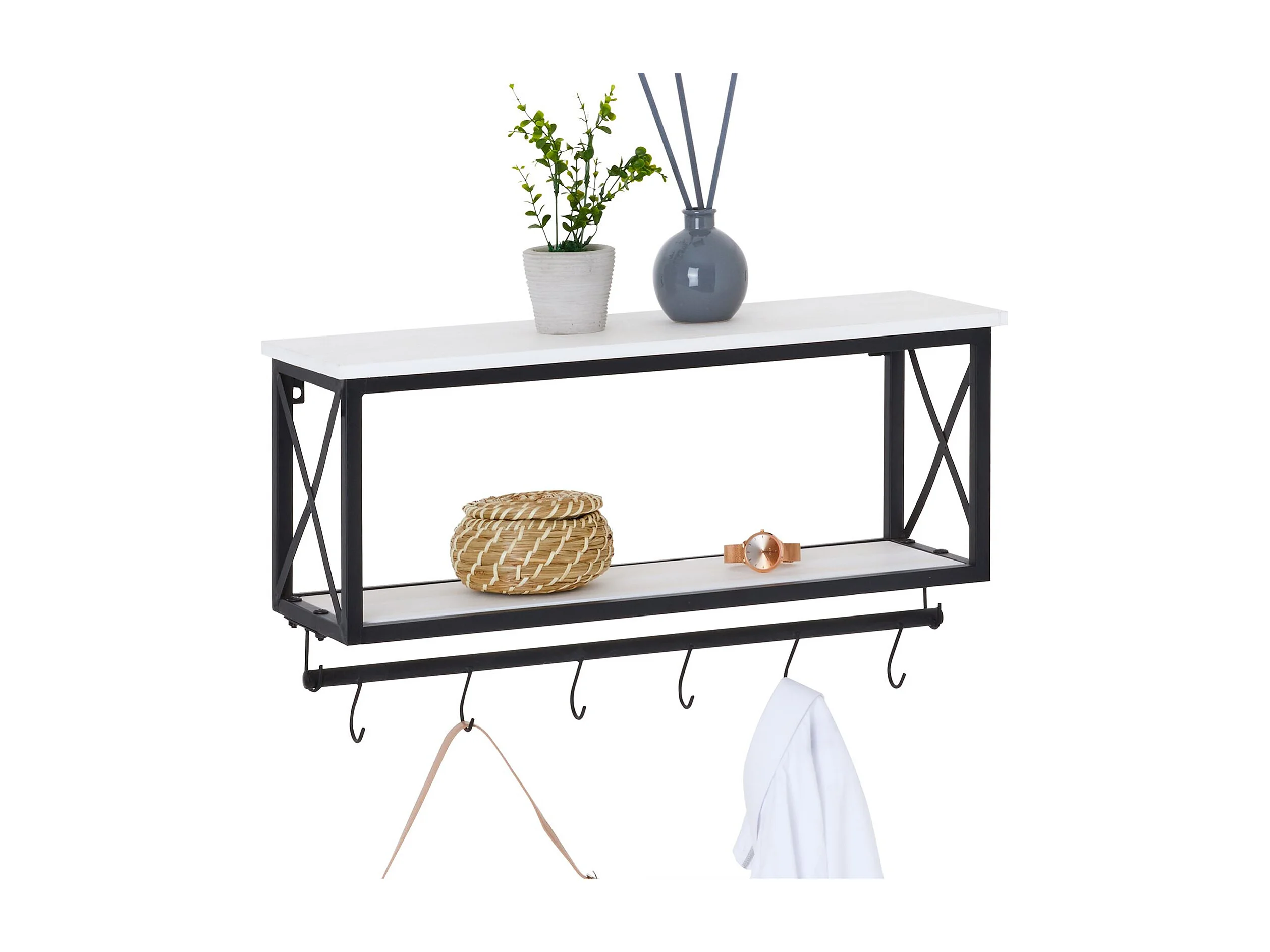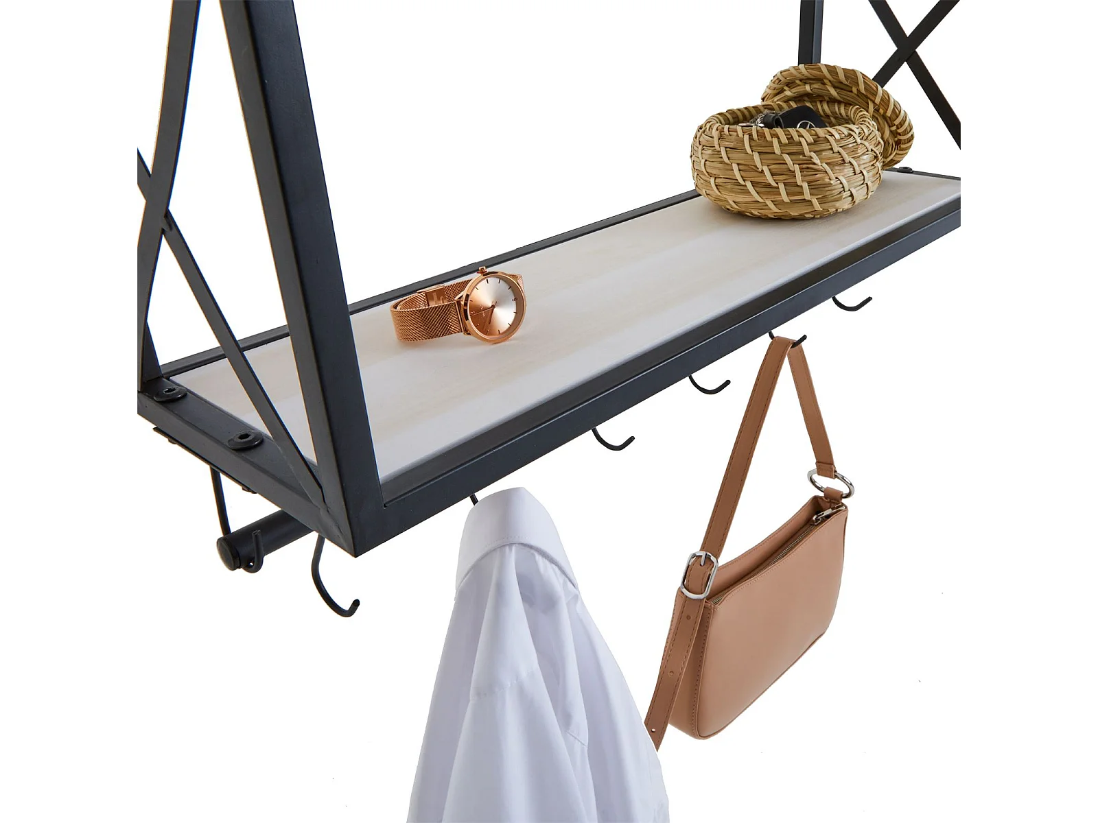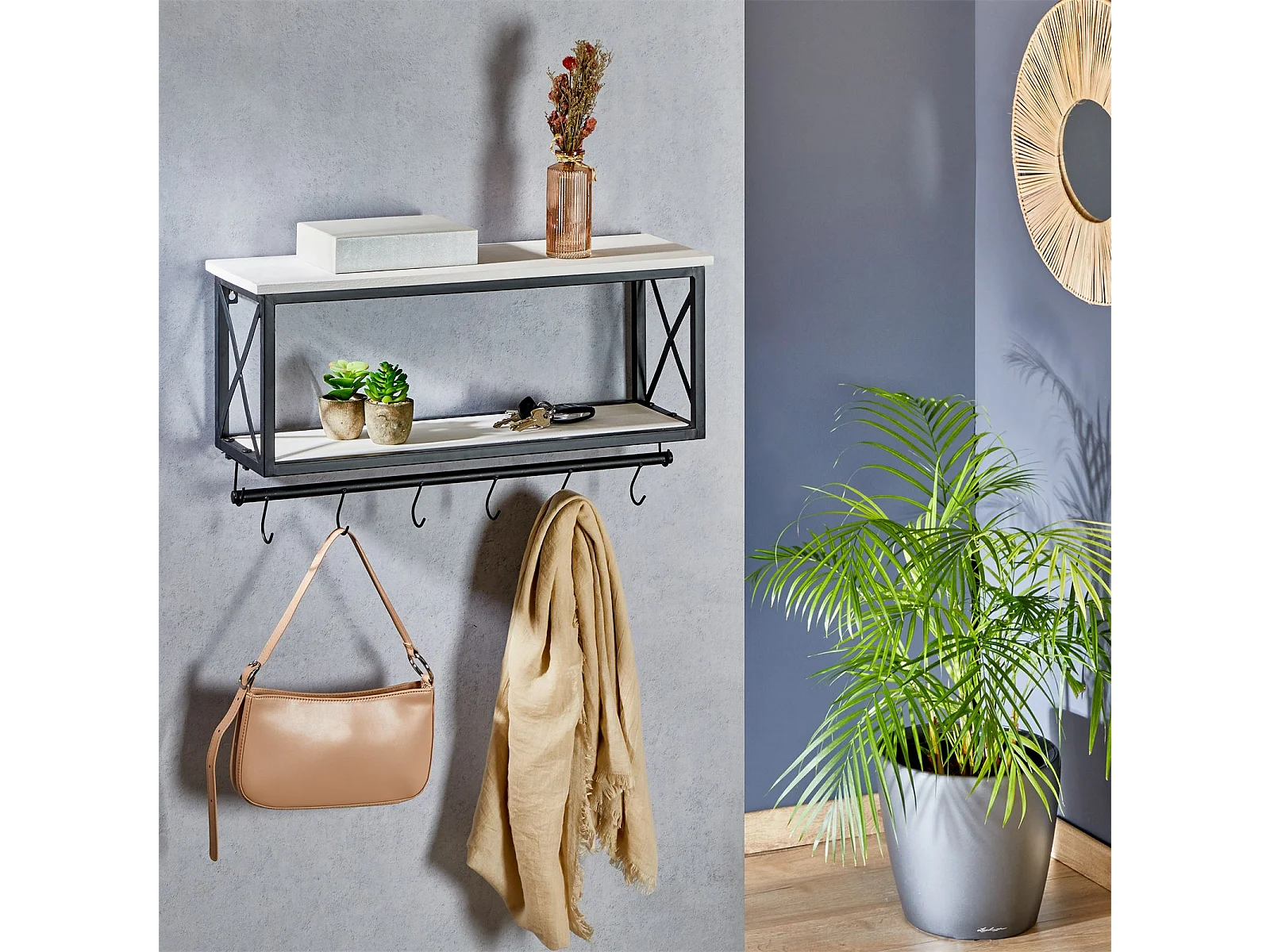Porte-manteaux mural ARMANDO avec 2 étagères de rangement en bois blanc et 6 patères crochets sur tringle, cadre en métal noir