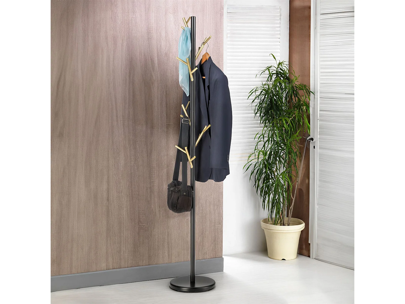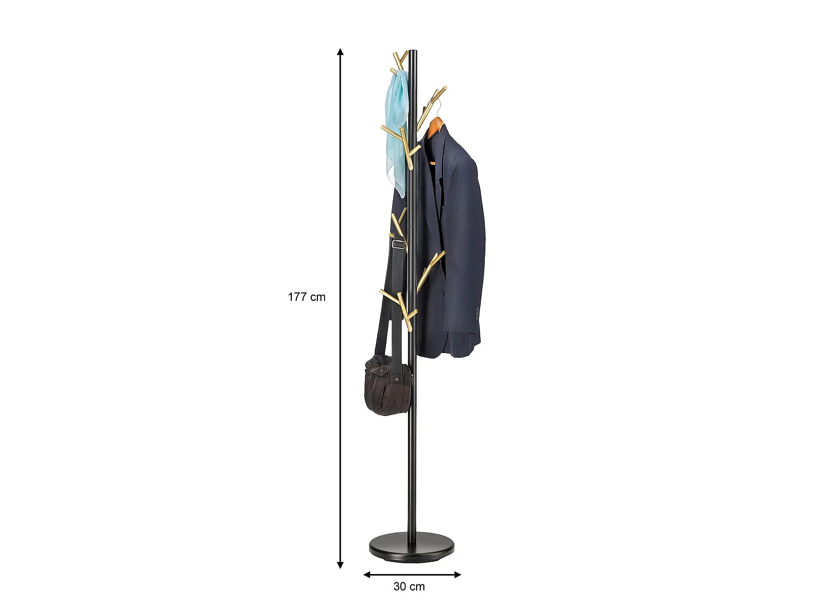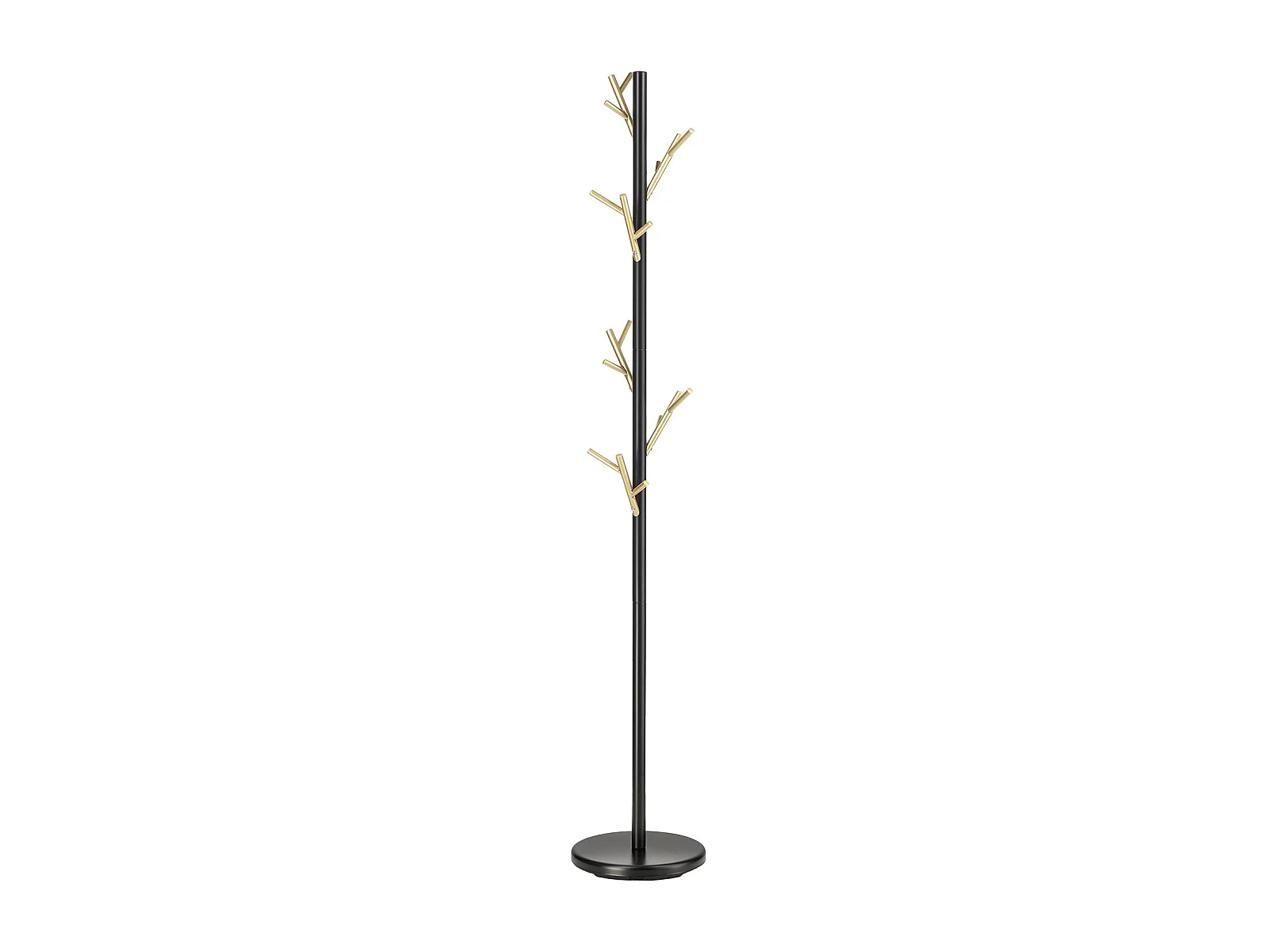 Porte-manteaux ZENO portant à vêtements sur pied en forme d'arbre, 6 crochets sur différentes hauteurs, en métal laqué noir/doré