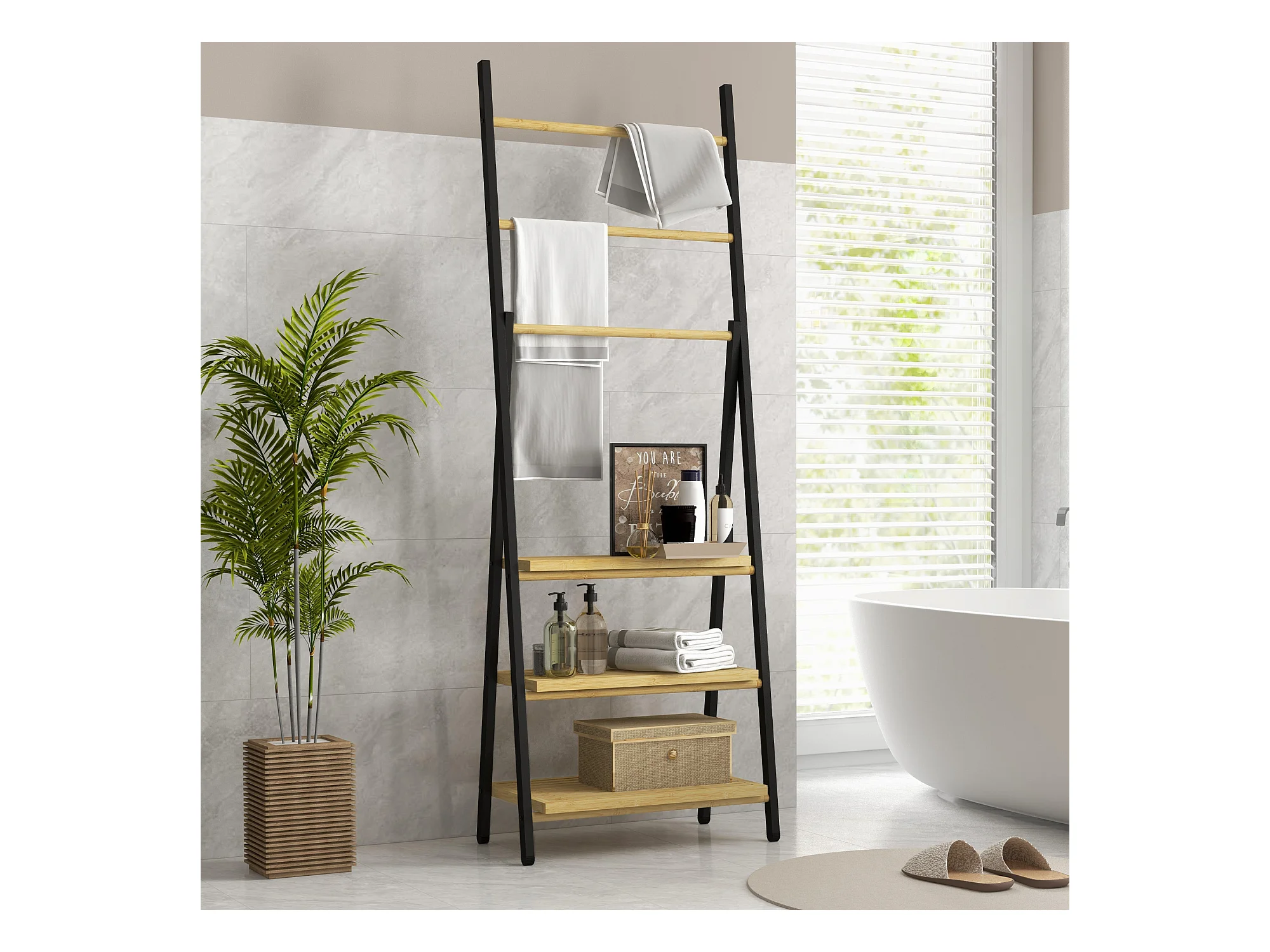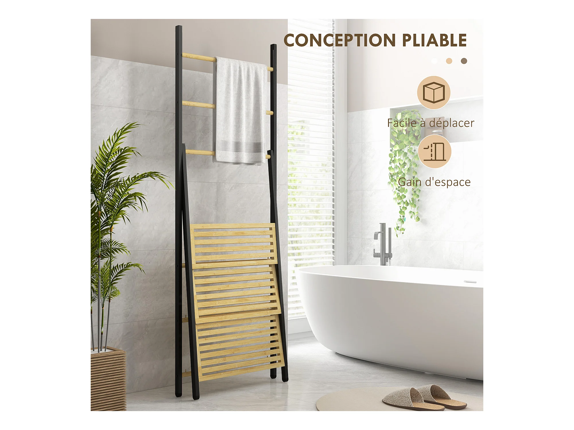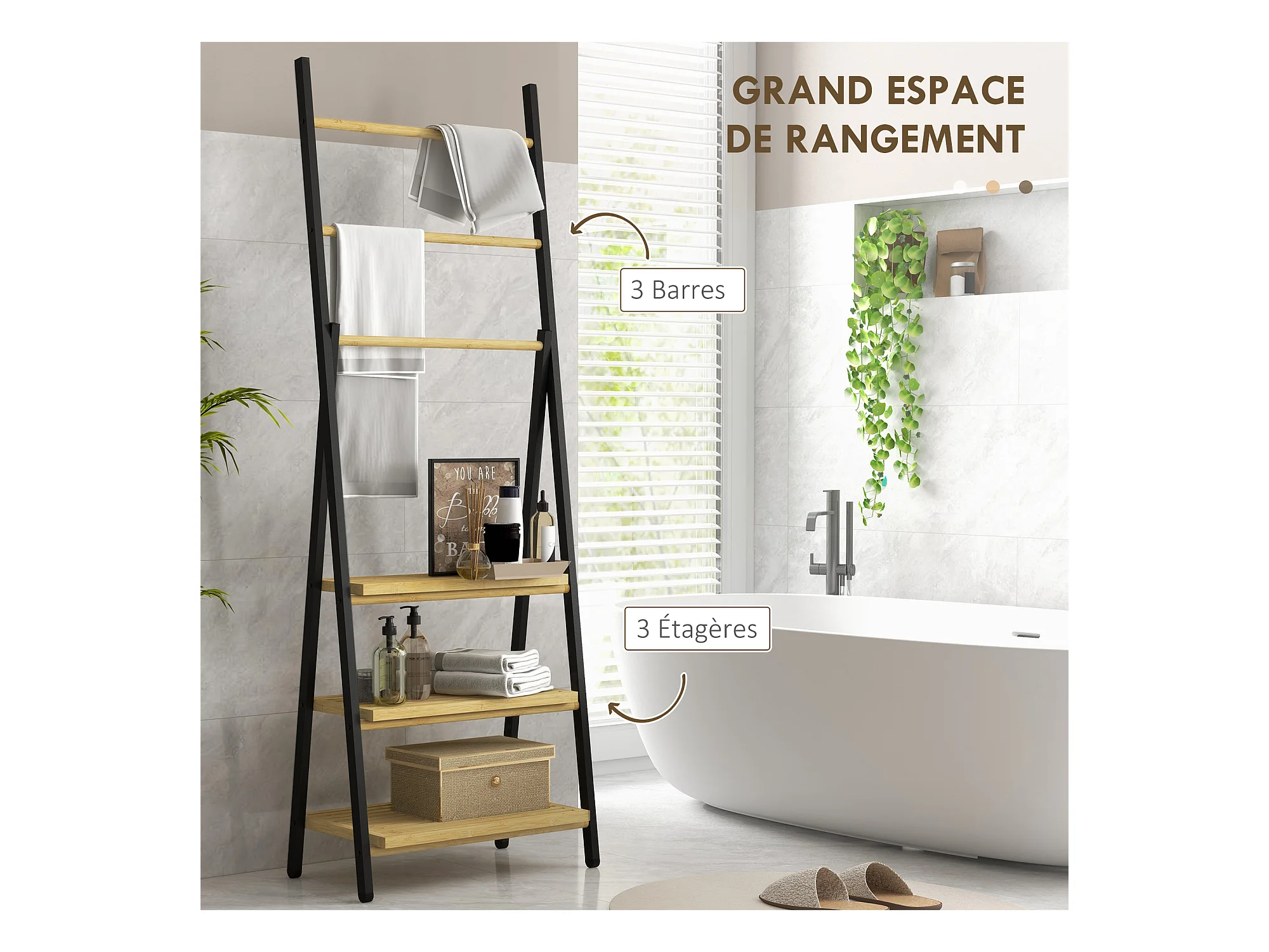 Porte-serviettes pliable 3 barres de suspension et 3 étagères en bambou pour salle de bains, structure métal noir