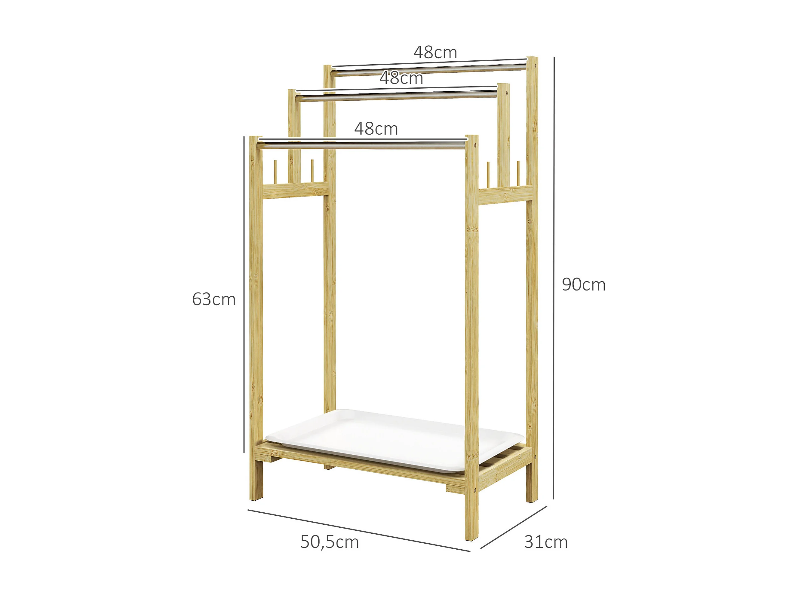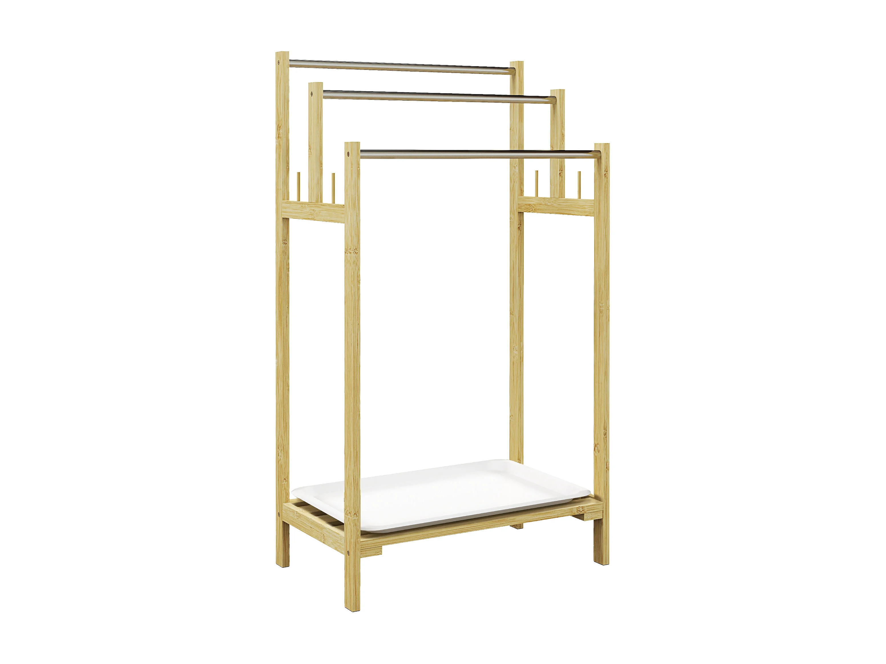 Porte-serviettes style cosy naturel - 3 barres, étagère, plateau, 4 crochets acier inox. bambou verni