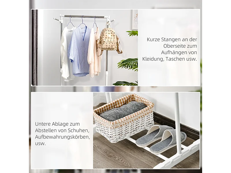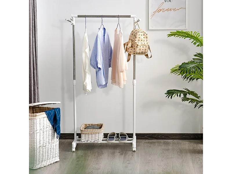 Porte-vêtements sur roulettes, avec étagère, réglable en hauteur, métal, blanc (68.5x42x87-145 cm)