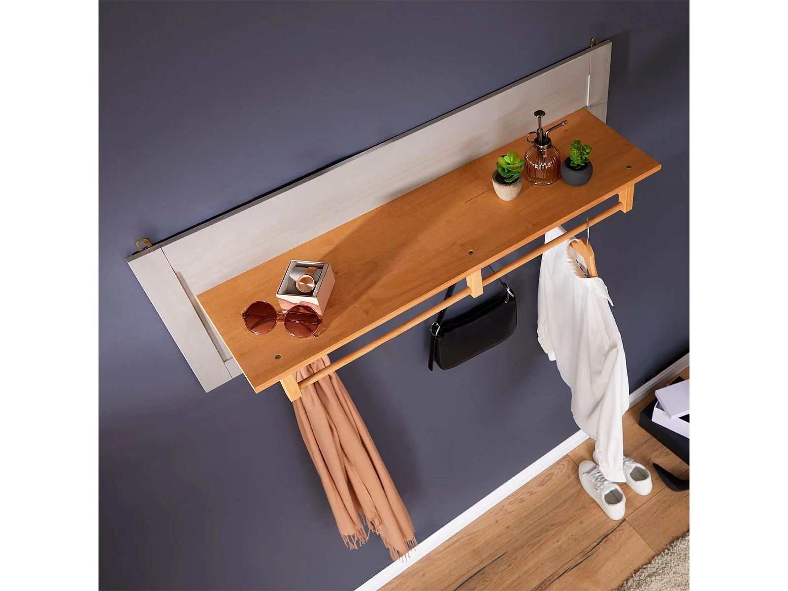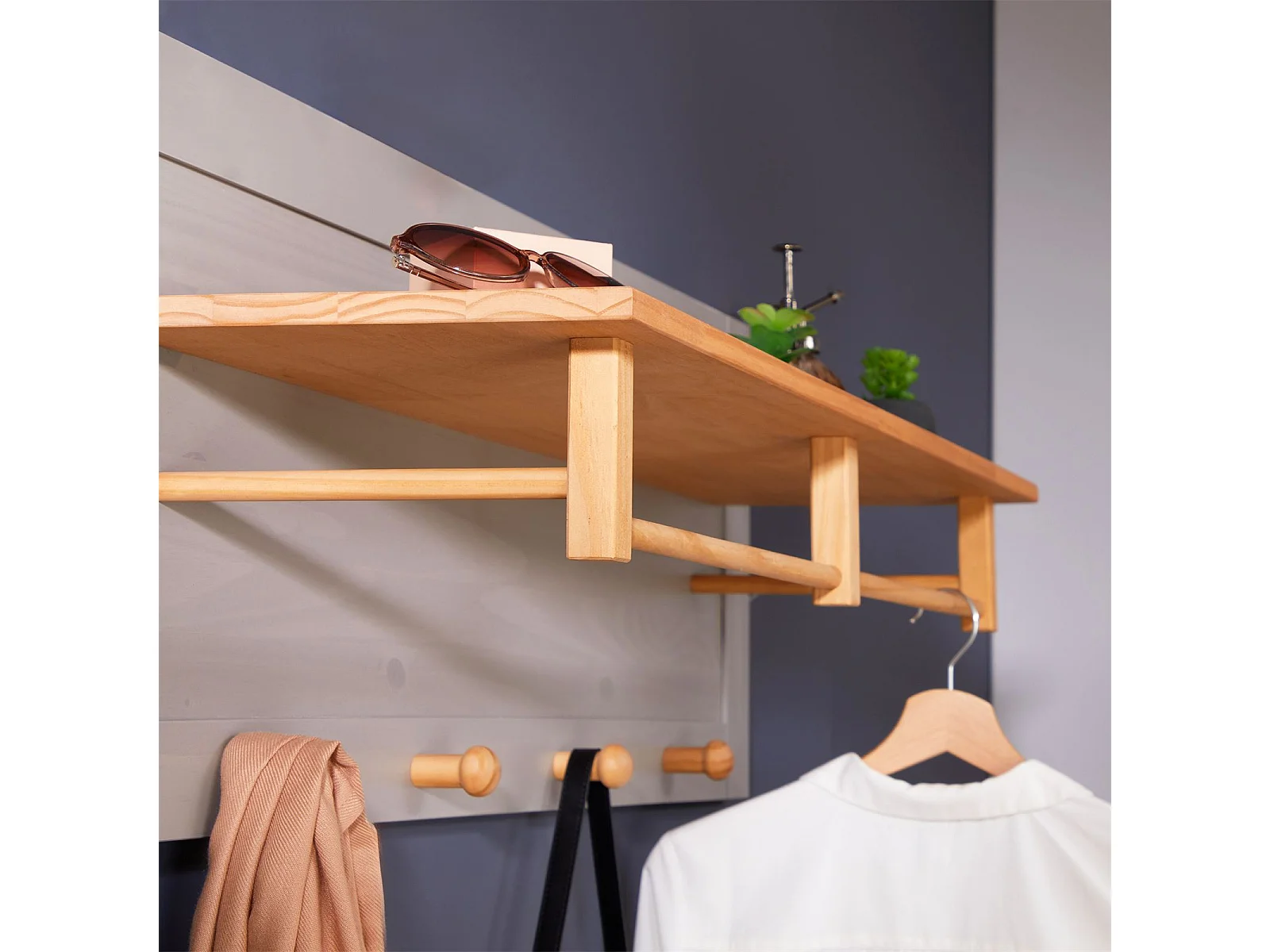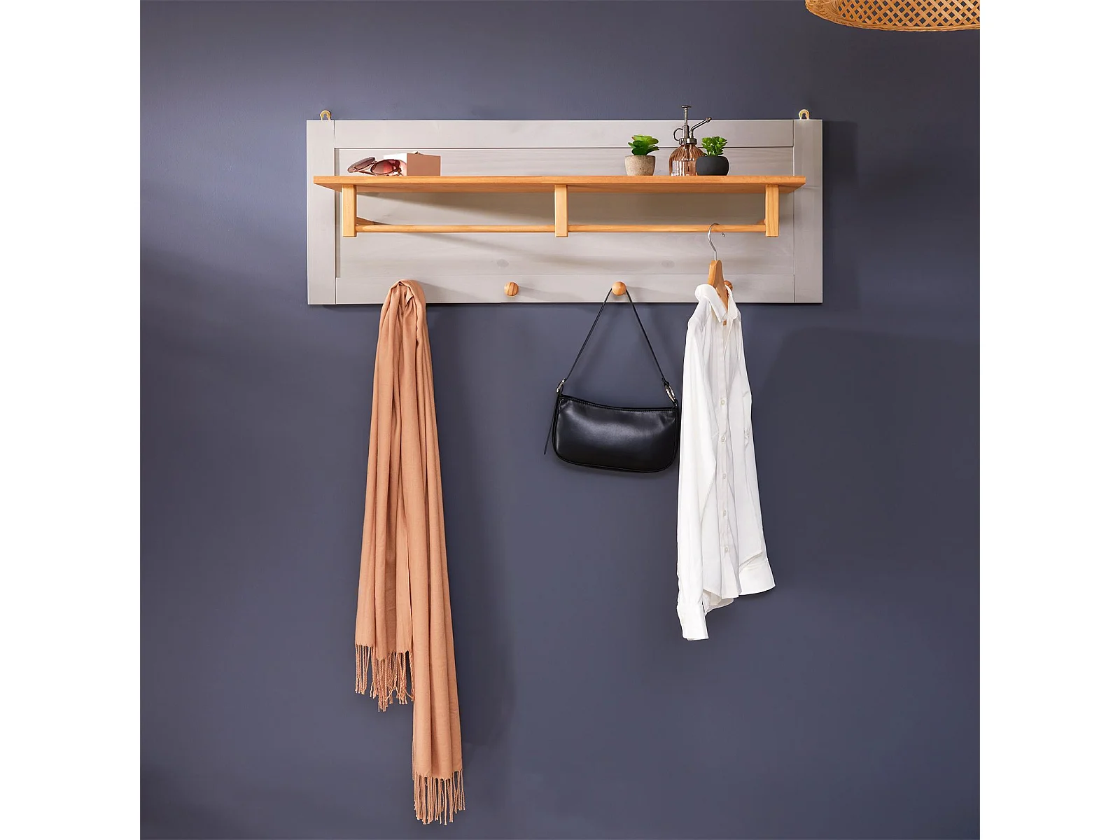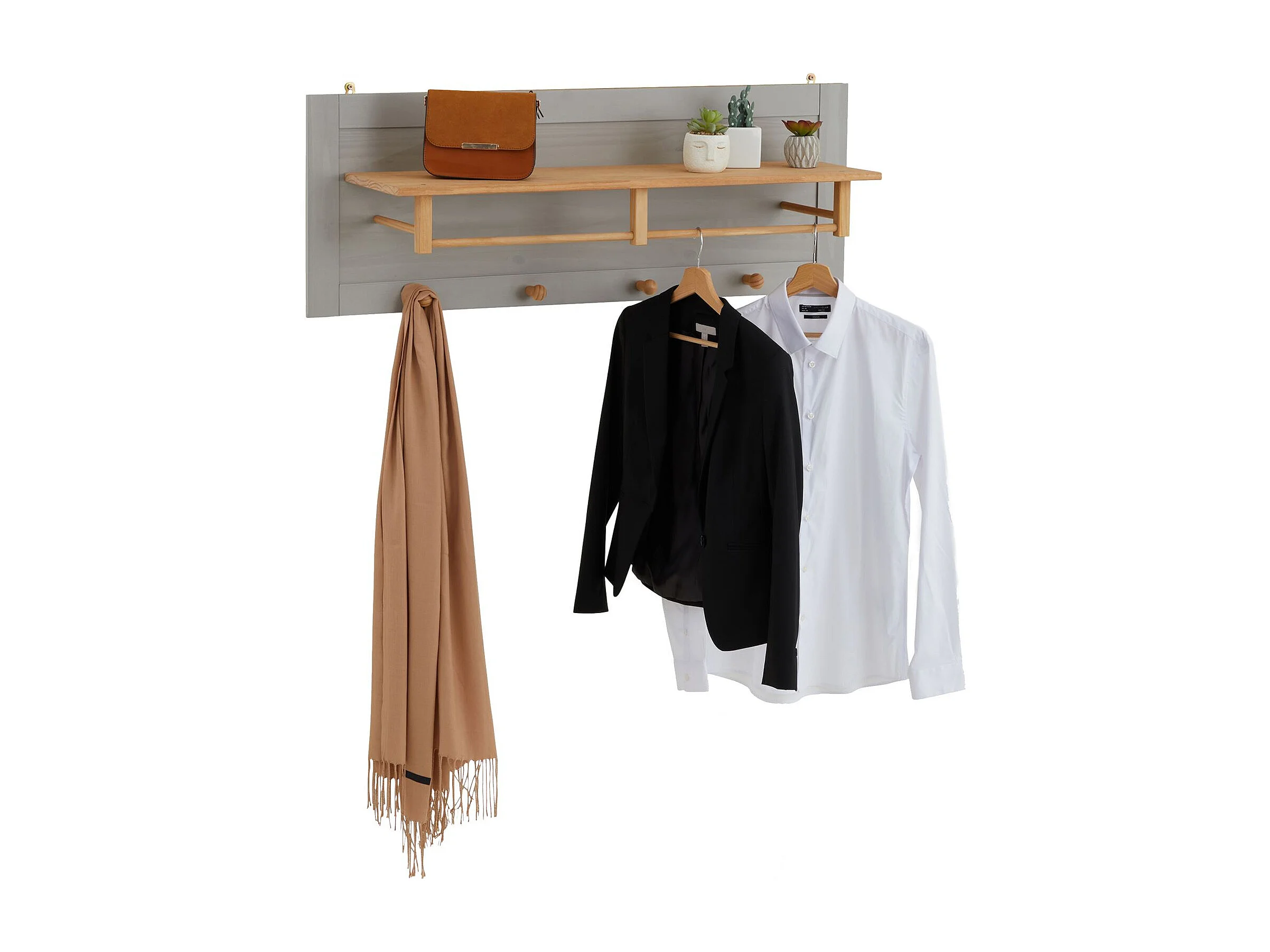 Portemanteau mural avec 4 crochets, 1 tringle et 1 étagère murale de rangement BOLTON, patère en pin massif gris et brun