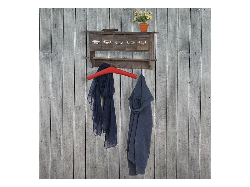 Portemanteau mural, étagère 5 tiroirs, 65x13x32cm, shabby chic, vintage - marron