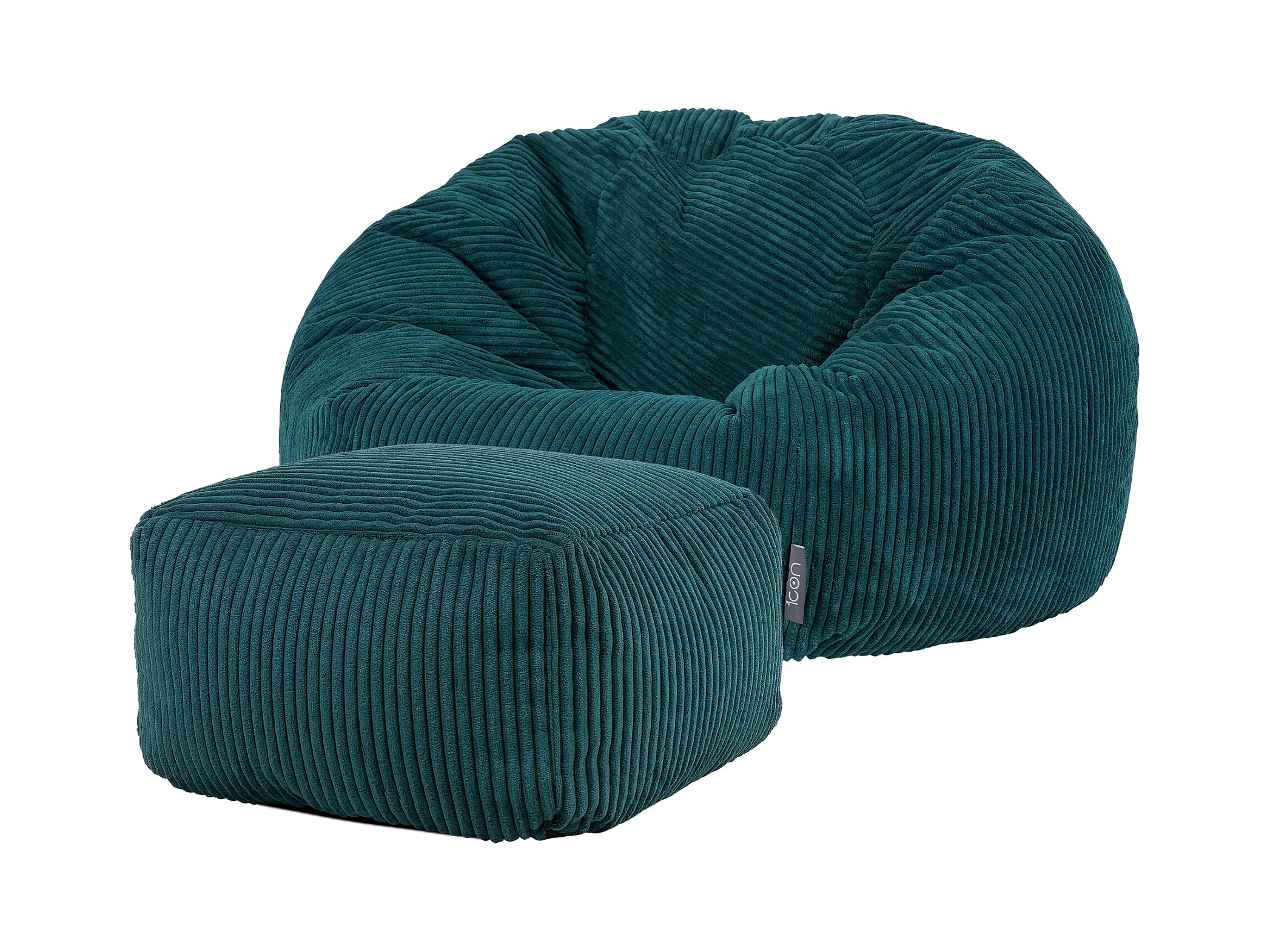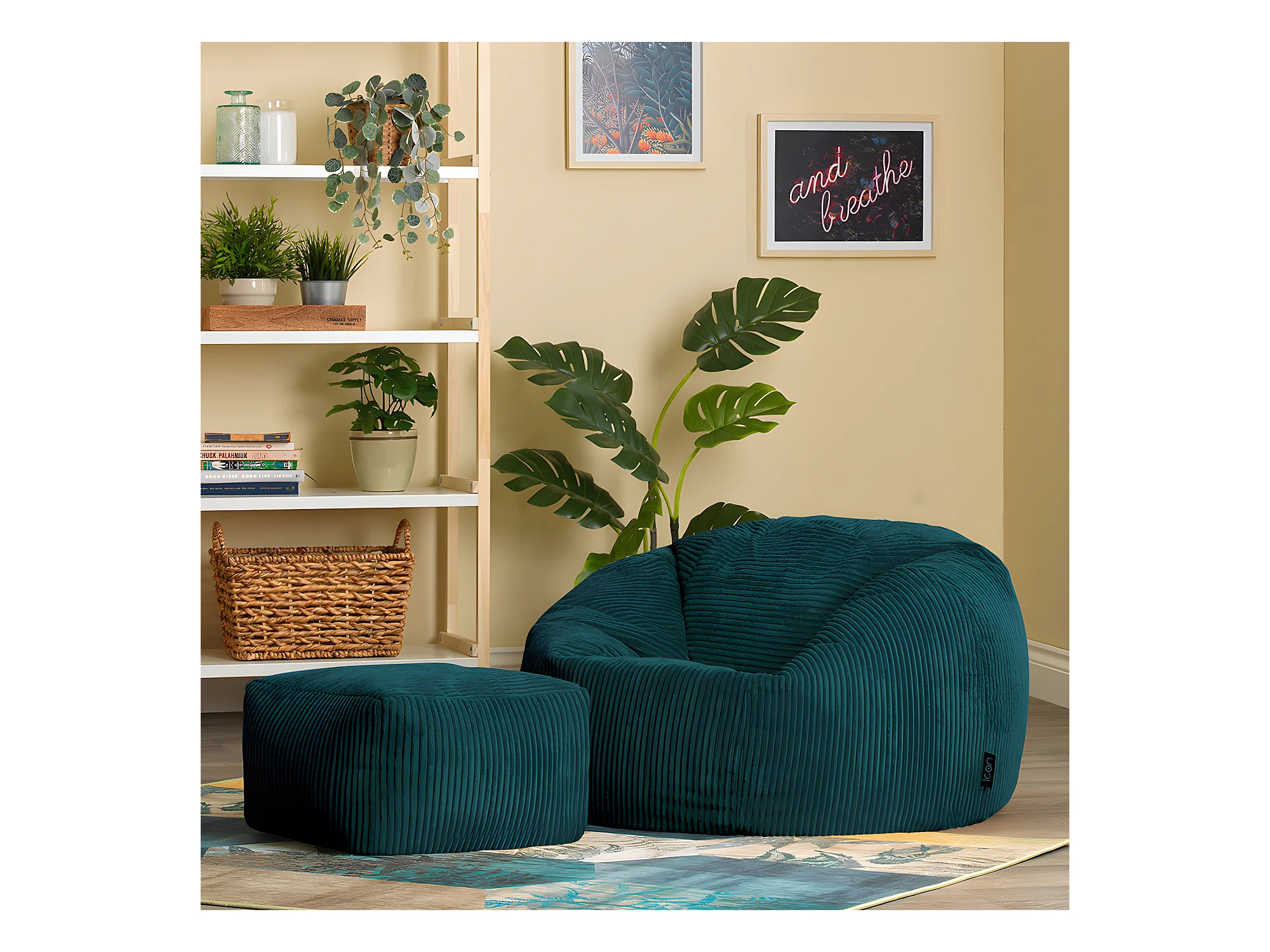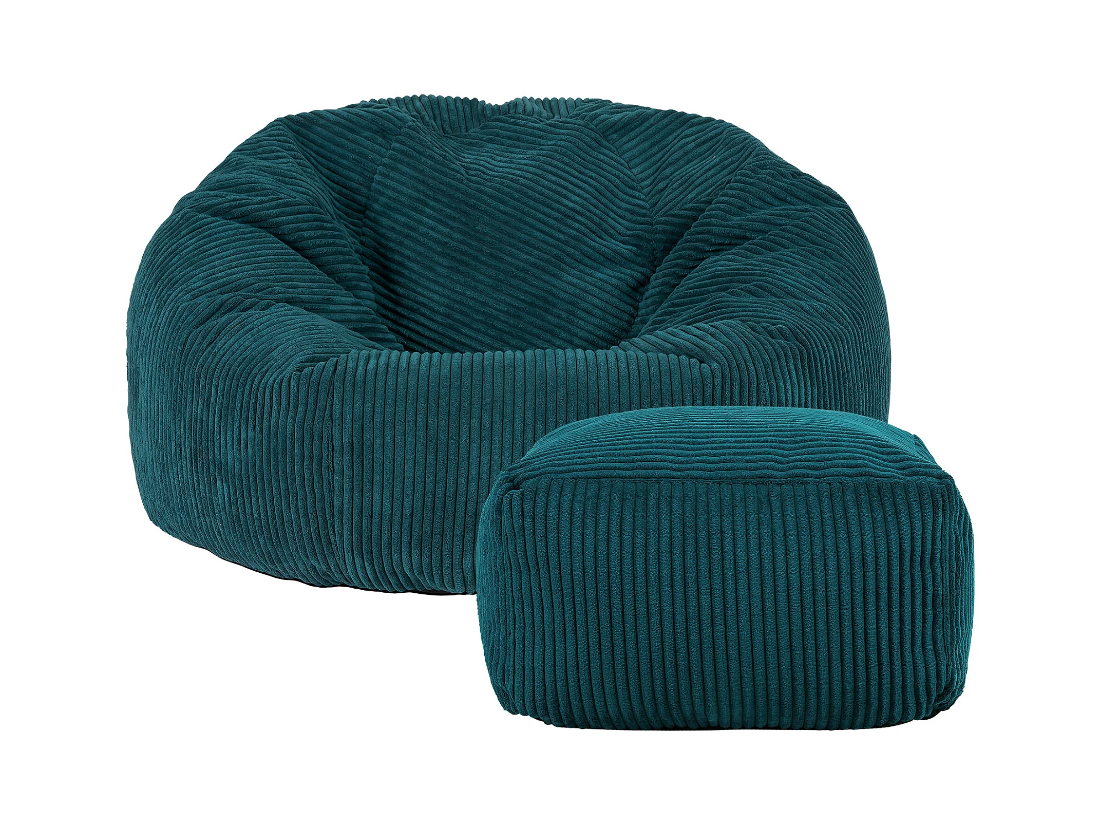 Pouf classique et son repose-pied velours côtelé, bleu canard - KINGSTON