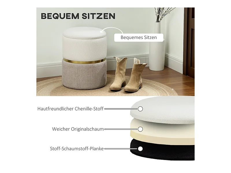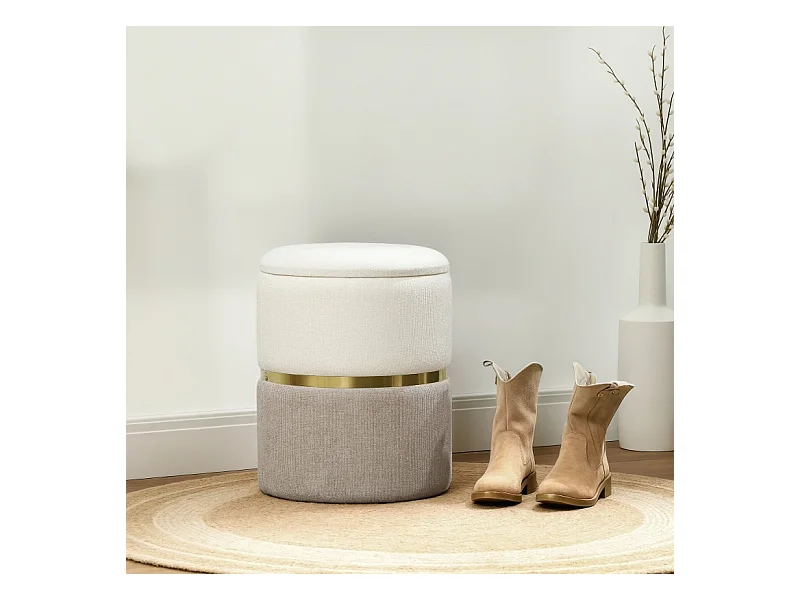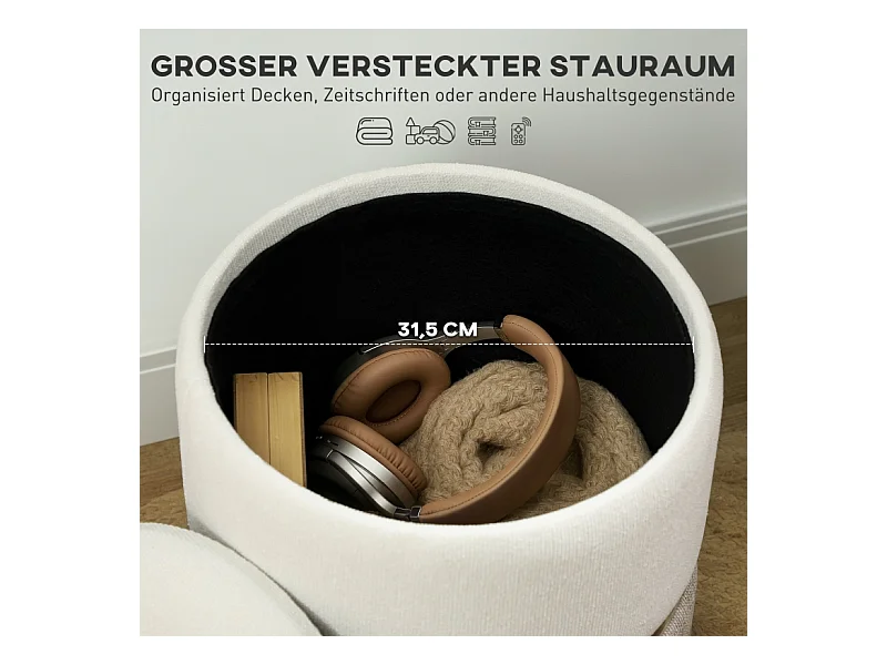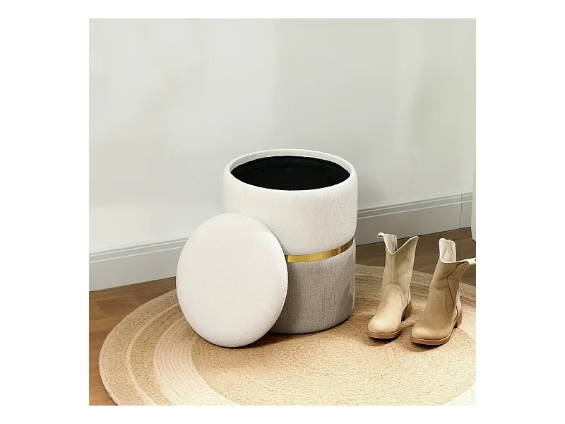 Pouf de rangement rond, tissu doux, bois massif, blanc (45x45x41 cm)