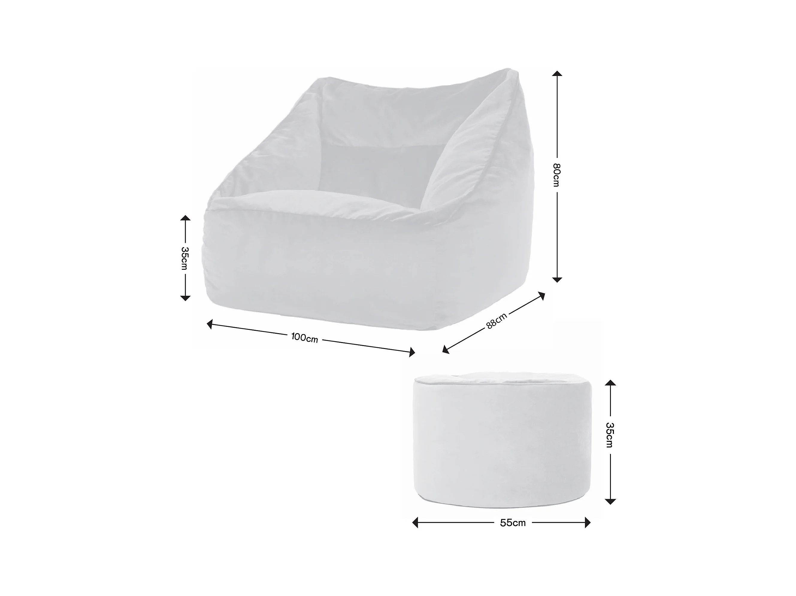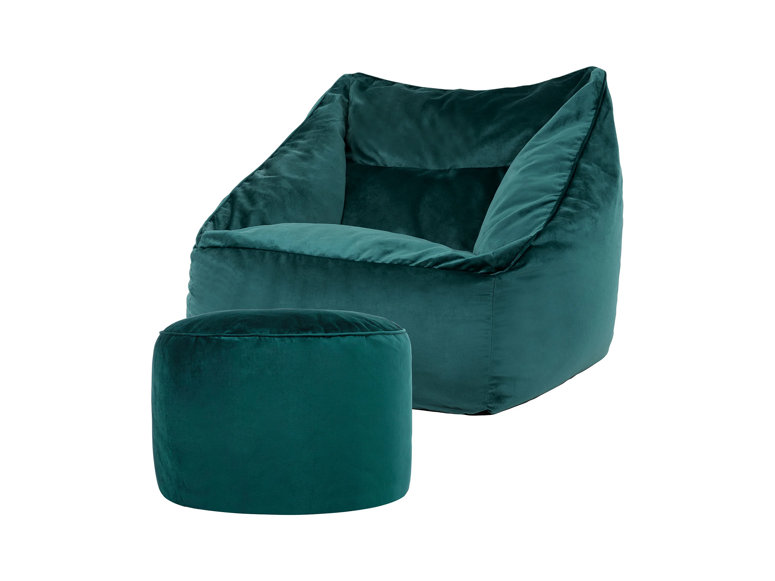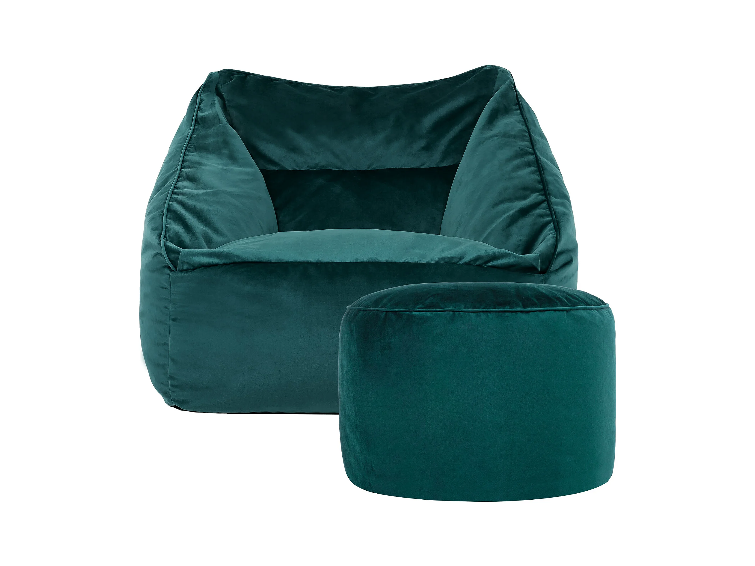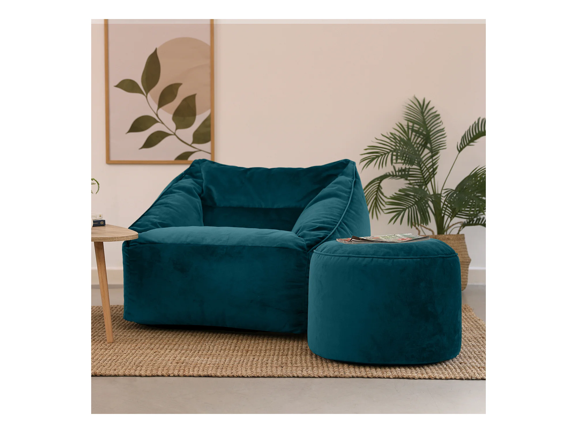 Pouf fauteuil avec repose-pied rond velours bleu canard - NATALIA