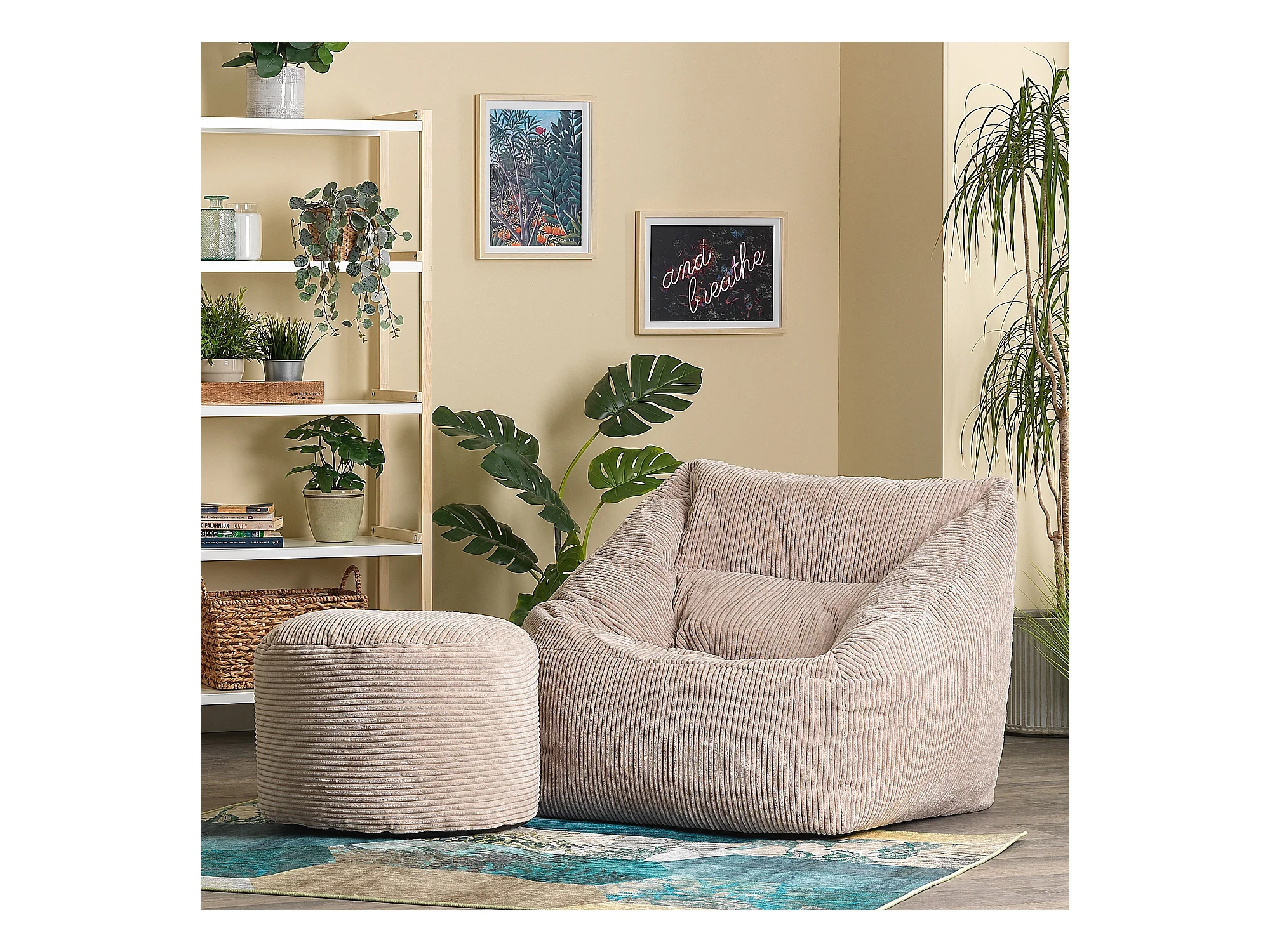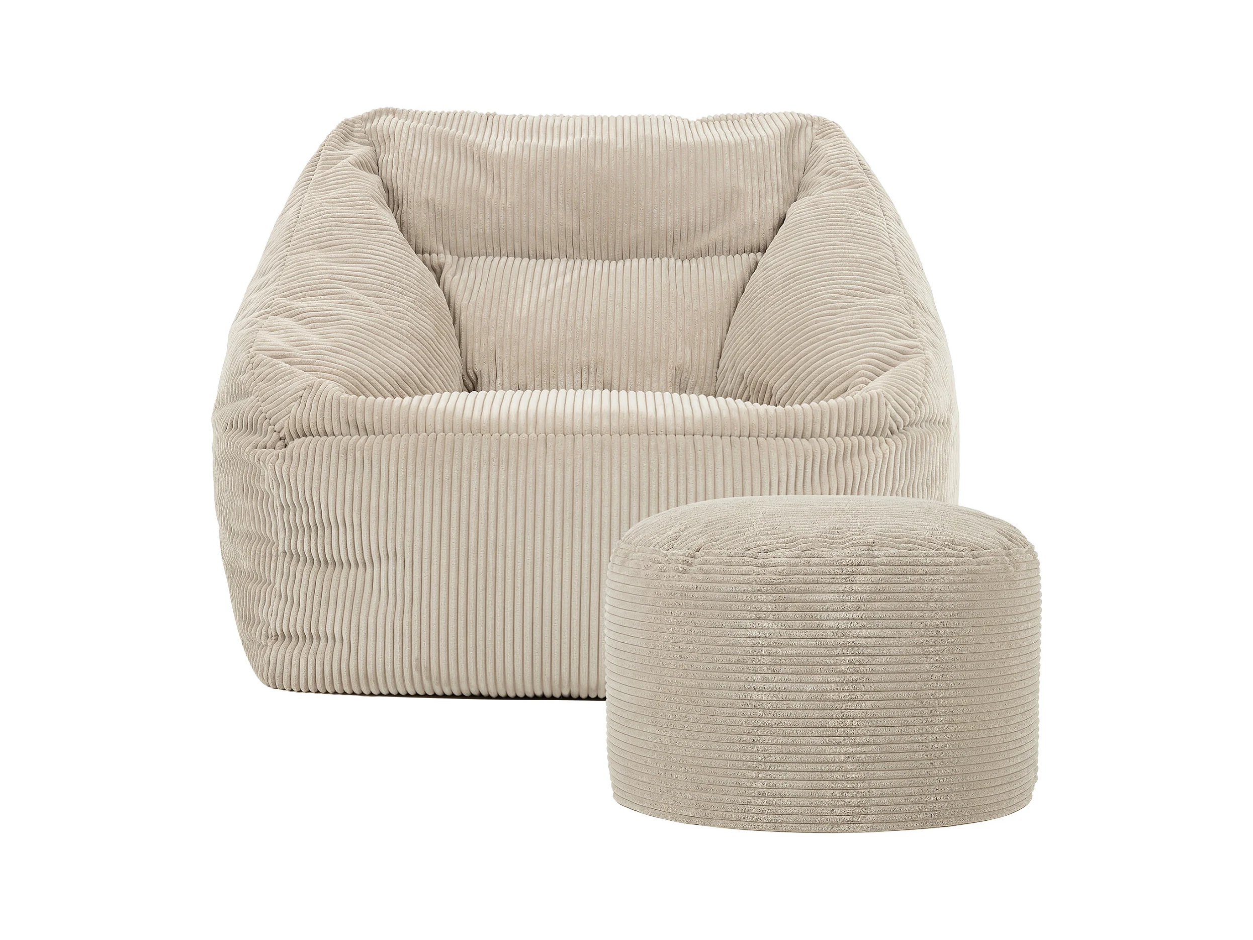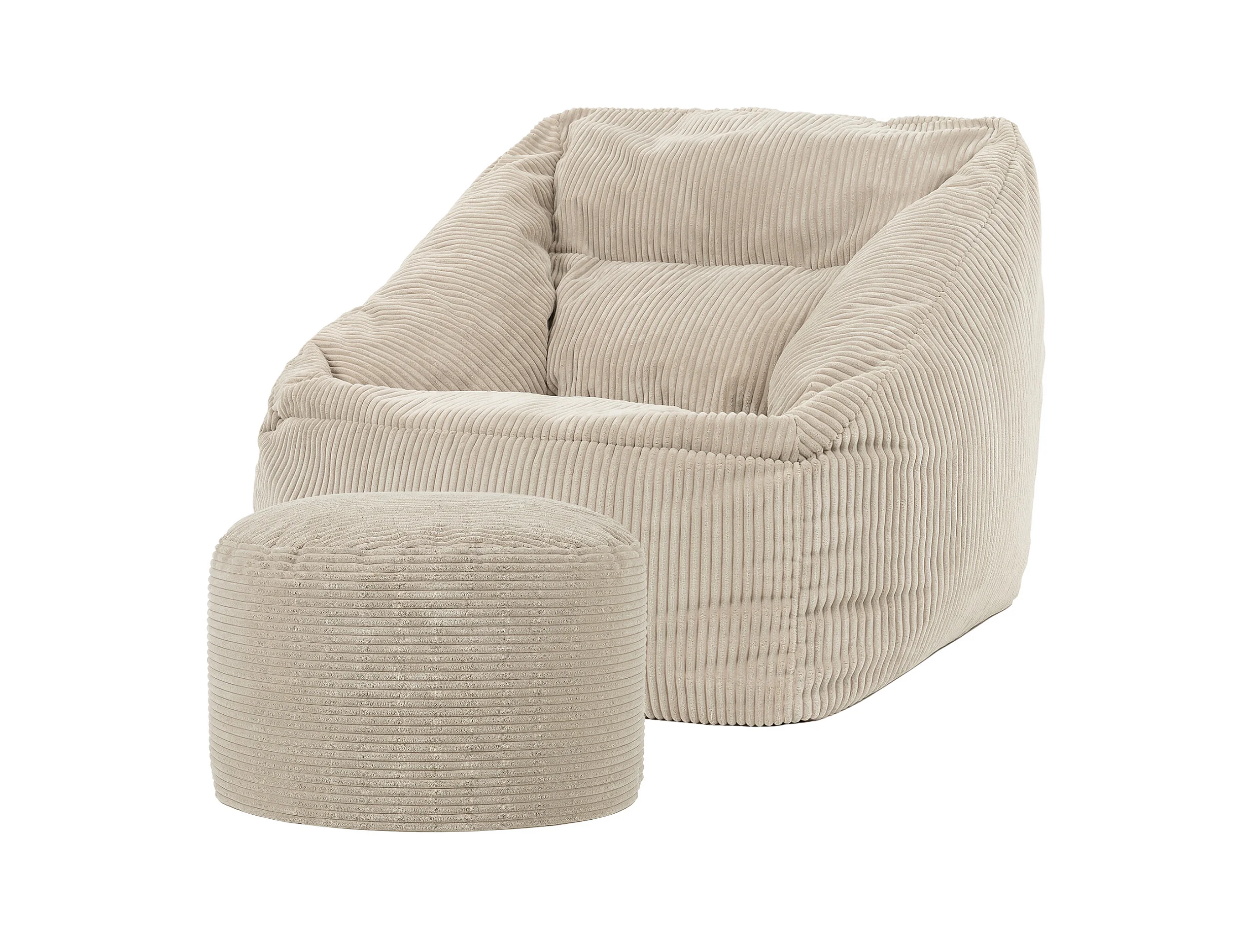 Pouf fauteuil avec repose-pied rond velours côtelé beige galet - MORGAN