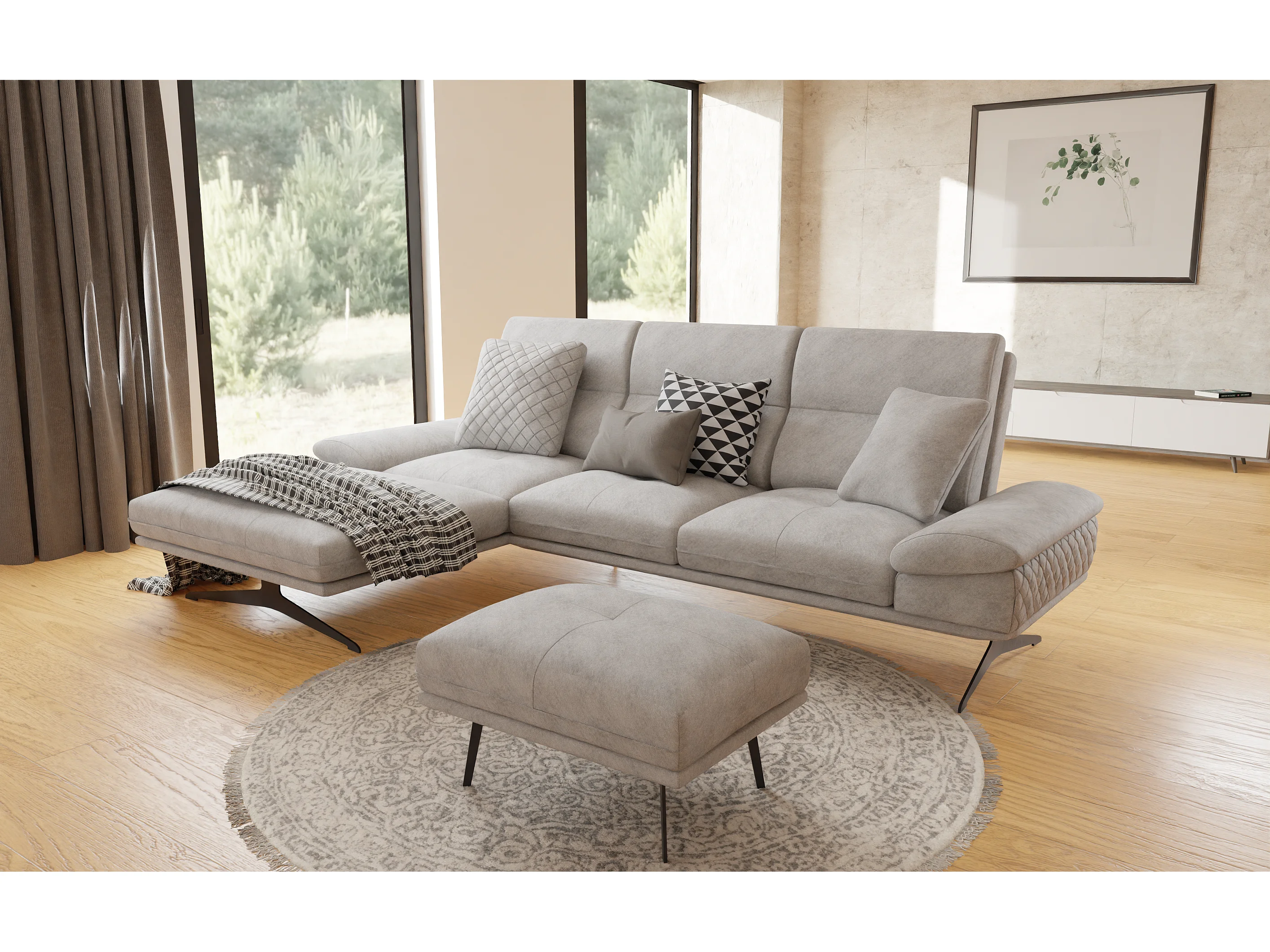 Pouf moderne avec hauts pieds en métal noir, en tissu velours gris clair Haga
