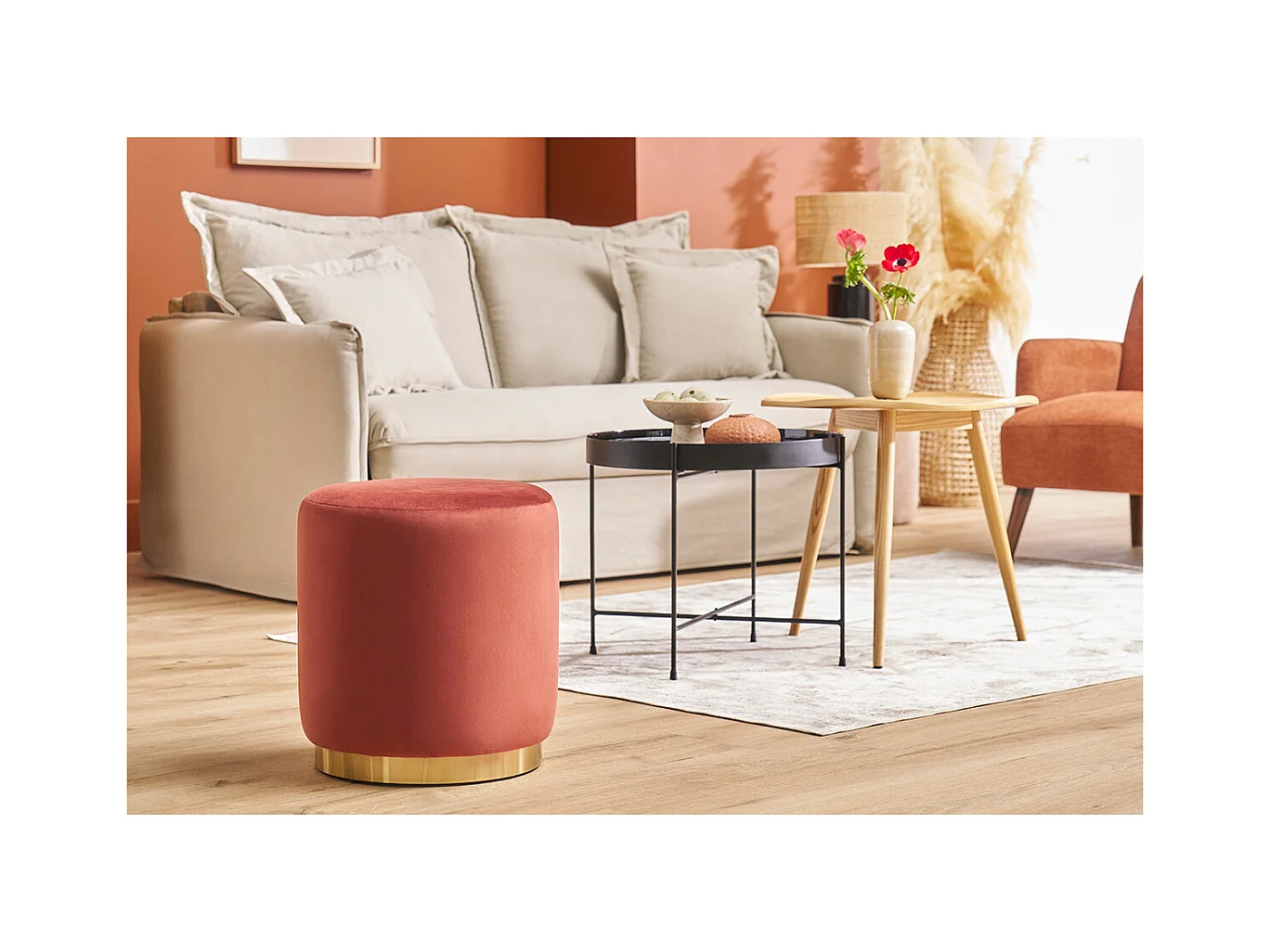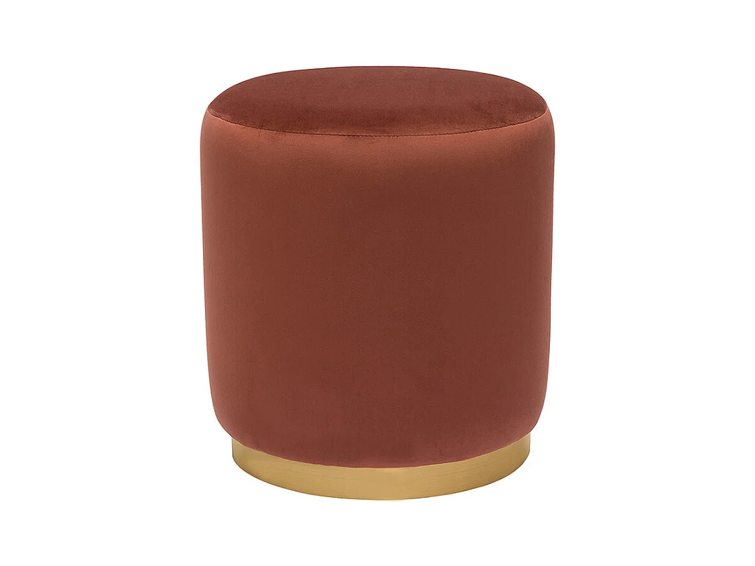 Pouf rond en velours rouge tomette et métal doré D40 cm AMAYA