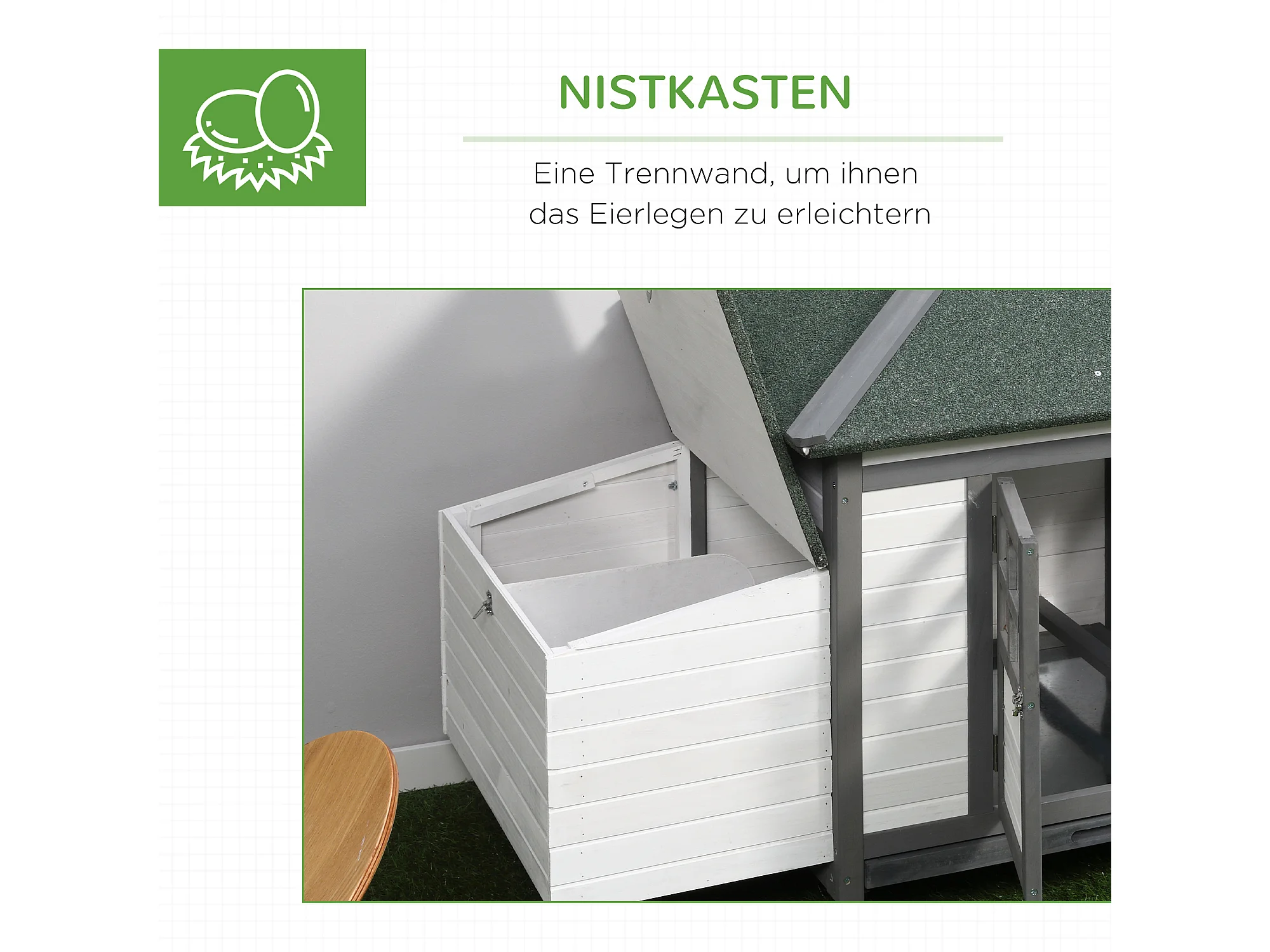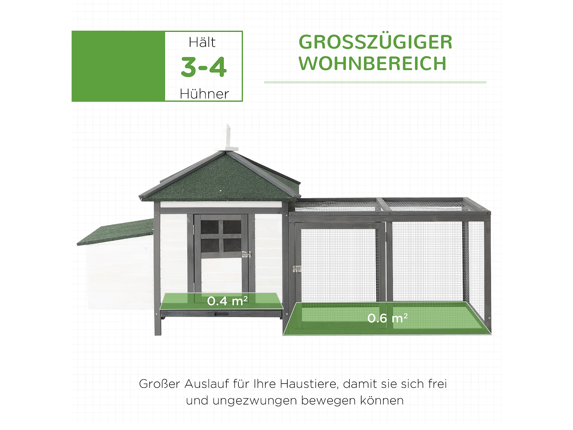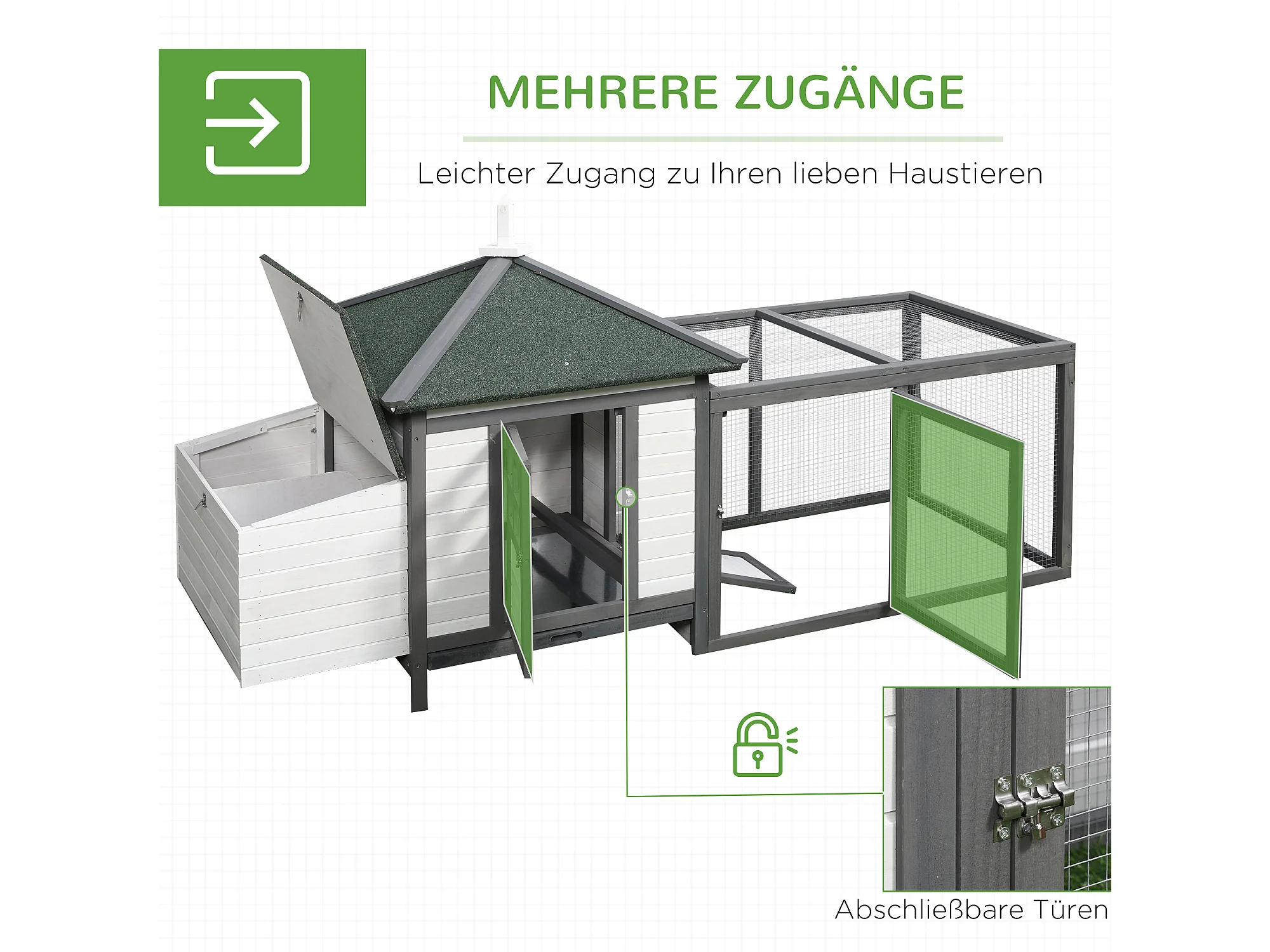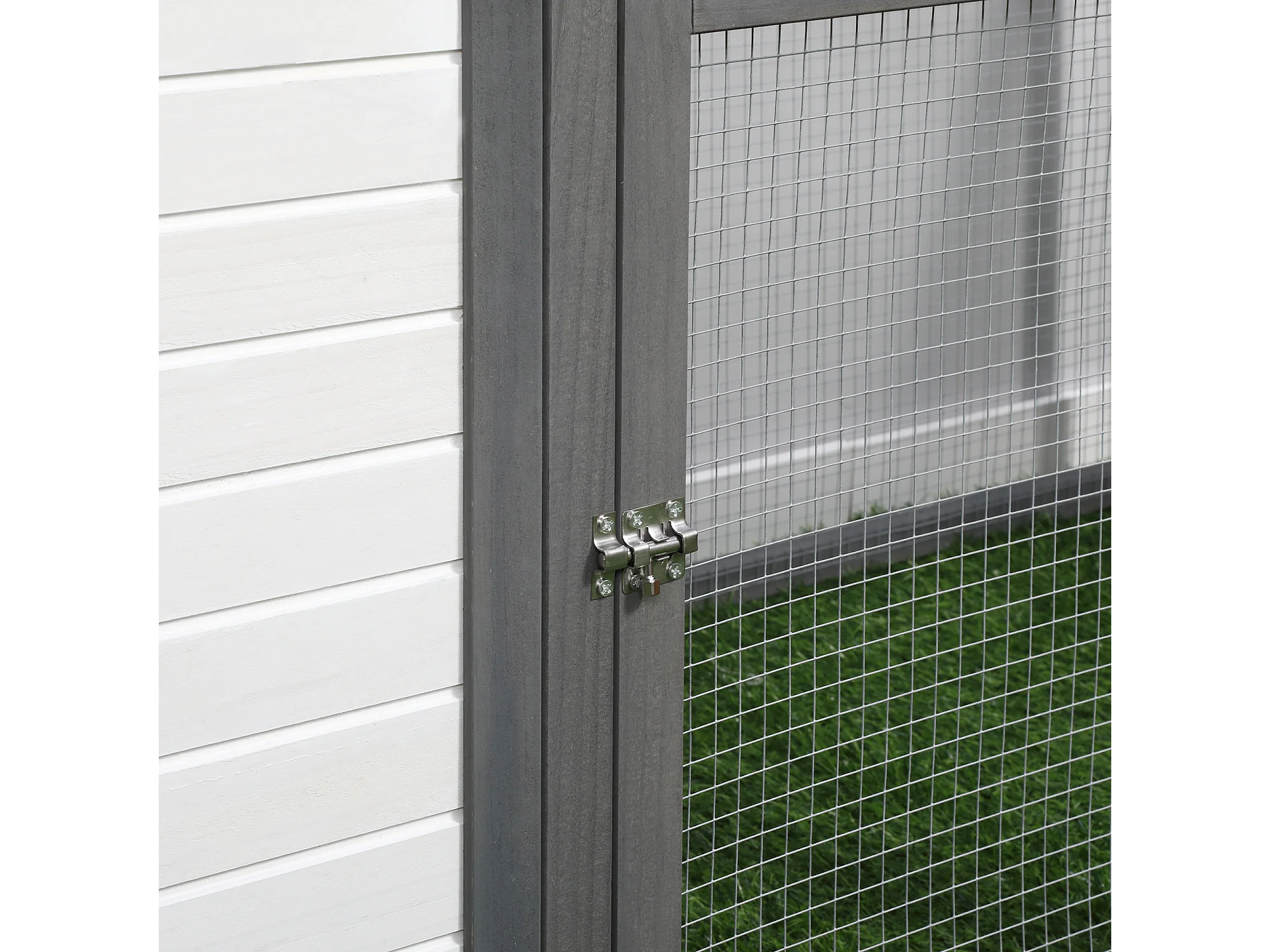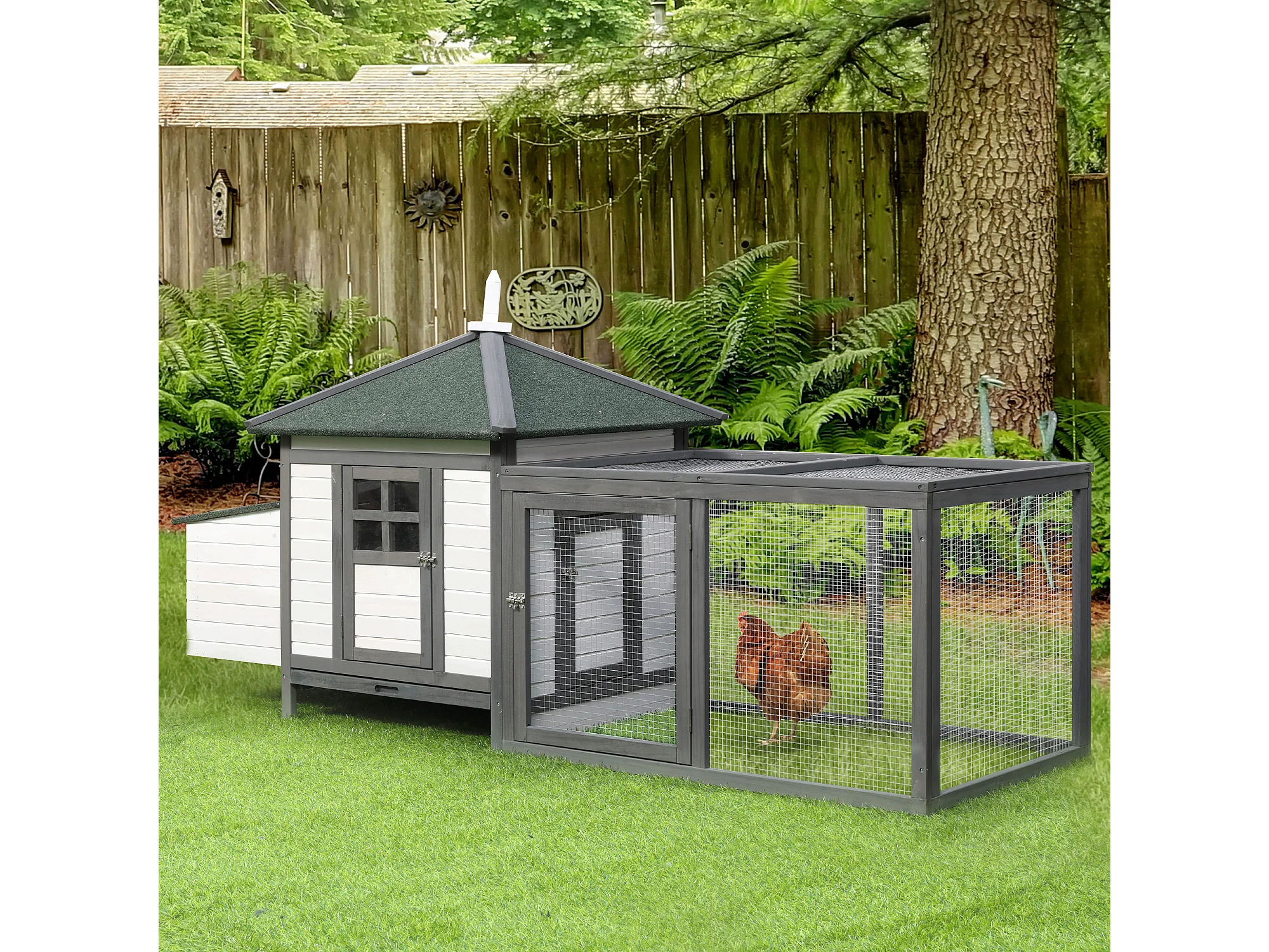 Poulailler nain avec enclos, résistant à l'hiver, en pin, gris et blanc, perchoirs et nichoir inclus (196x76x97cm)